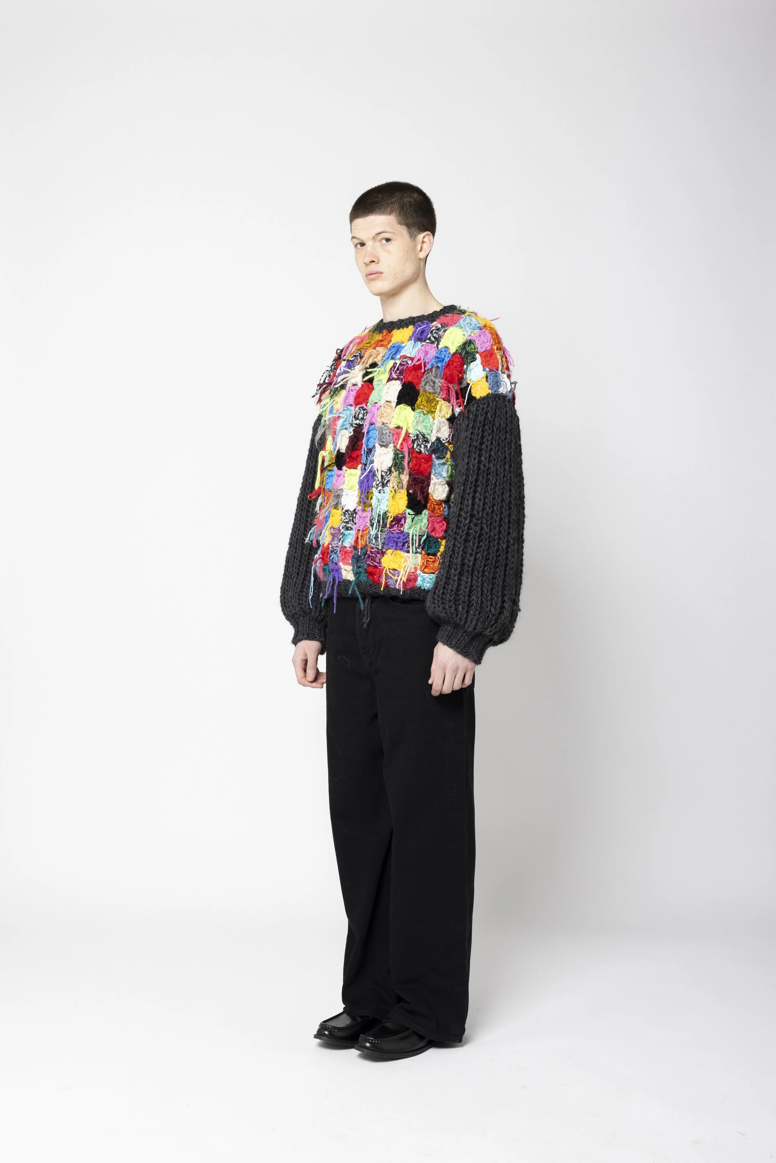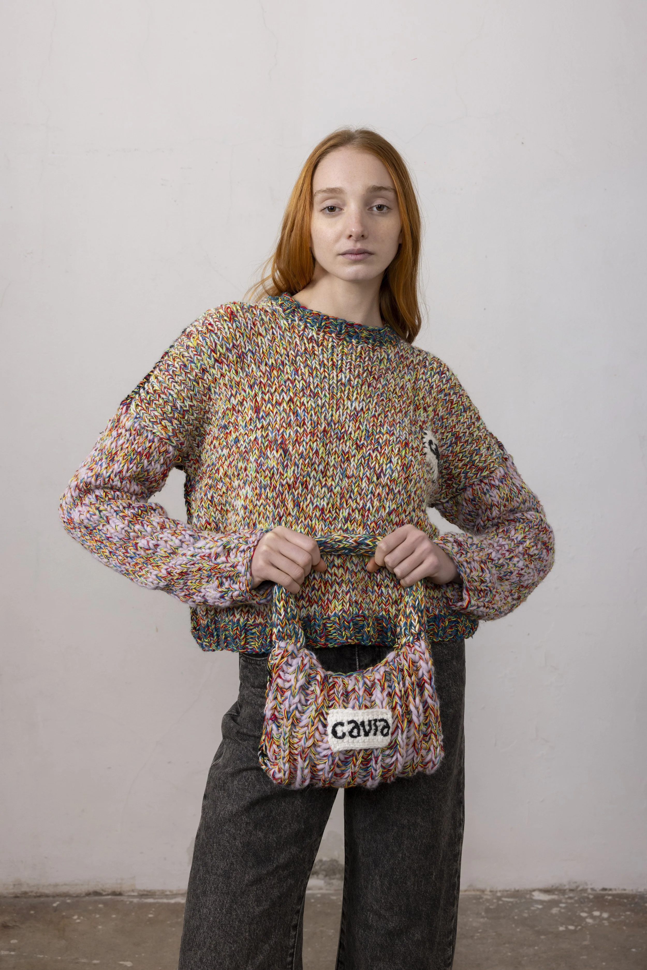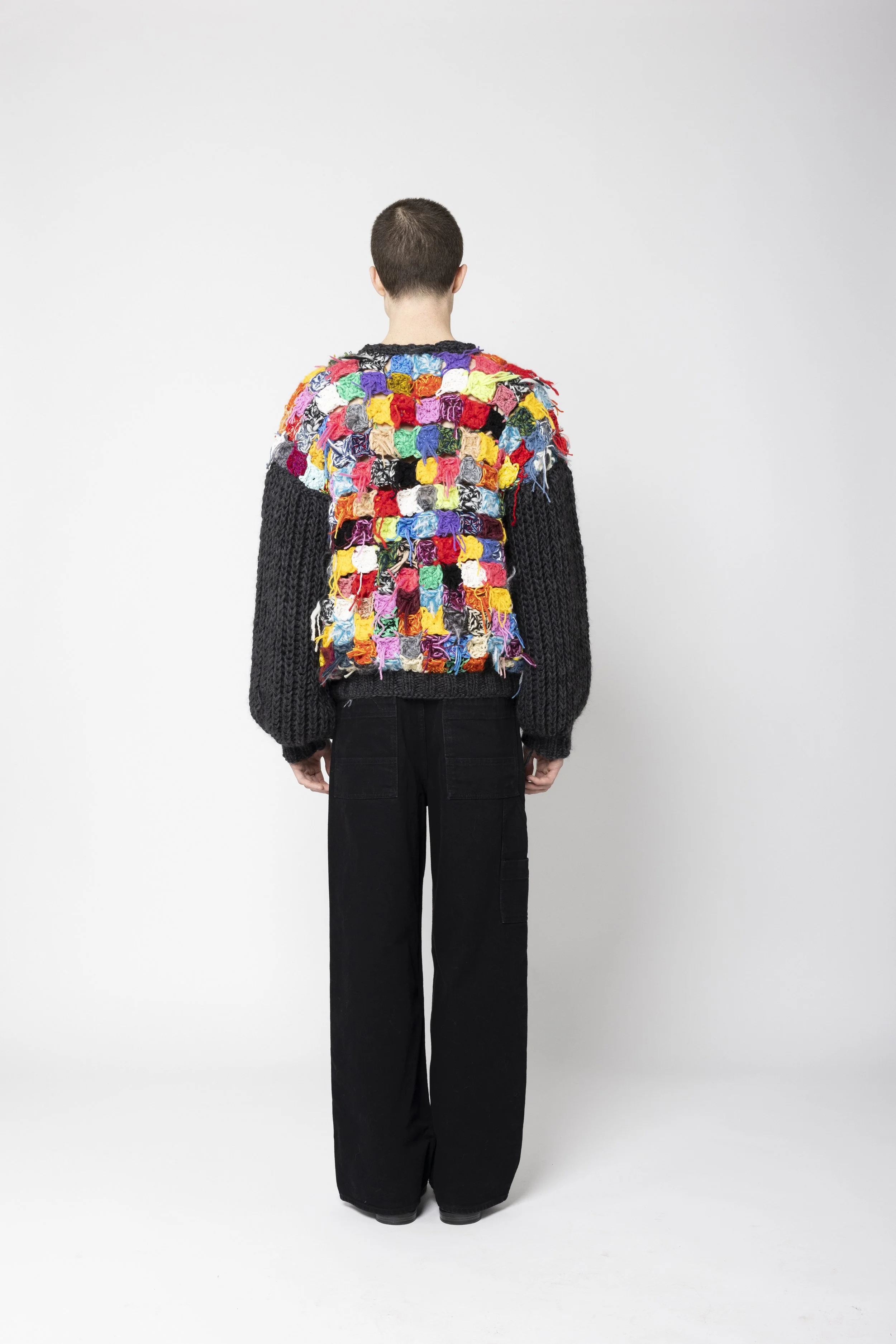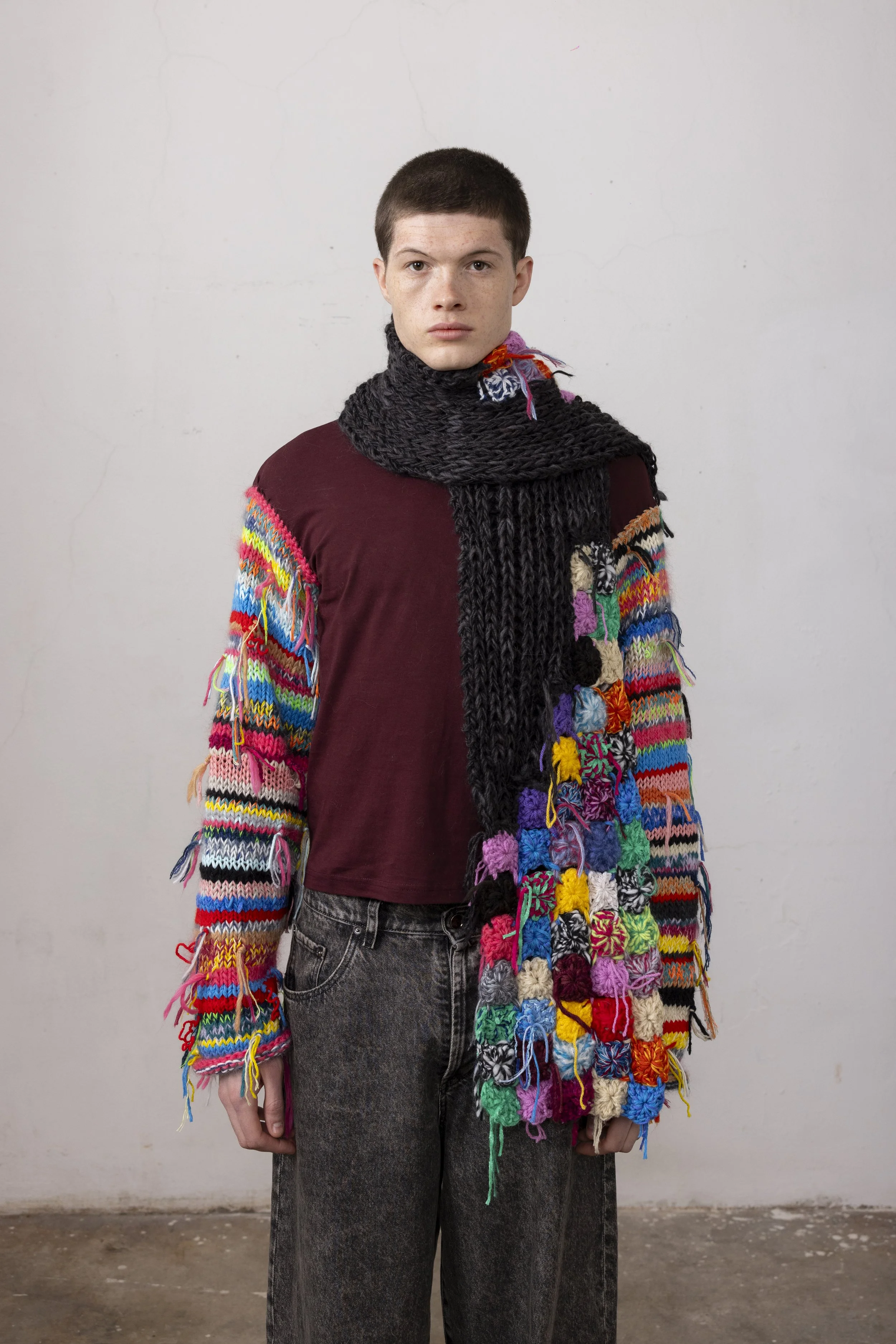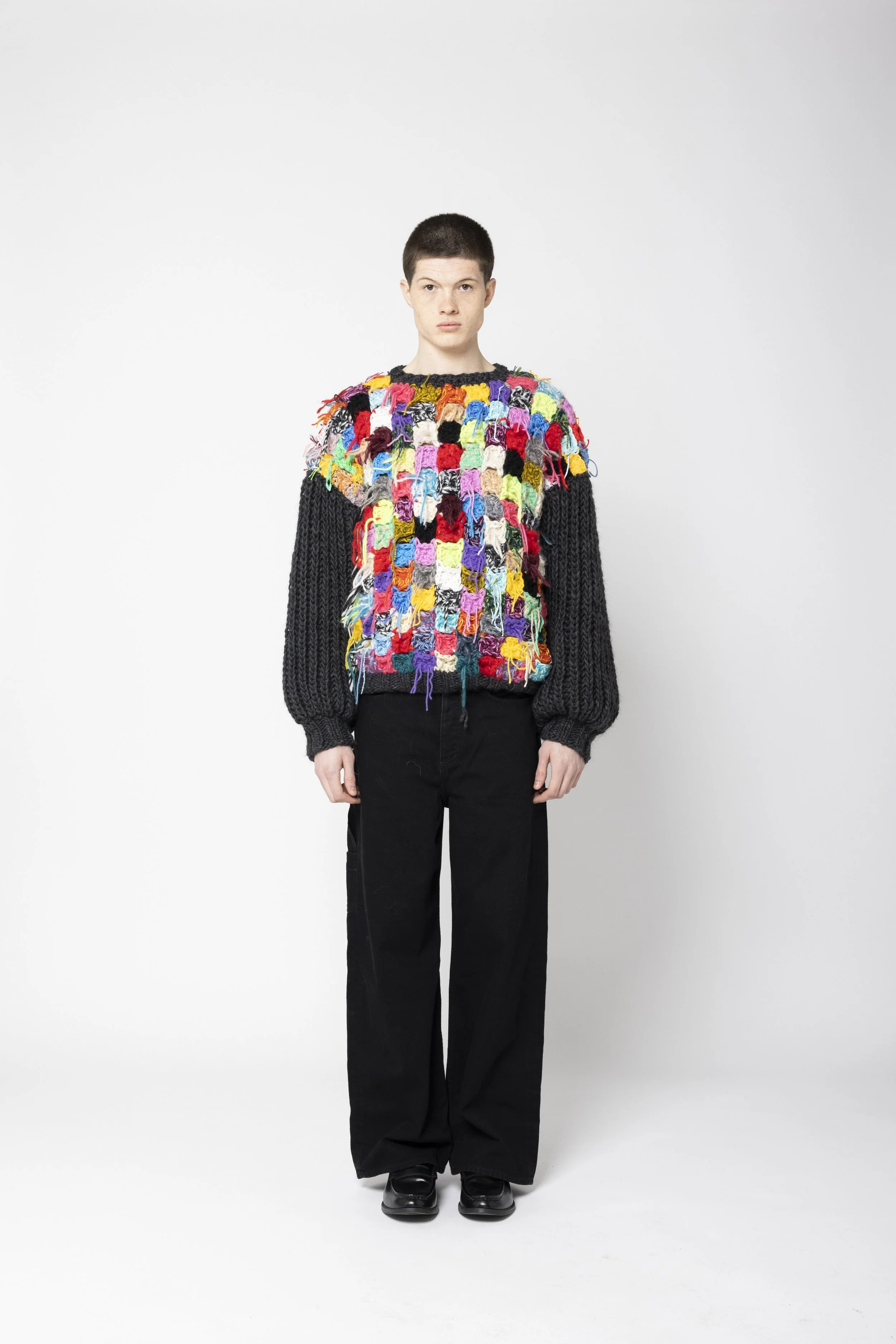 All the knitwear is handmade, the knot is the way we assemble the excess of the yarns we upcycled for creating multicolor patterns. The patchwork items are hand assembled with upcycled vintage clothes, and all the embroidery details in the collection are hand made crochet.