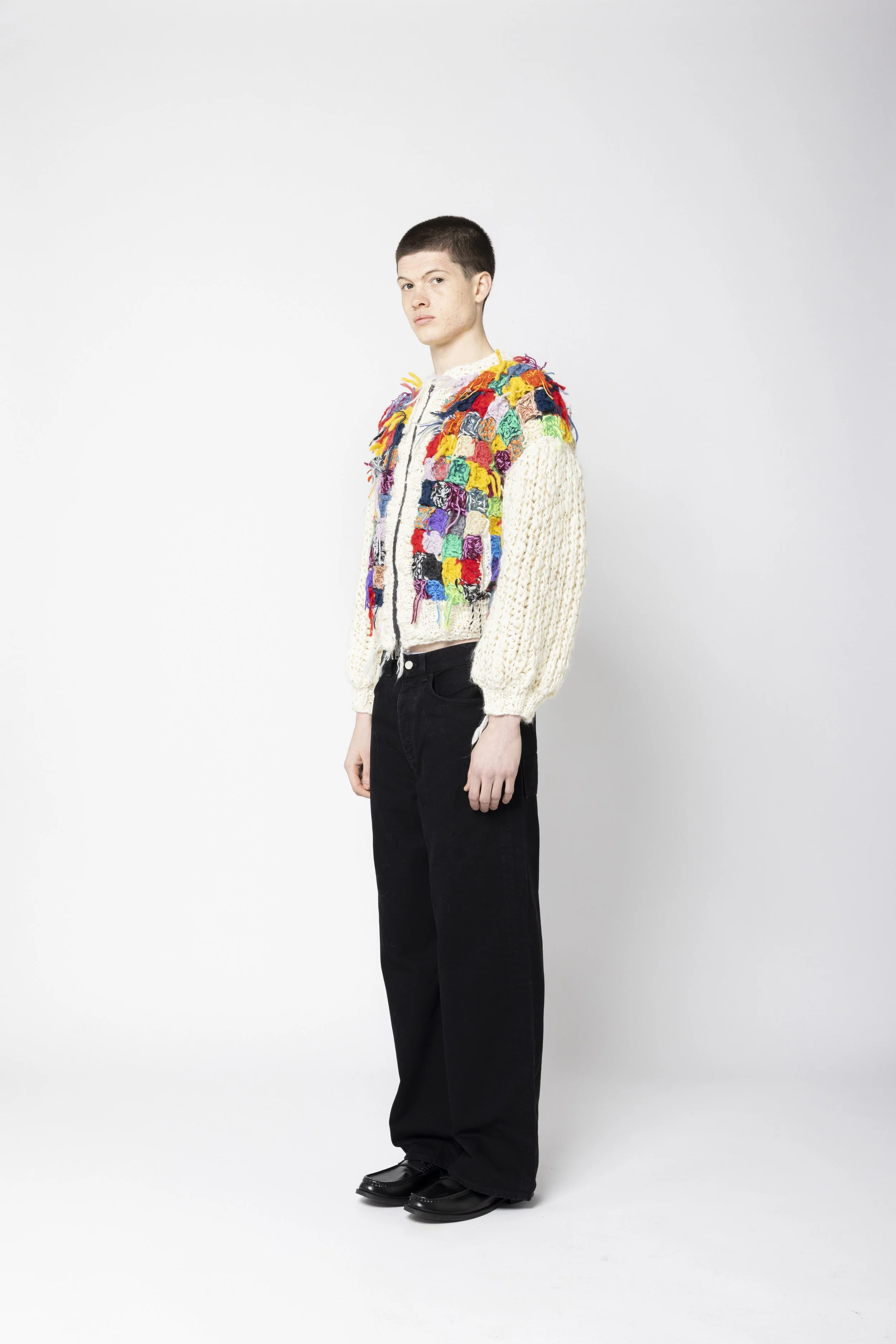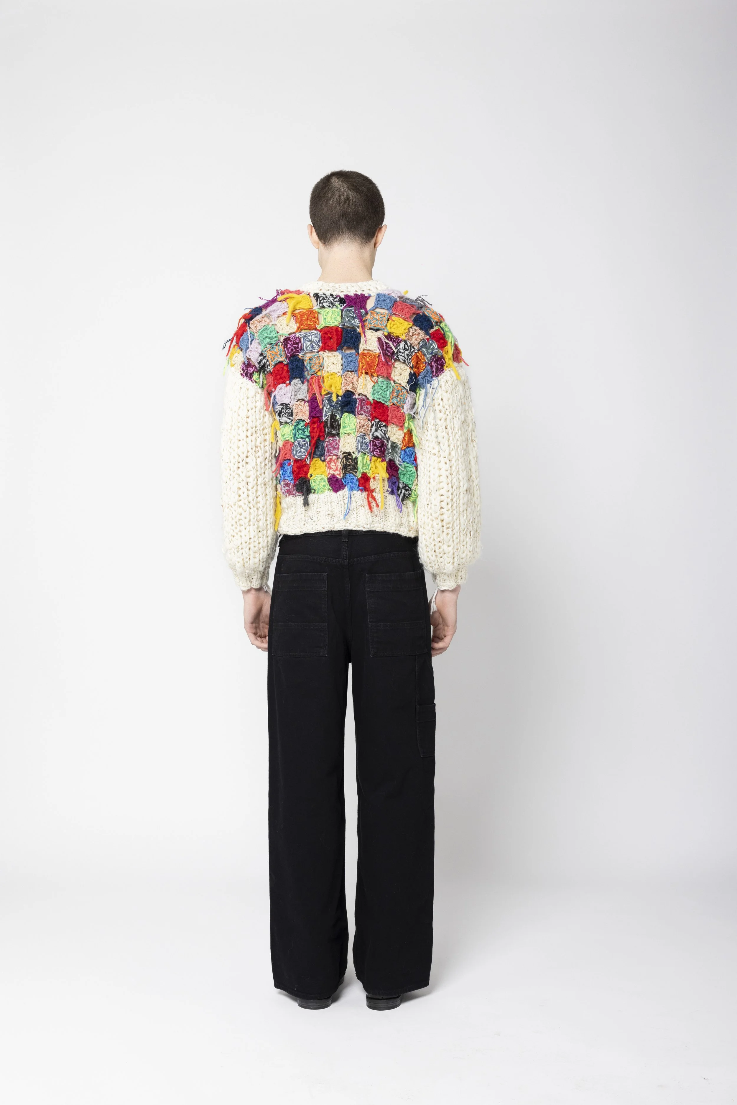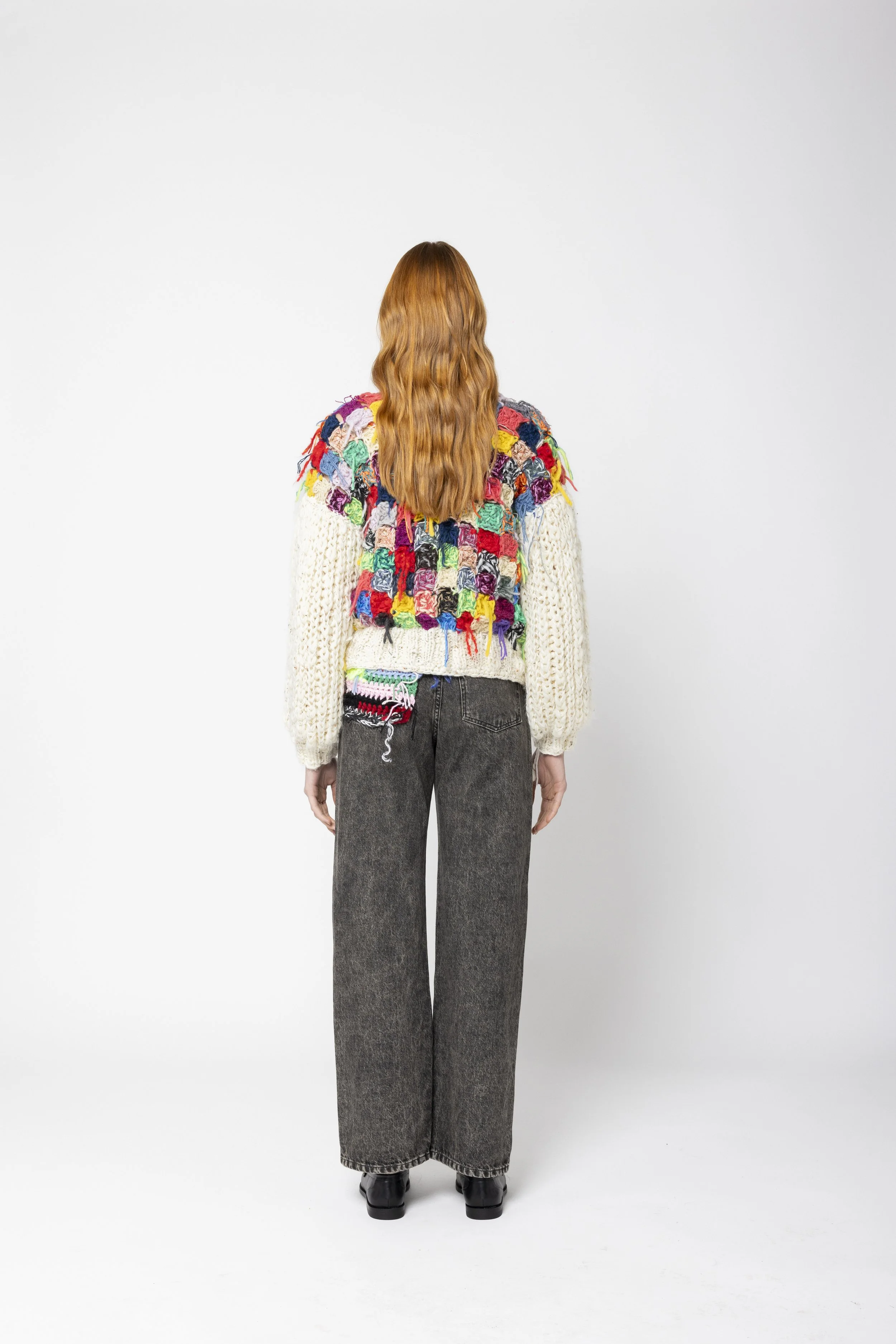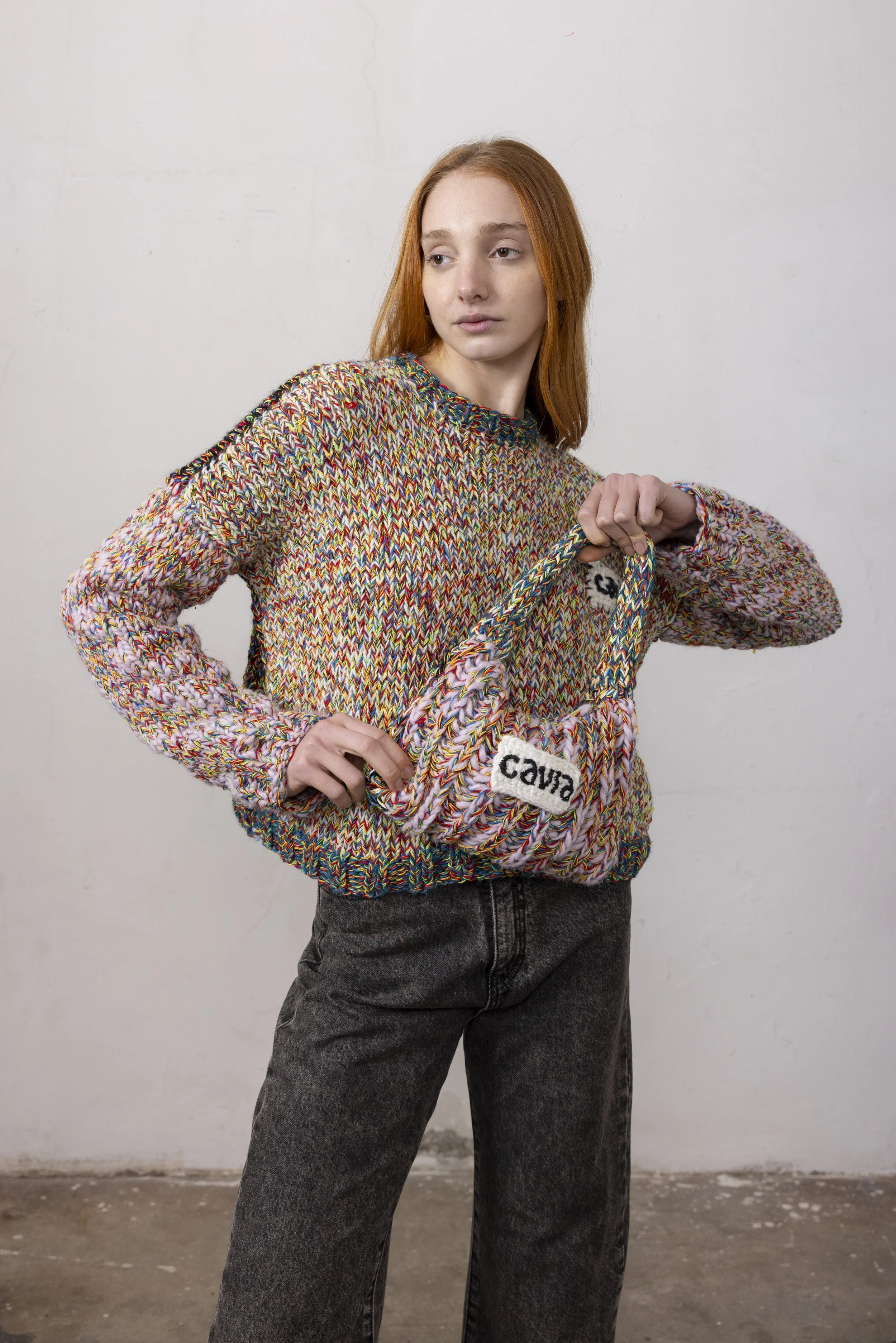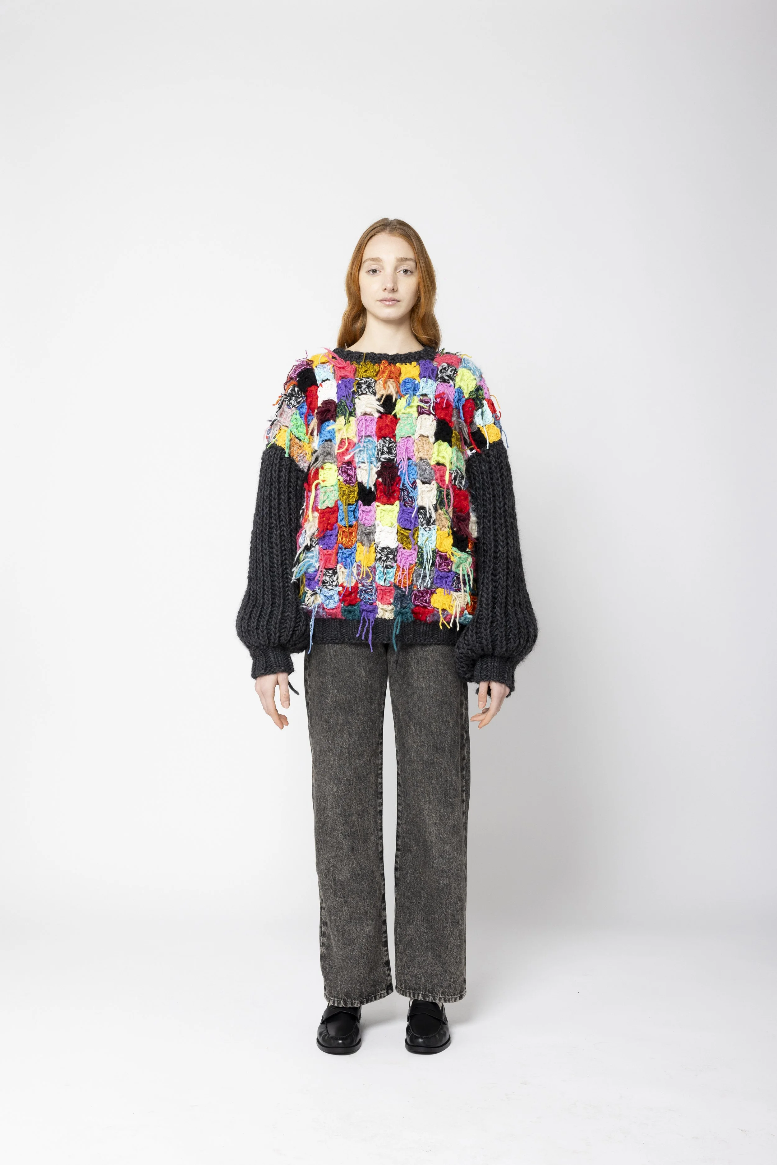 All the knitwear is handmade, the knot is the way we assemble the excess of the yarns we upcycled for creating multicolor patterns. The patchwork items are hand assembled with upcycled vintage clothes, and all the embroidery details in the collection are hand made crochet.