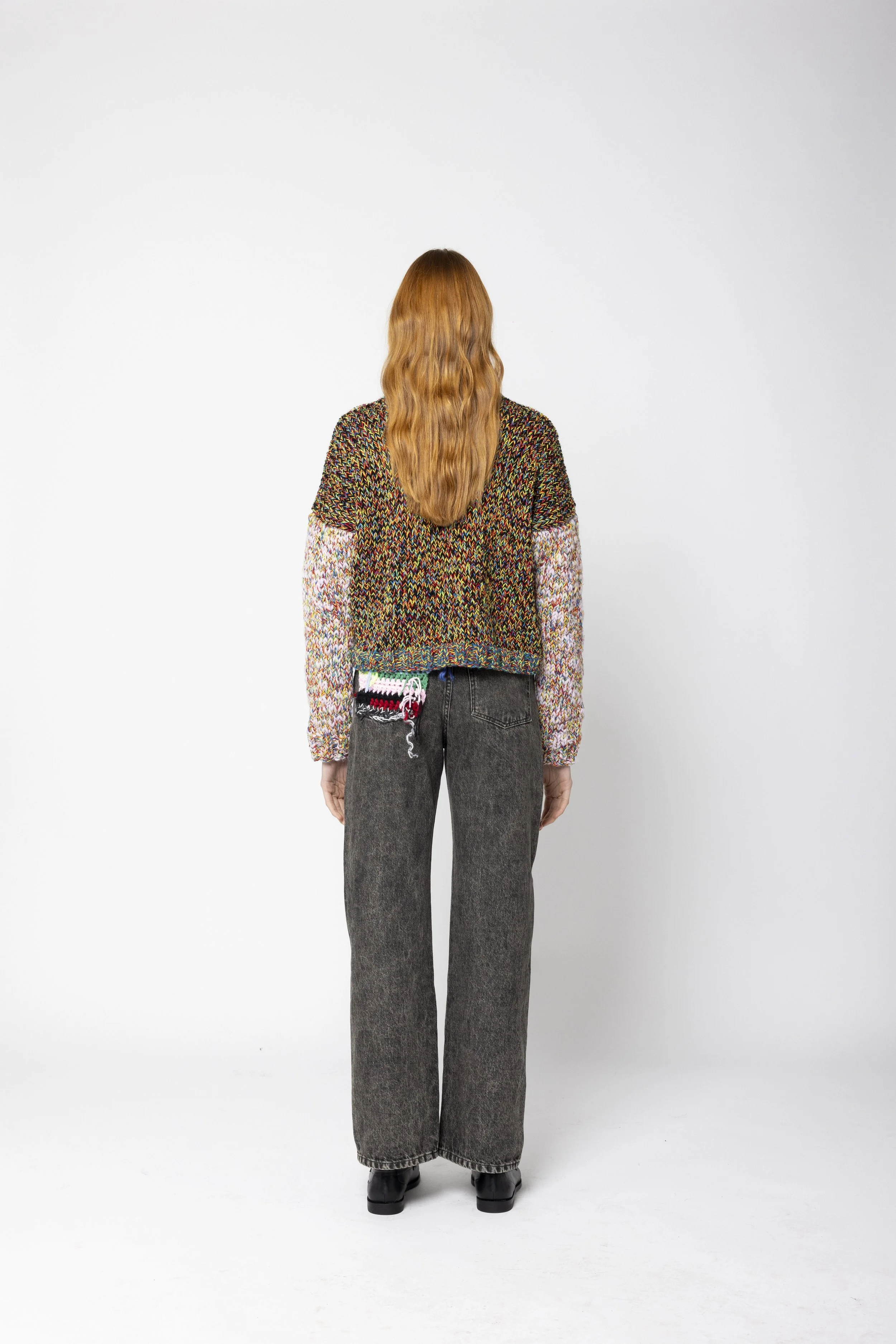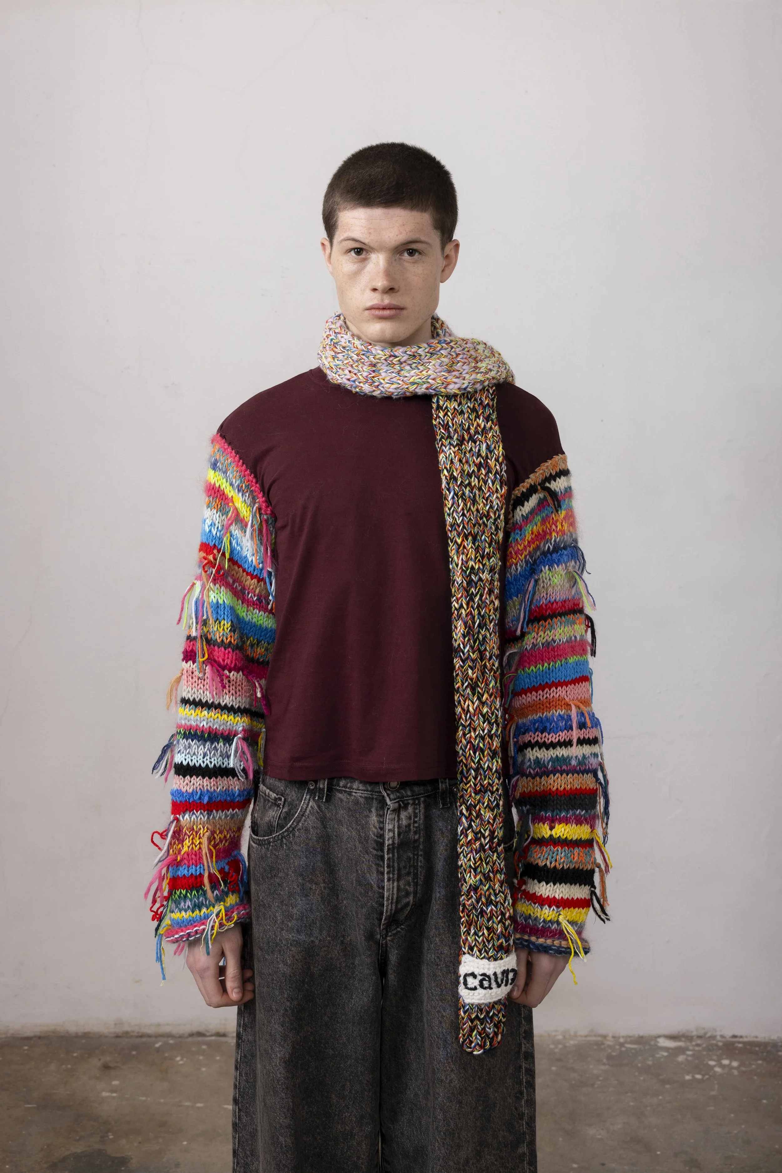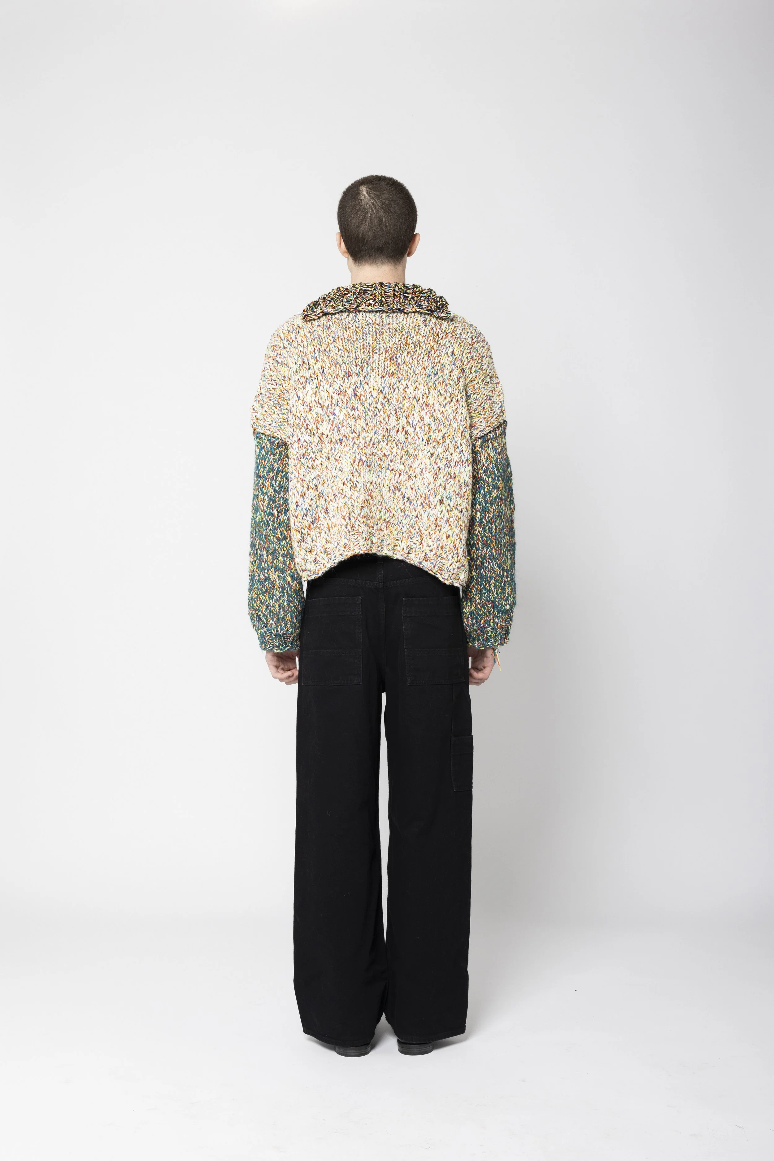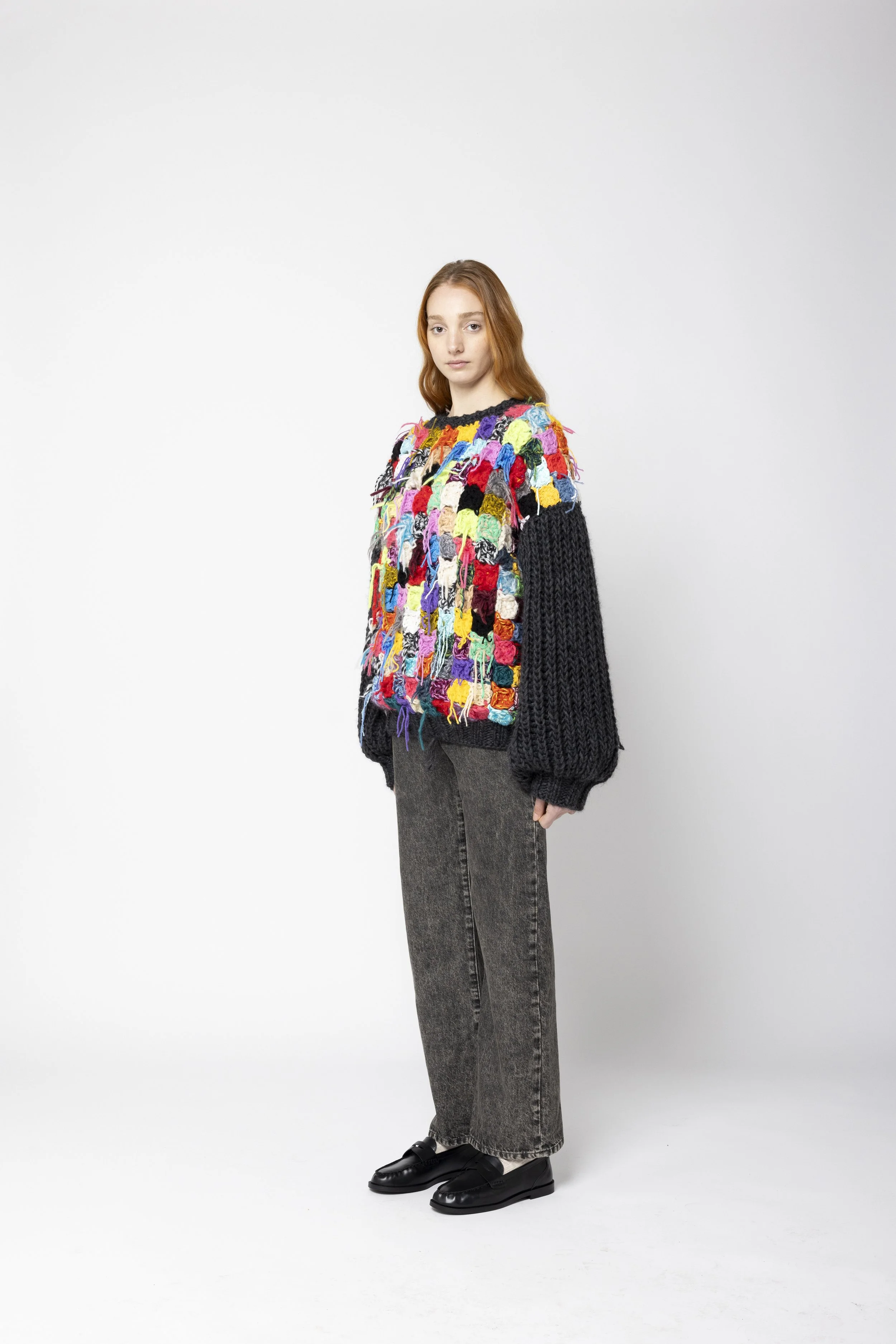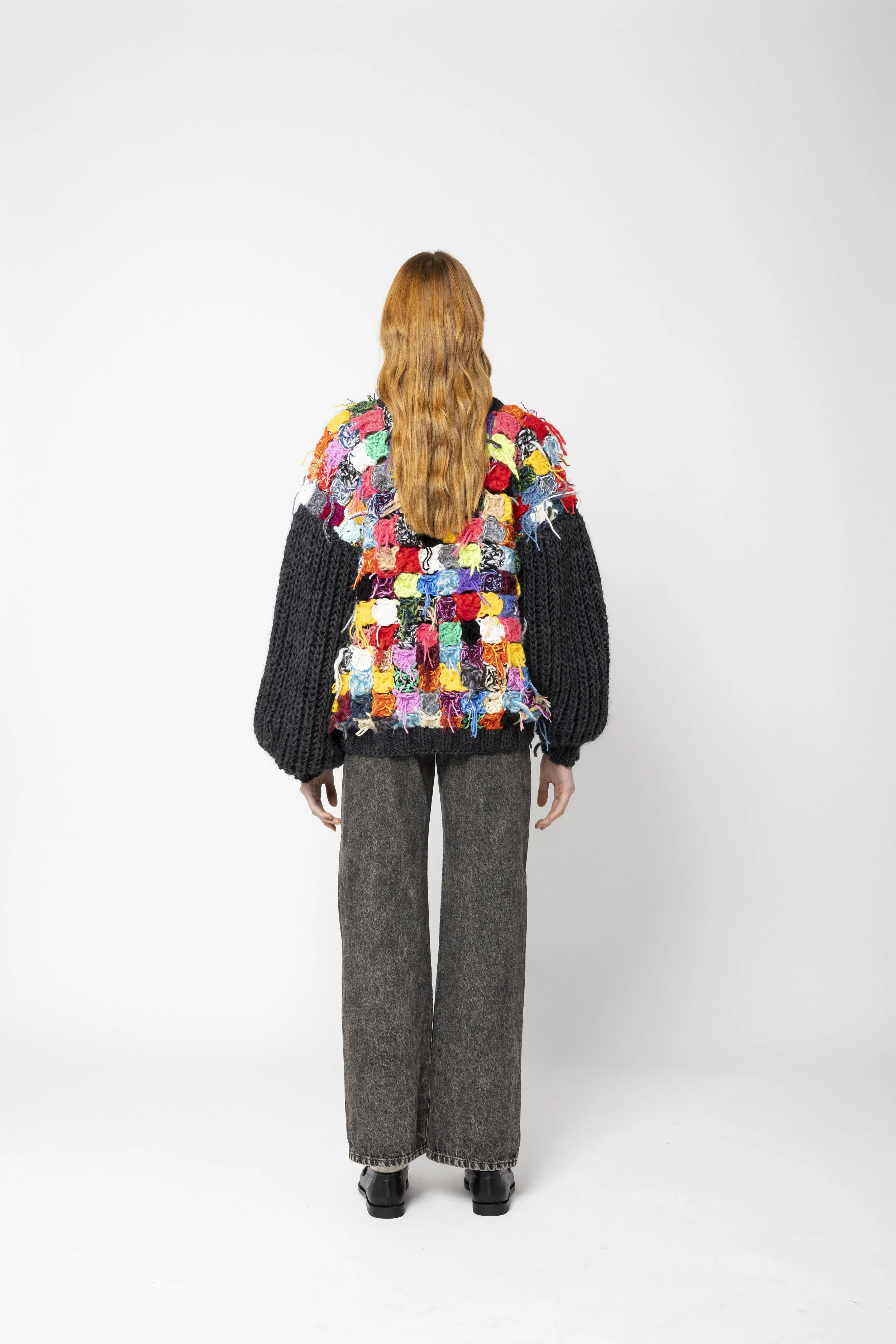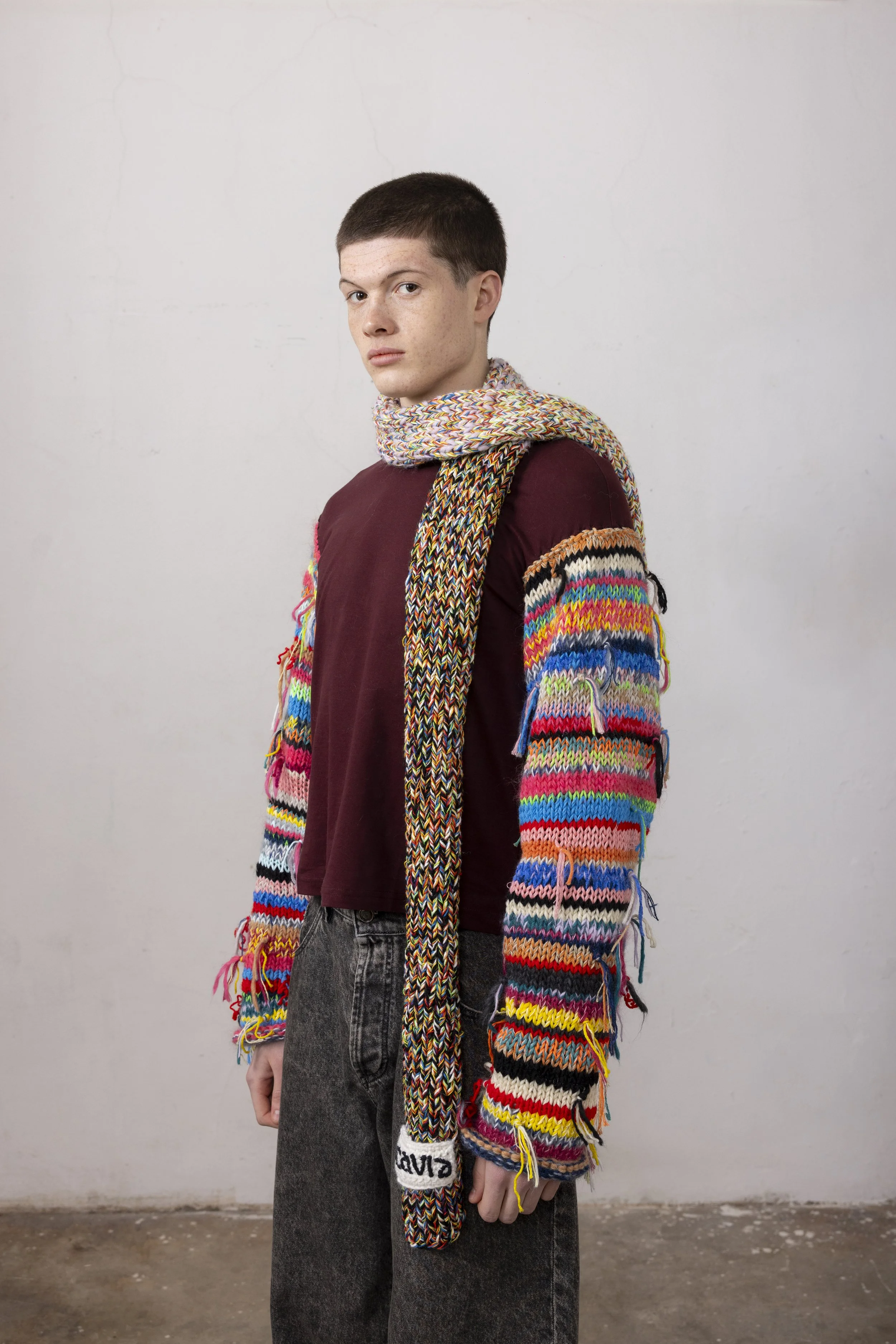 All the knitwear is handmade, the knot is the way we assemble the excess of the yarns we upcycled for creating multicolor patterns. The patchwork items are hand assembled with upcycled vintage clothes, and all the embroidery details in the collection are hand made crochet.