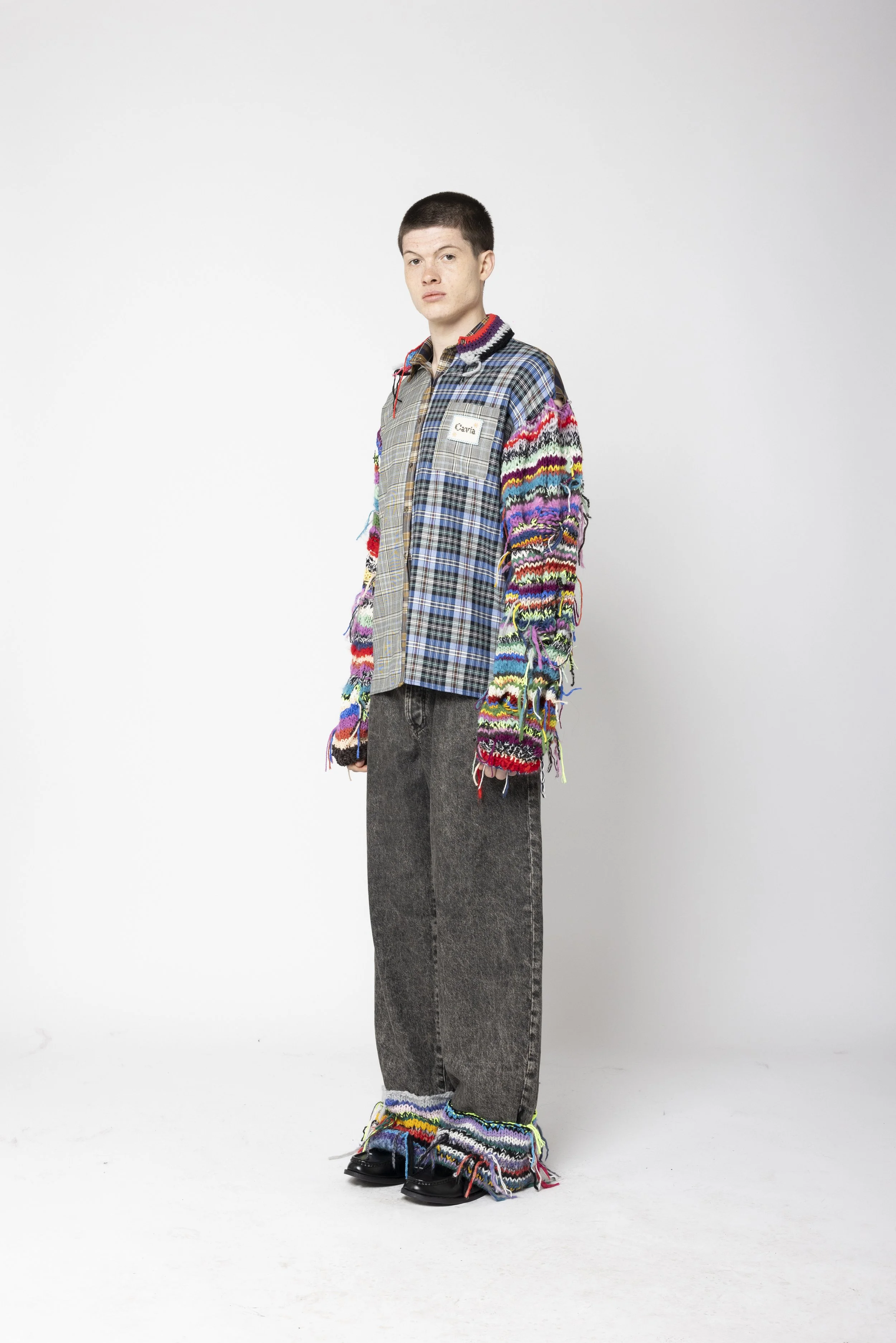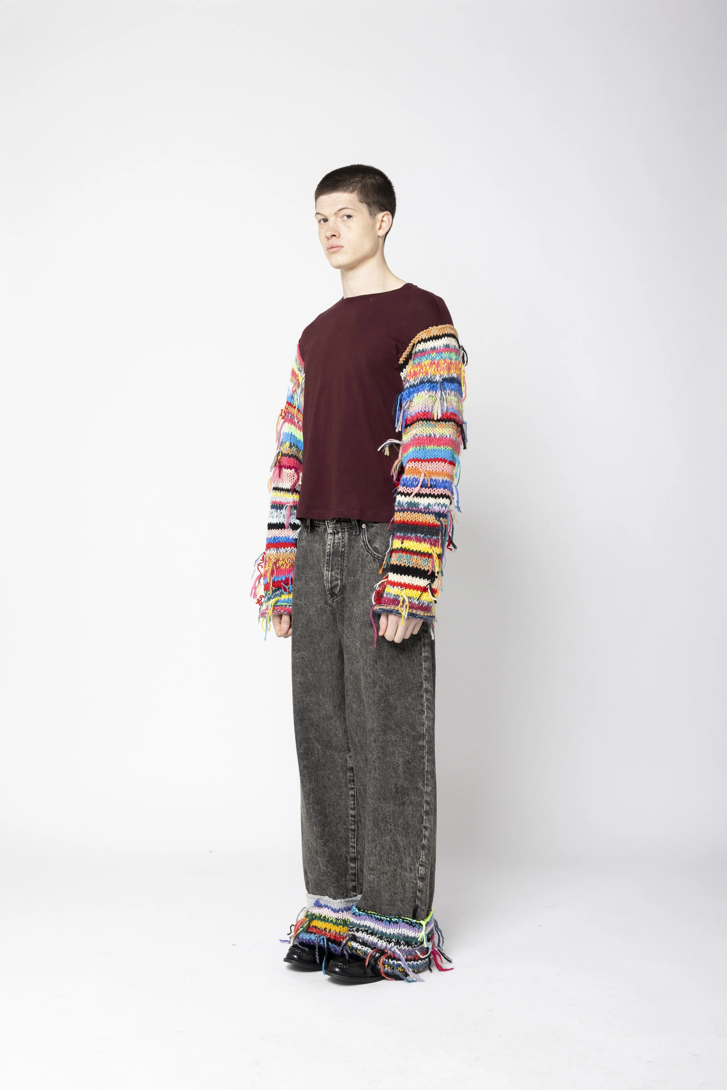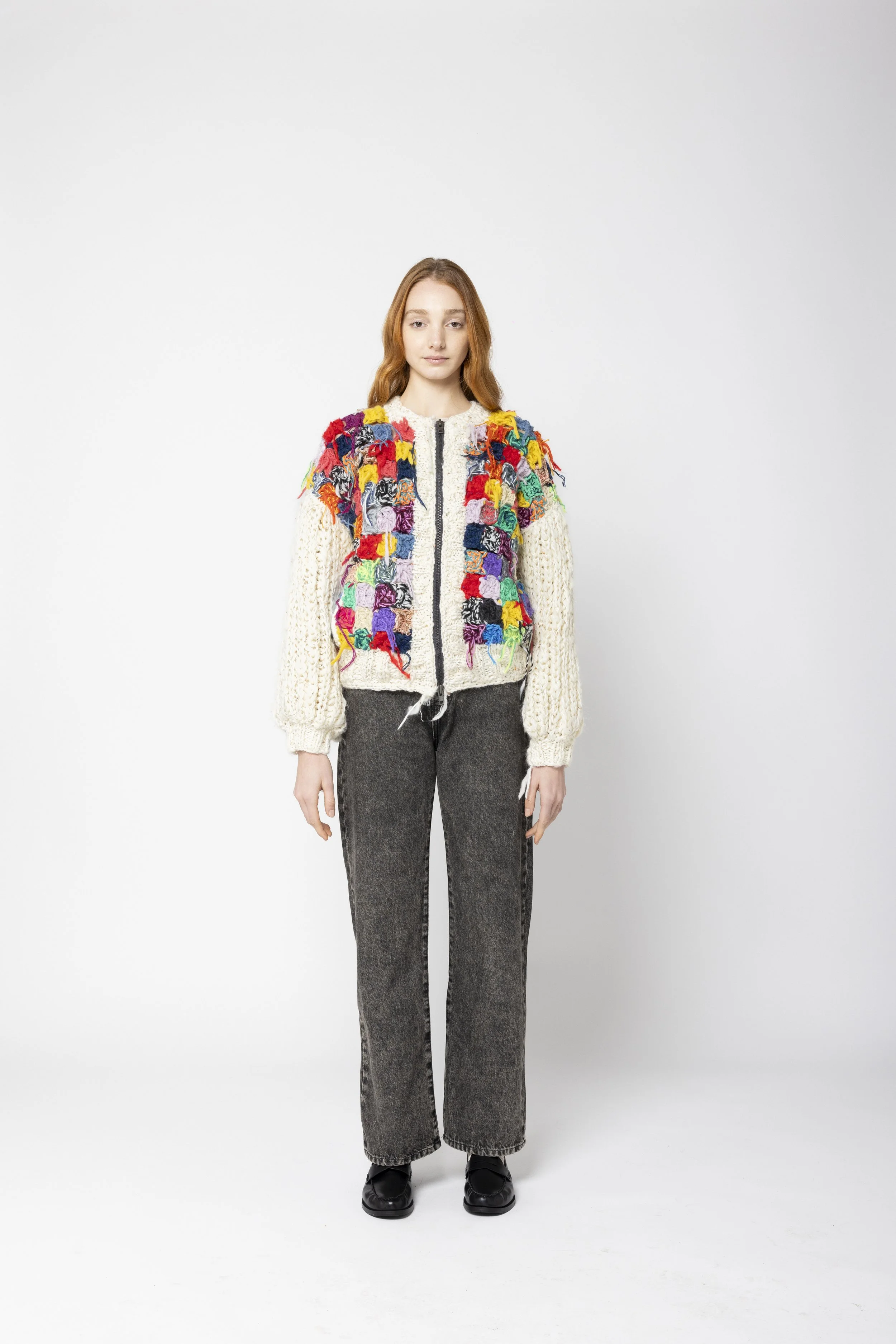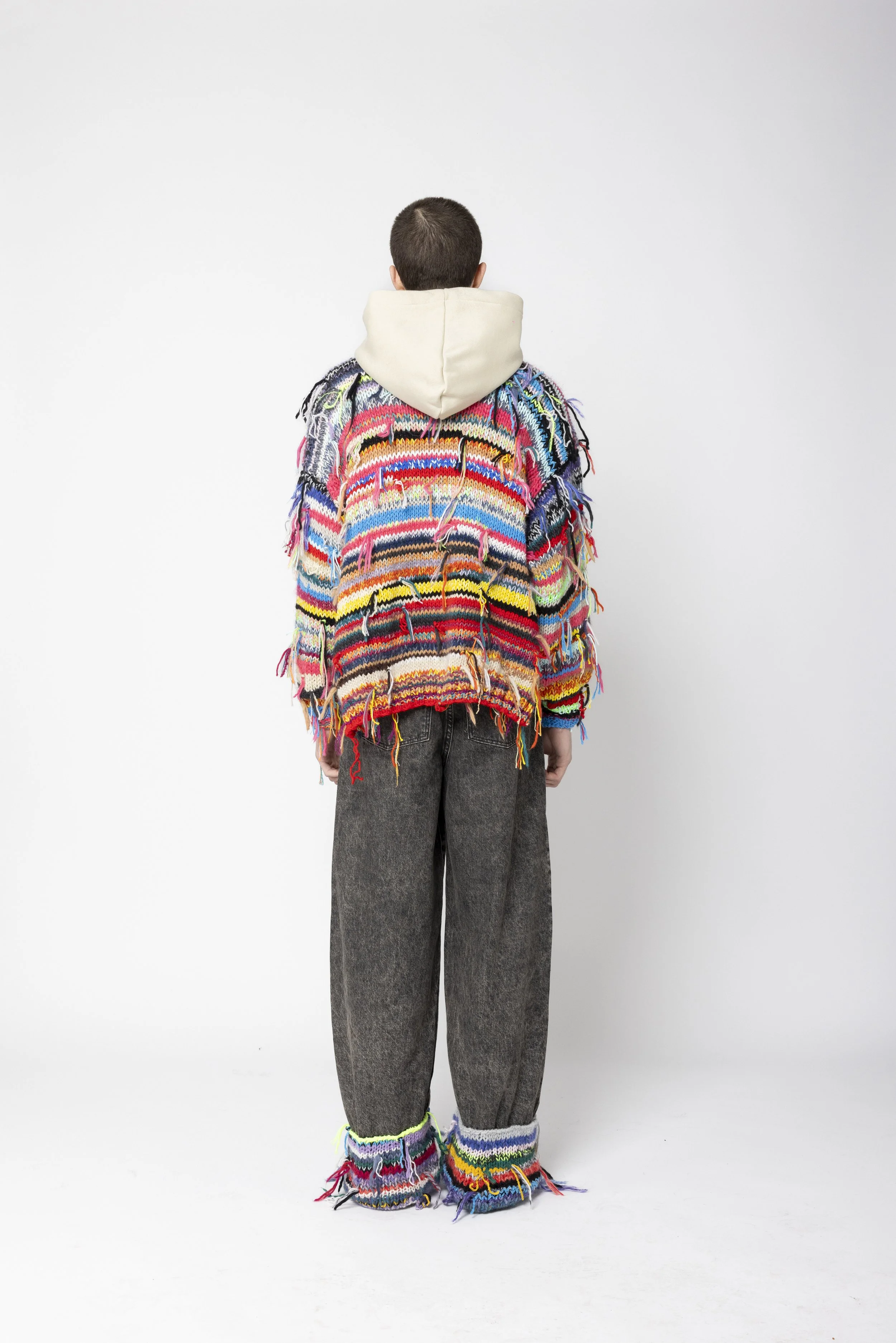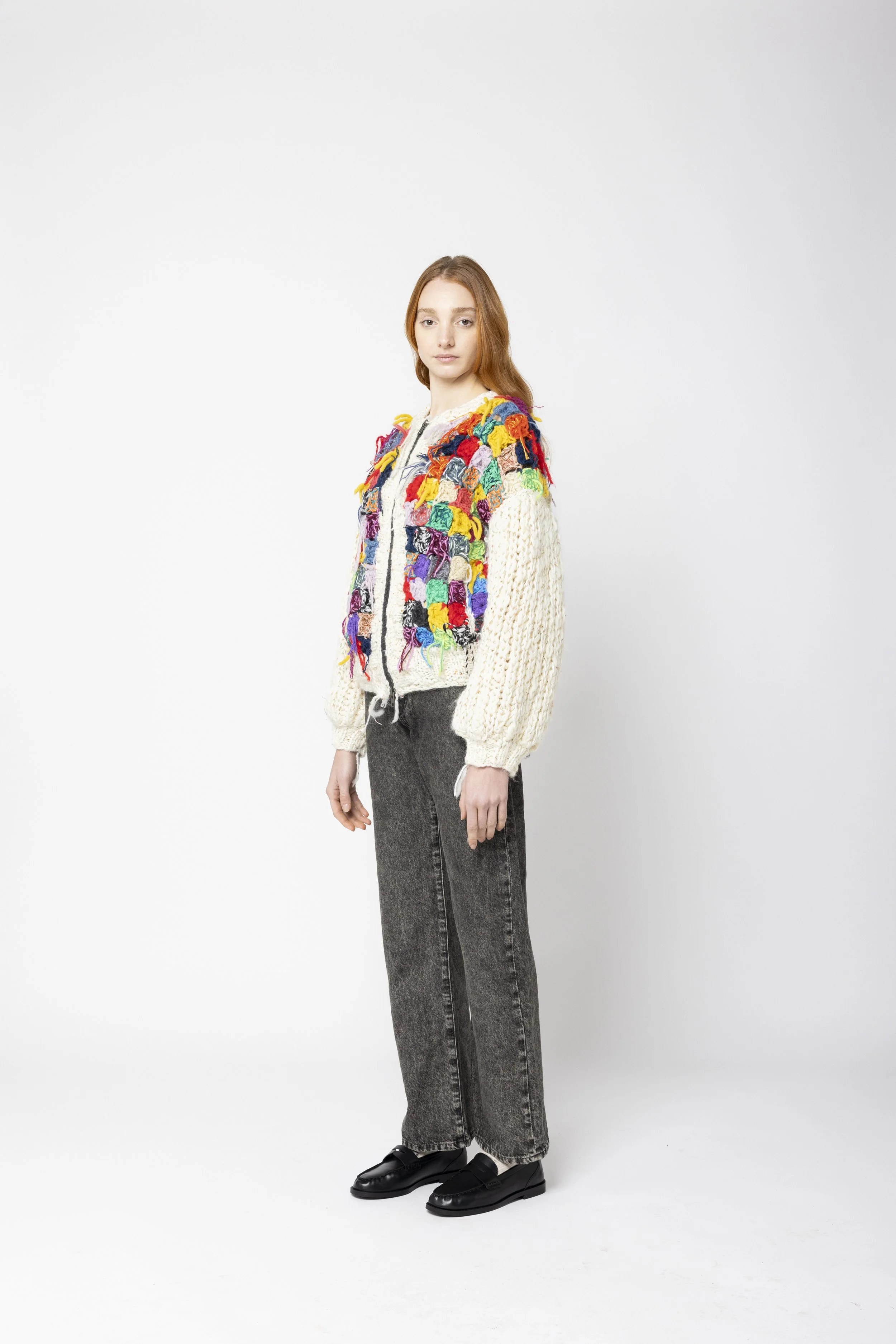All the knitwear is handmade, the knot is the way we assemble the excess of the yarns we upcycled for creating multicolor patterns. The patchwork items are hand assembled with upcycled vintage clothes, and all the embroidery details in the collection are hand made crochet.