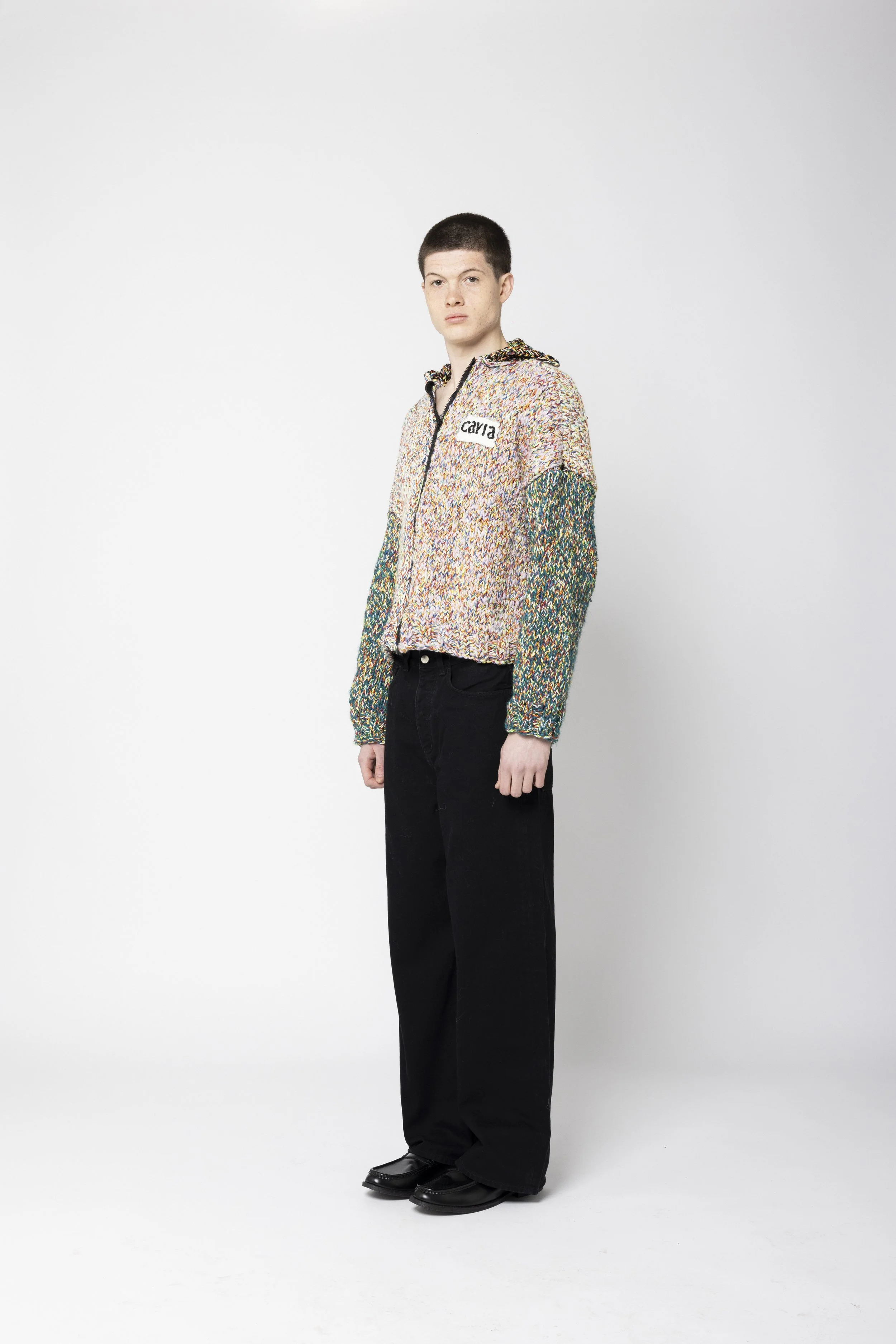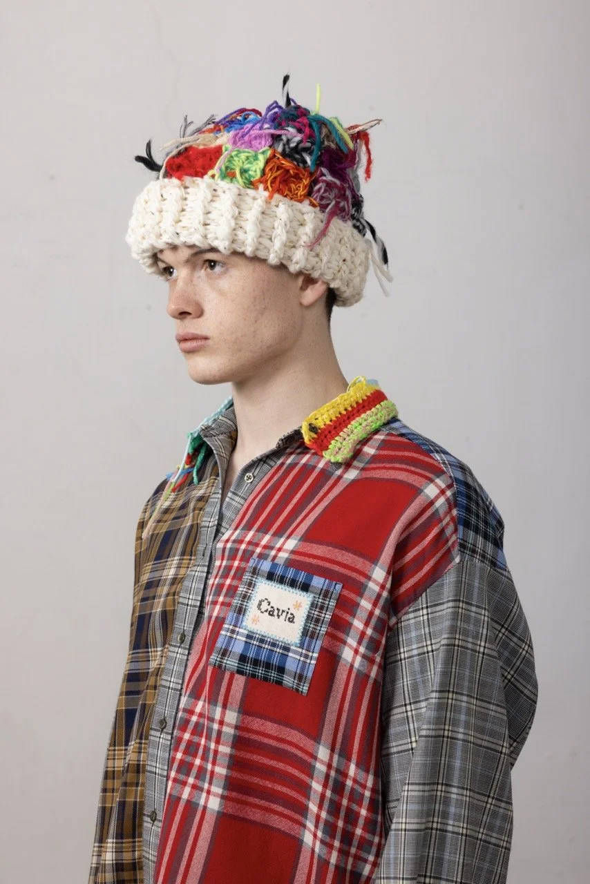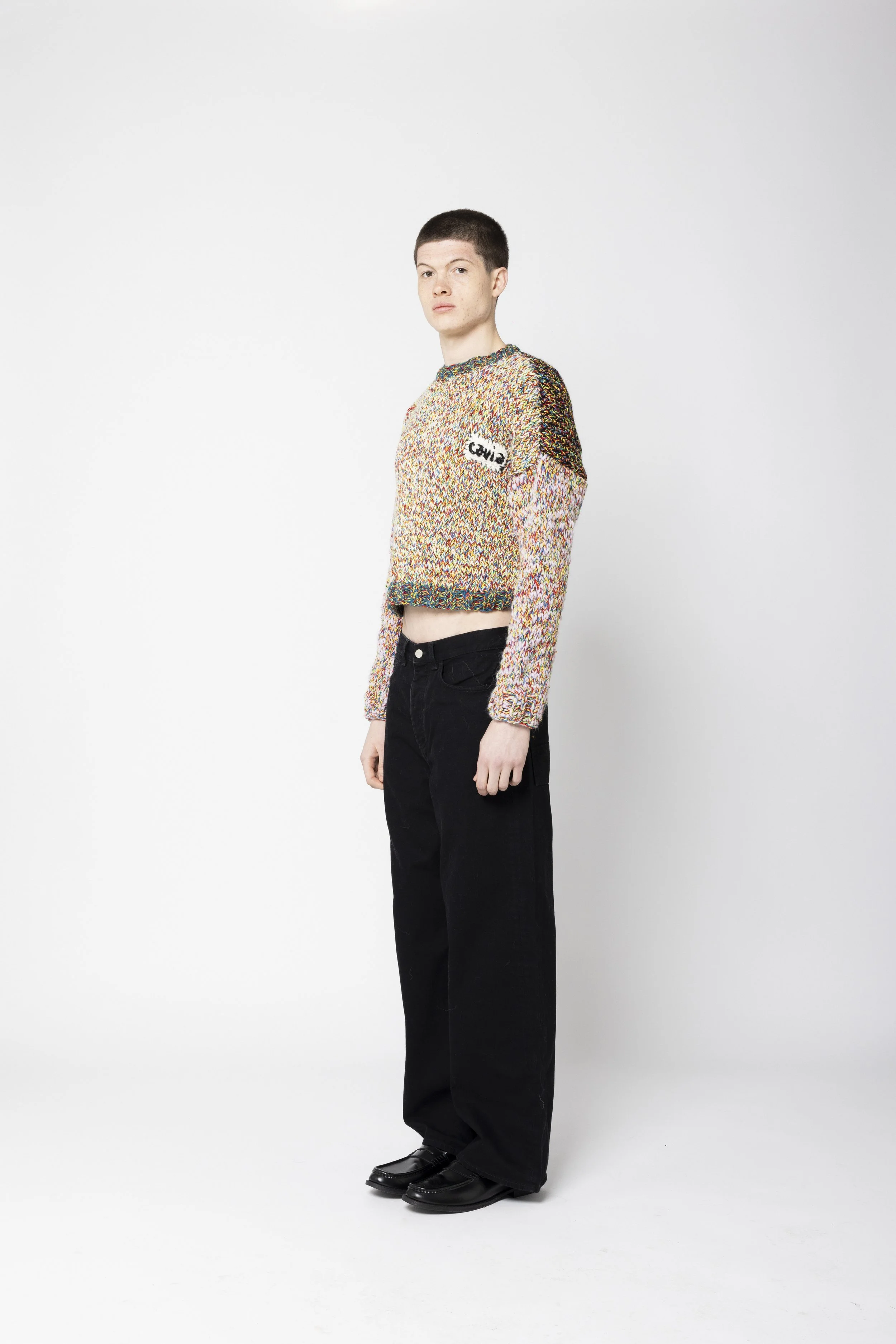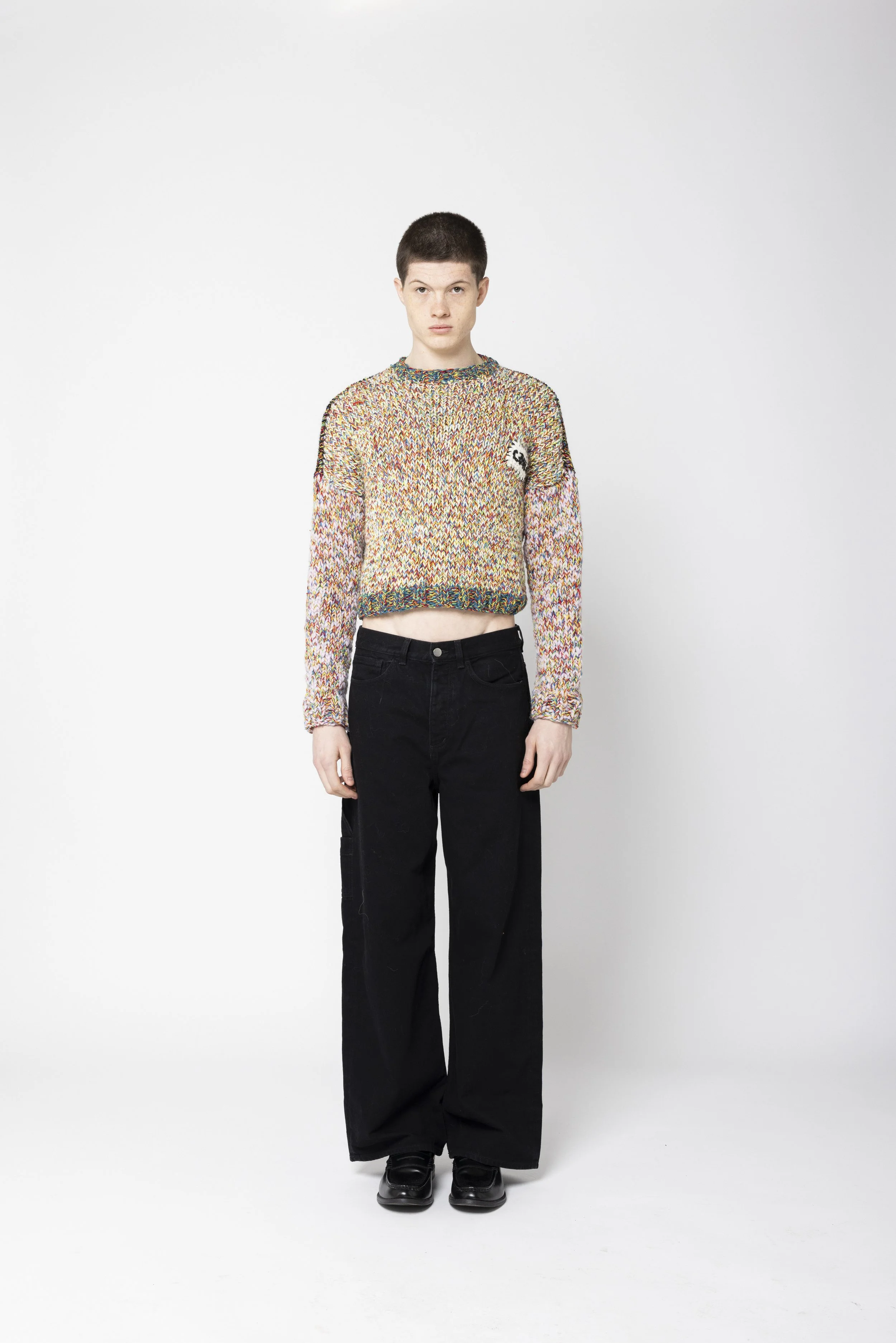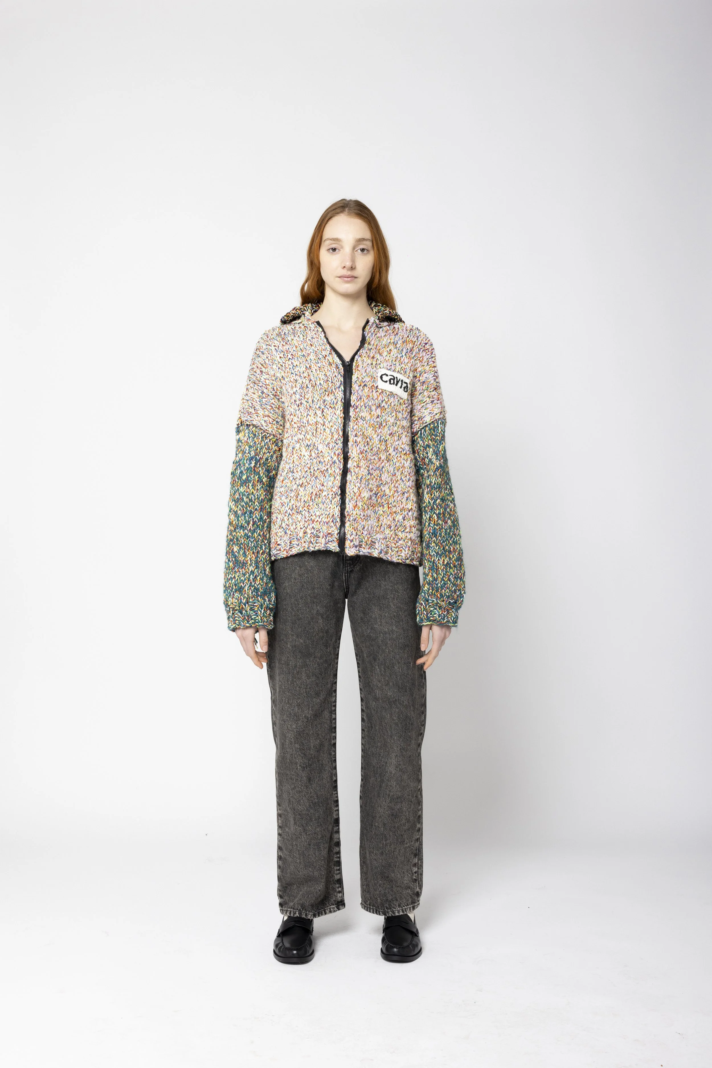 All the knitwear is handmade, the knot is the way we assemble the excess of the yarns we upcycled for creating multicolor patterns. The patchwork items are hand assembled with upcycled vintage clothes, and all the embroidery details in the collection are hand made crochet.