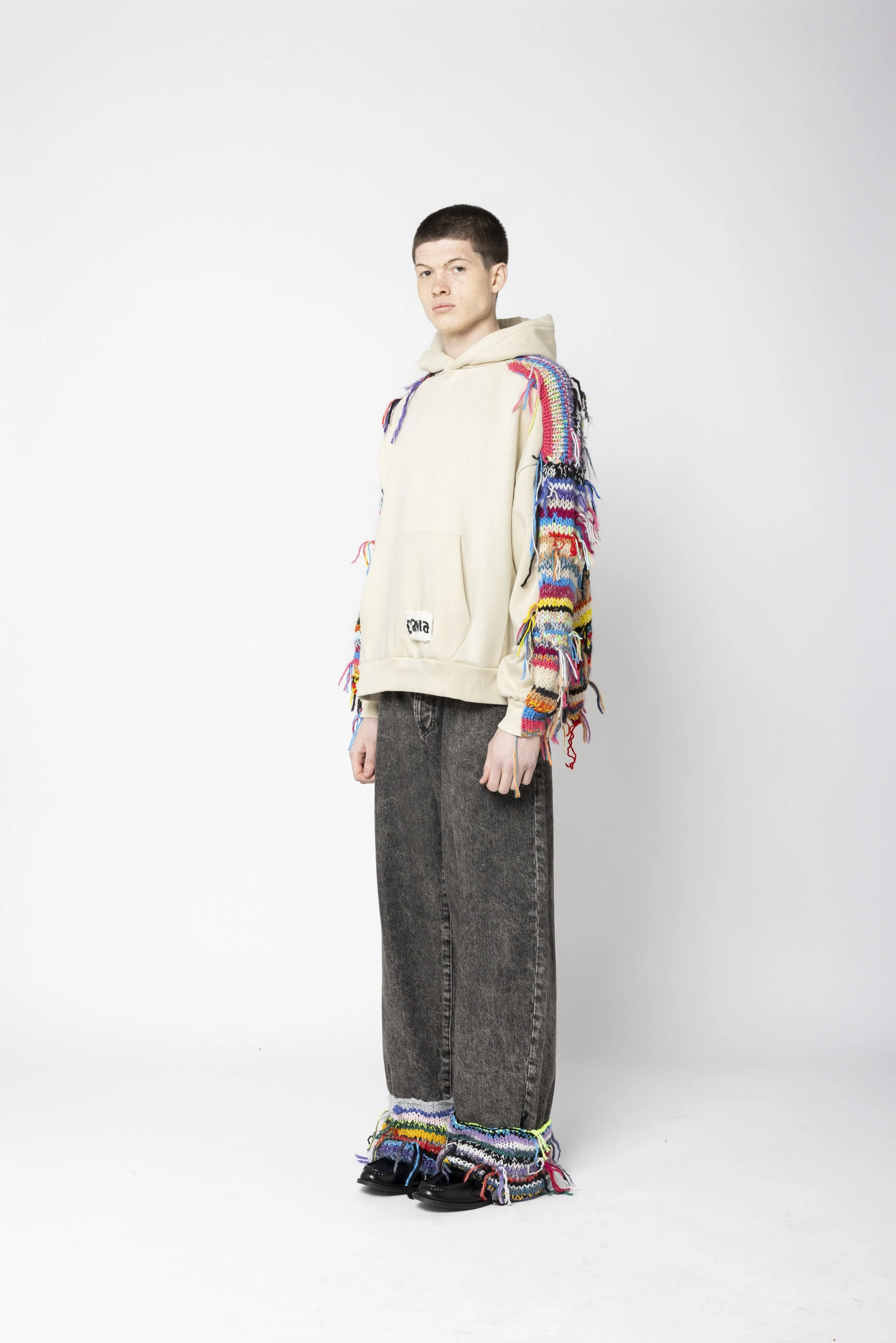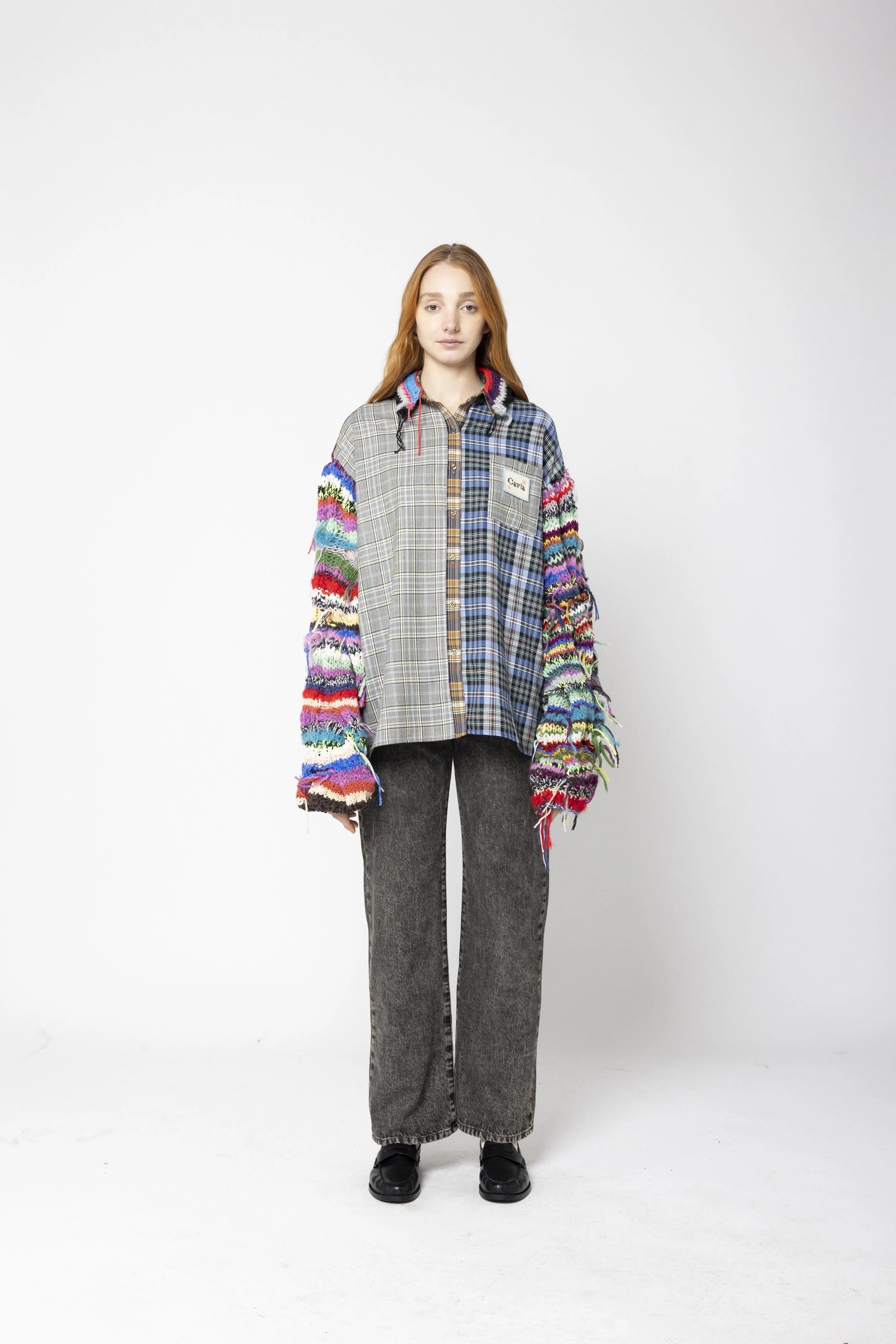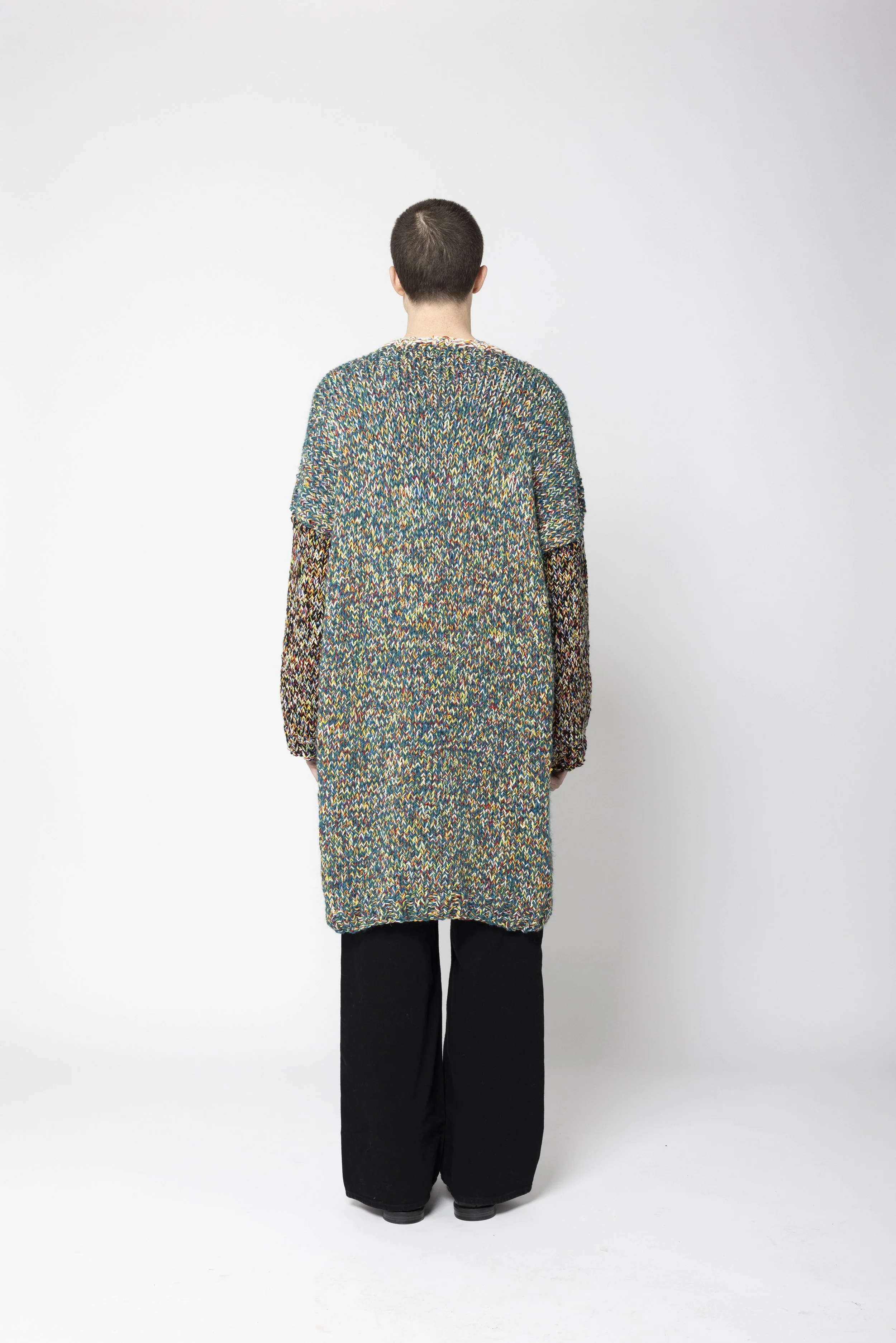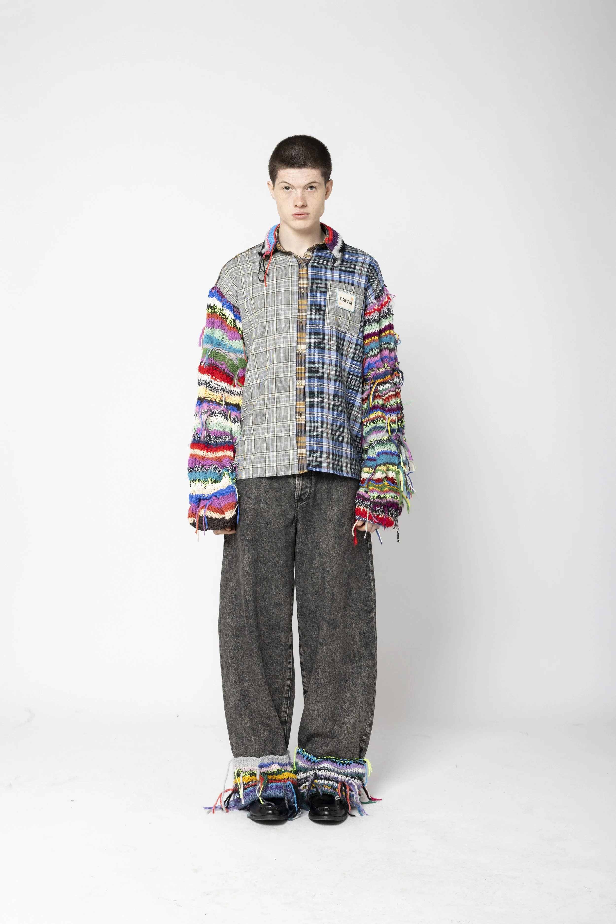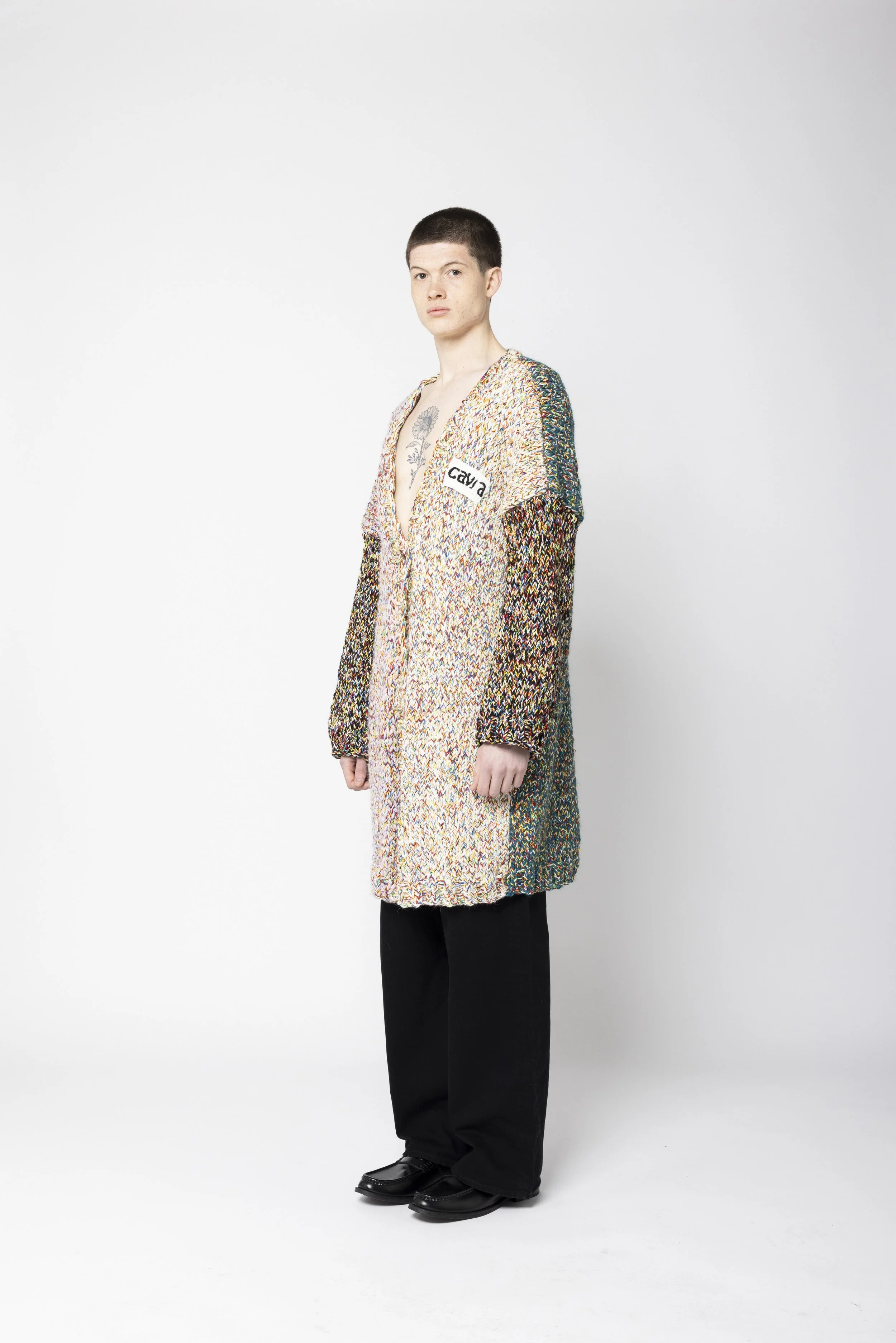 All the knitwear is handmade, the knot is the way we assemble the excess of the yarns we upcycled for creating multicolor patterns. The patchwork items are hand assembled with upcycled vintage clothes, and all the embroidery details in the collection are hand made crochet.