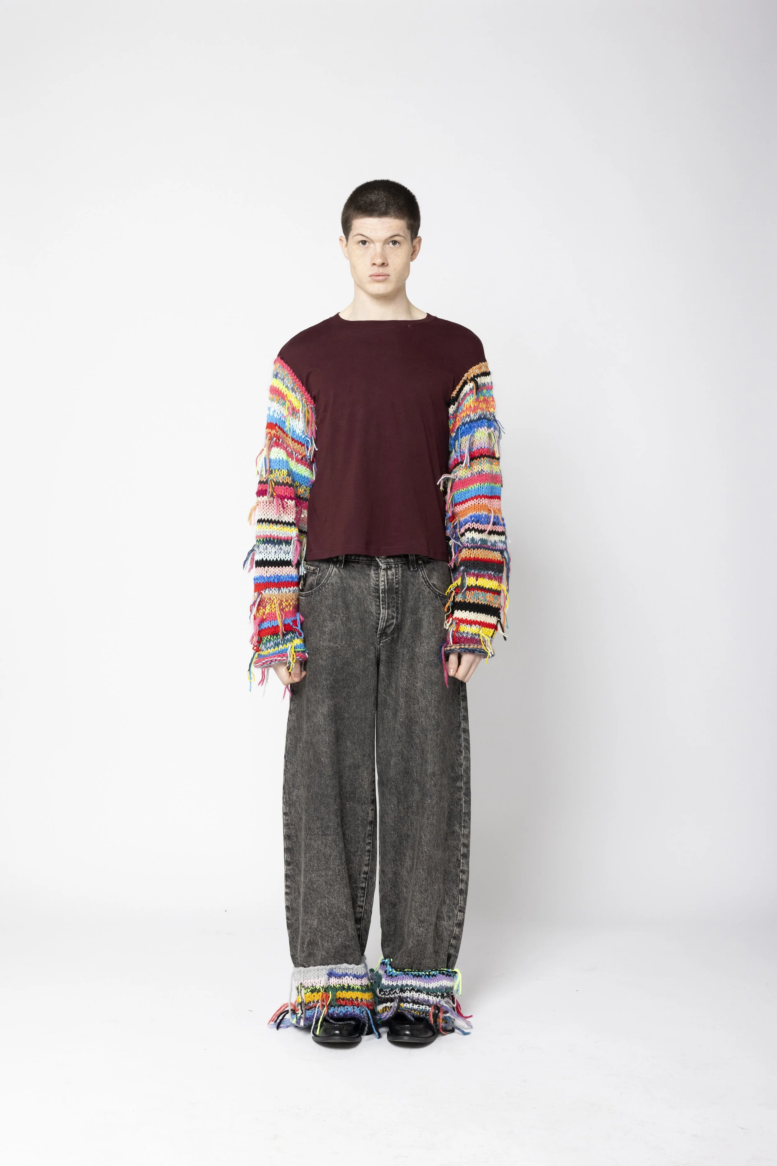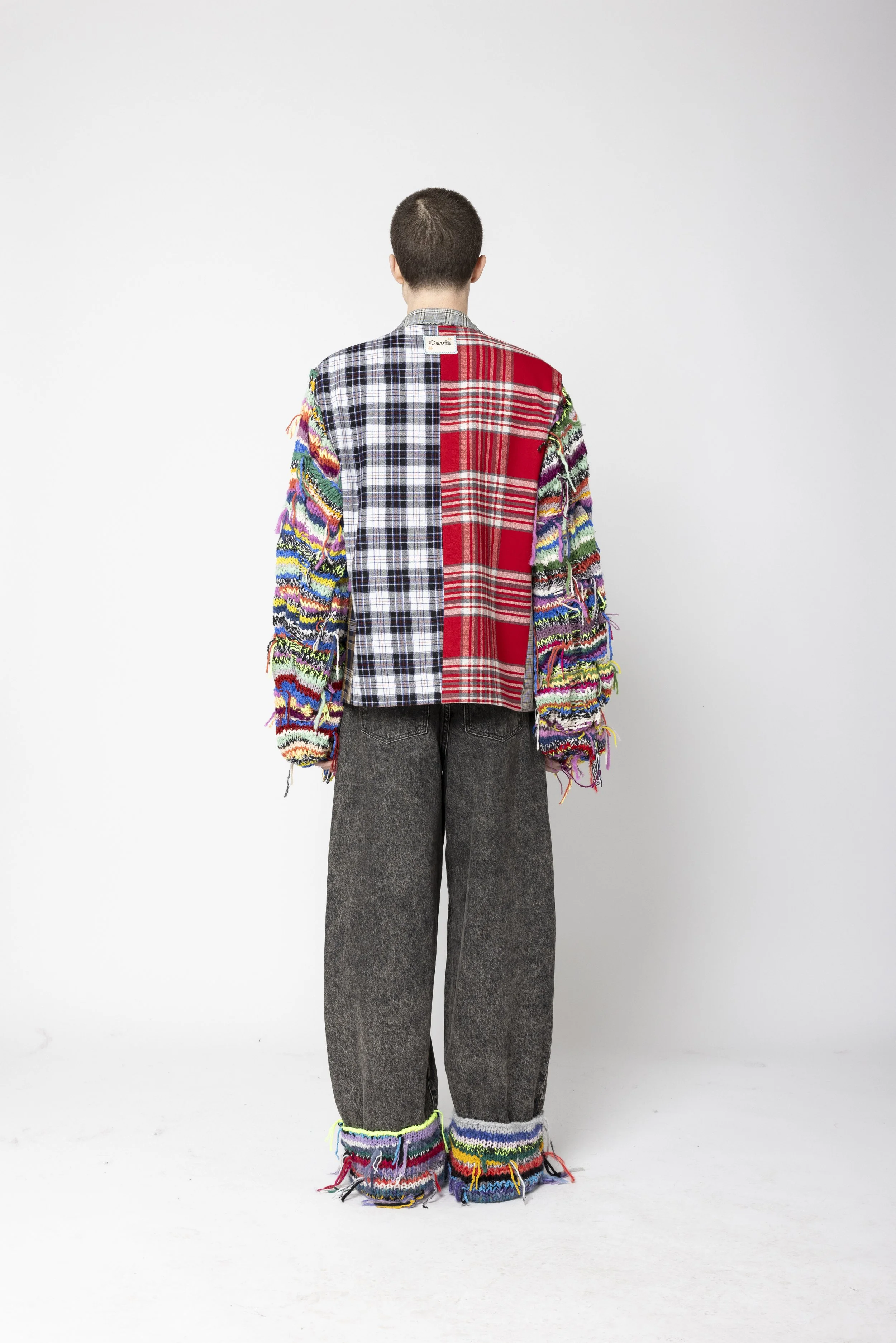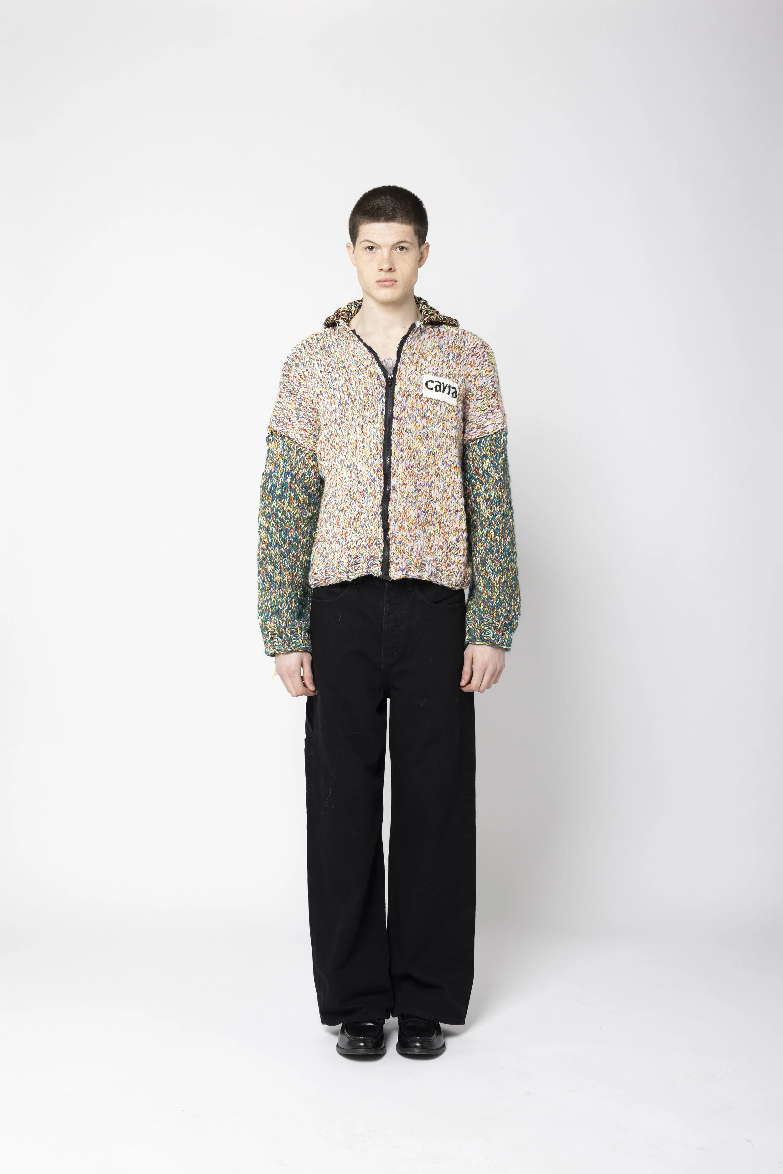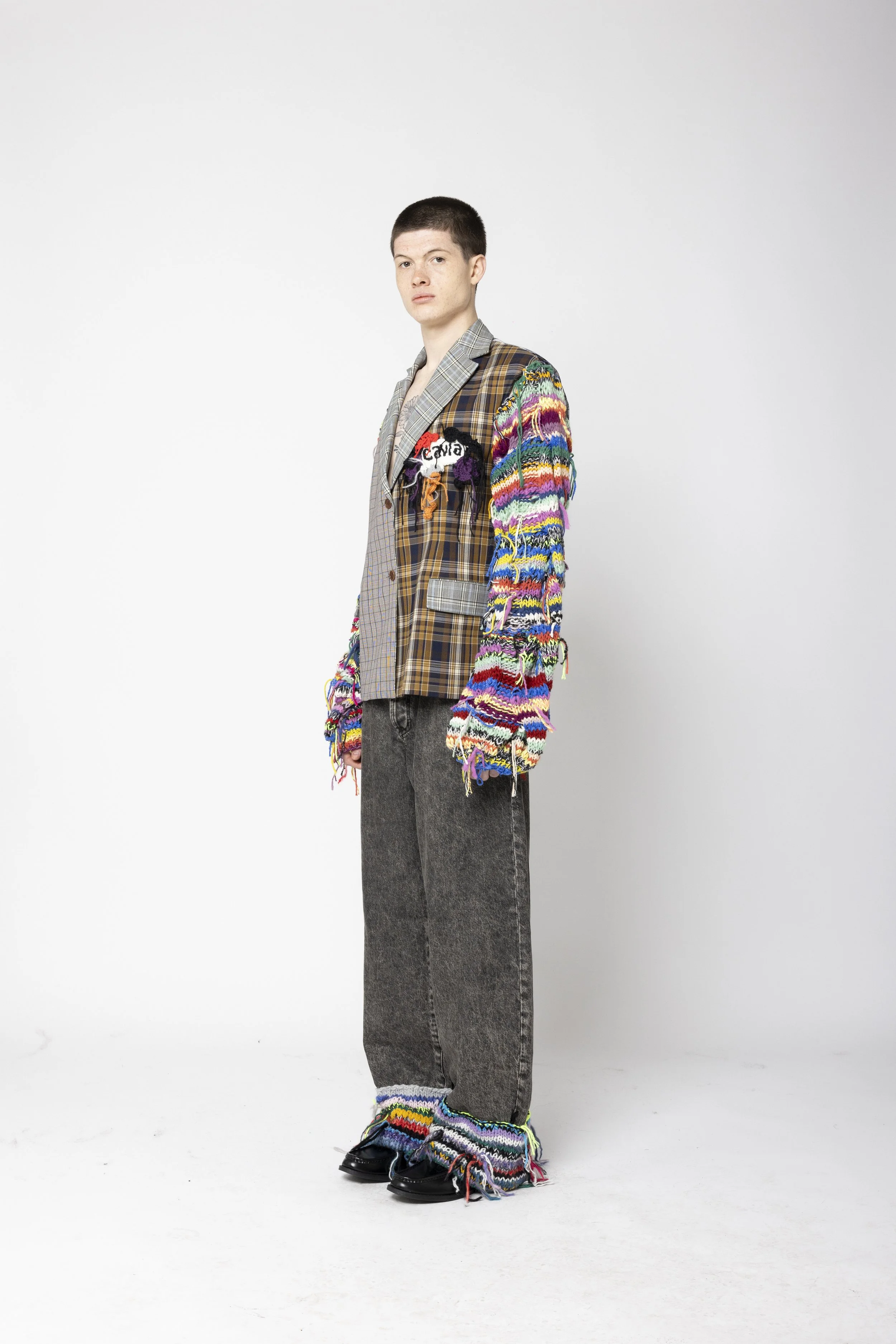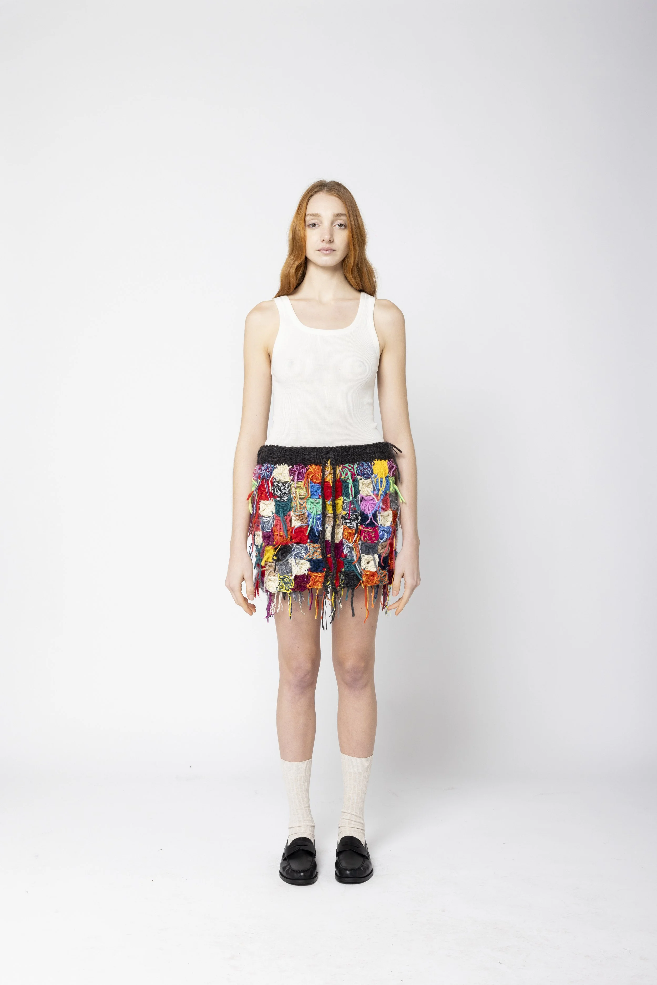 All the knitwear is handmade, the knot is the way we assemble the excess of the yarns we upcycled for creating multicolor patterns. The patchwork items are hand assembled with upcycled vintage clothes, and all the embroidery details in the collection are hand made crochet.
