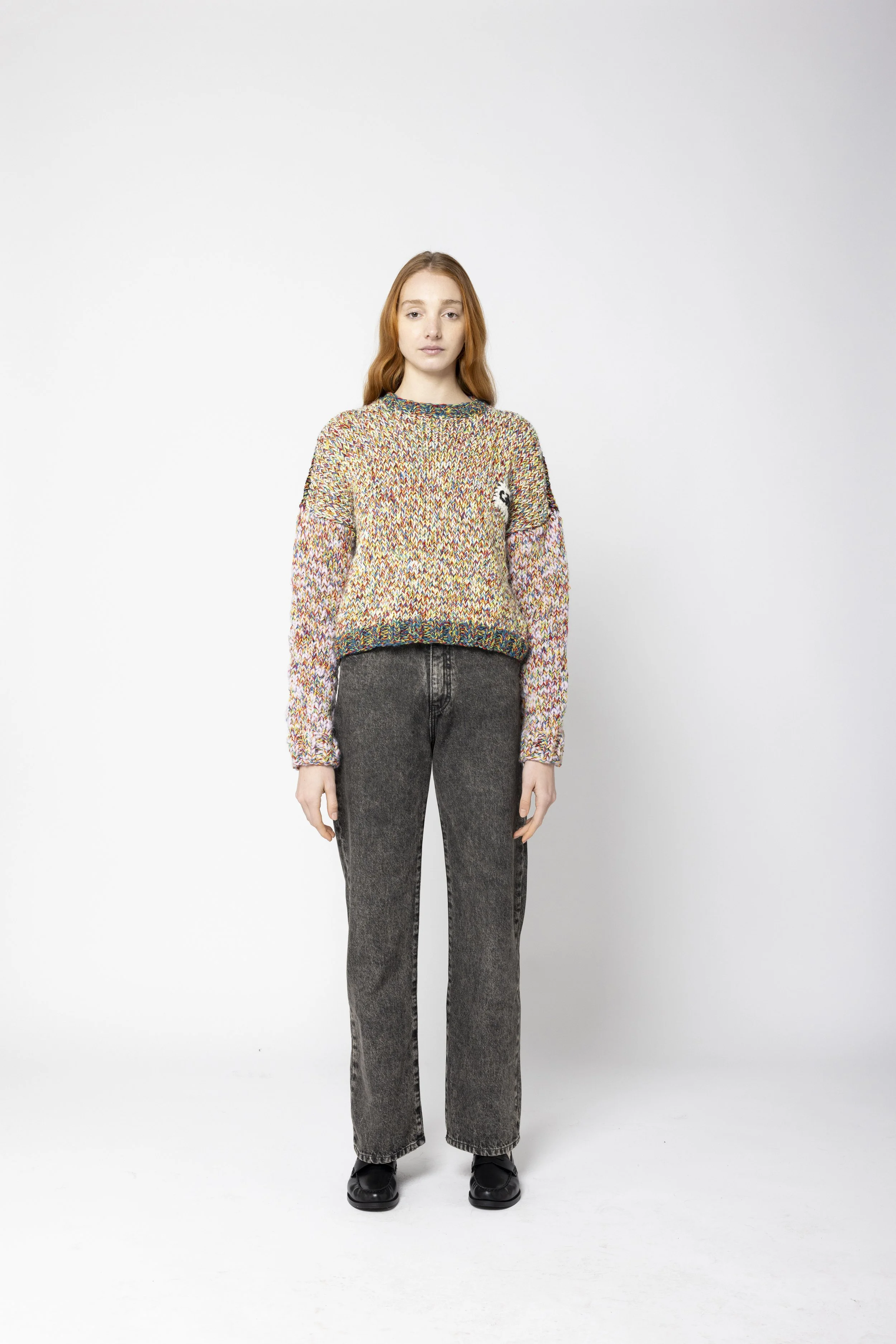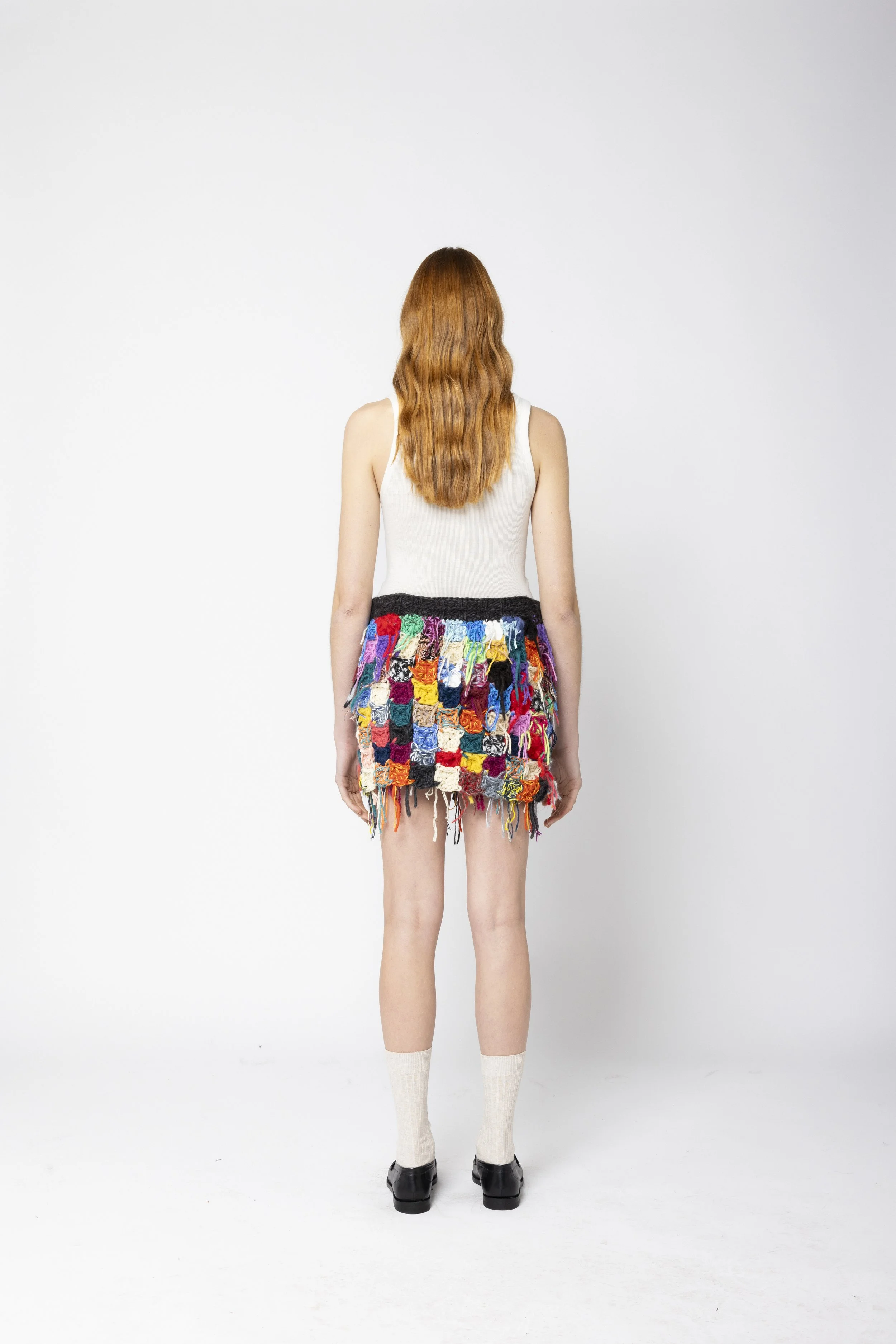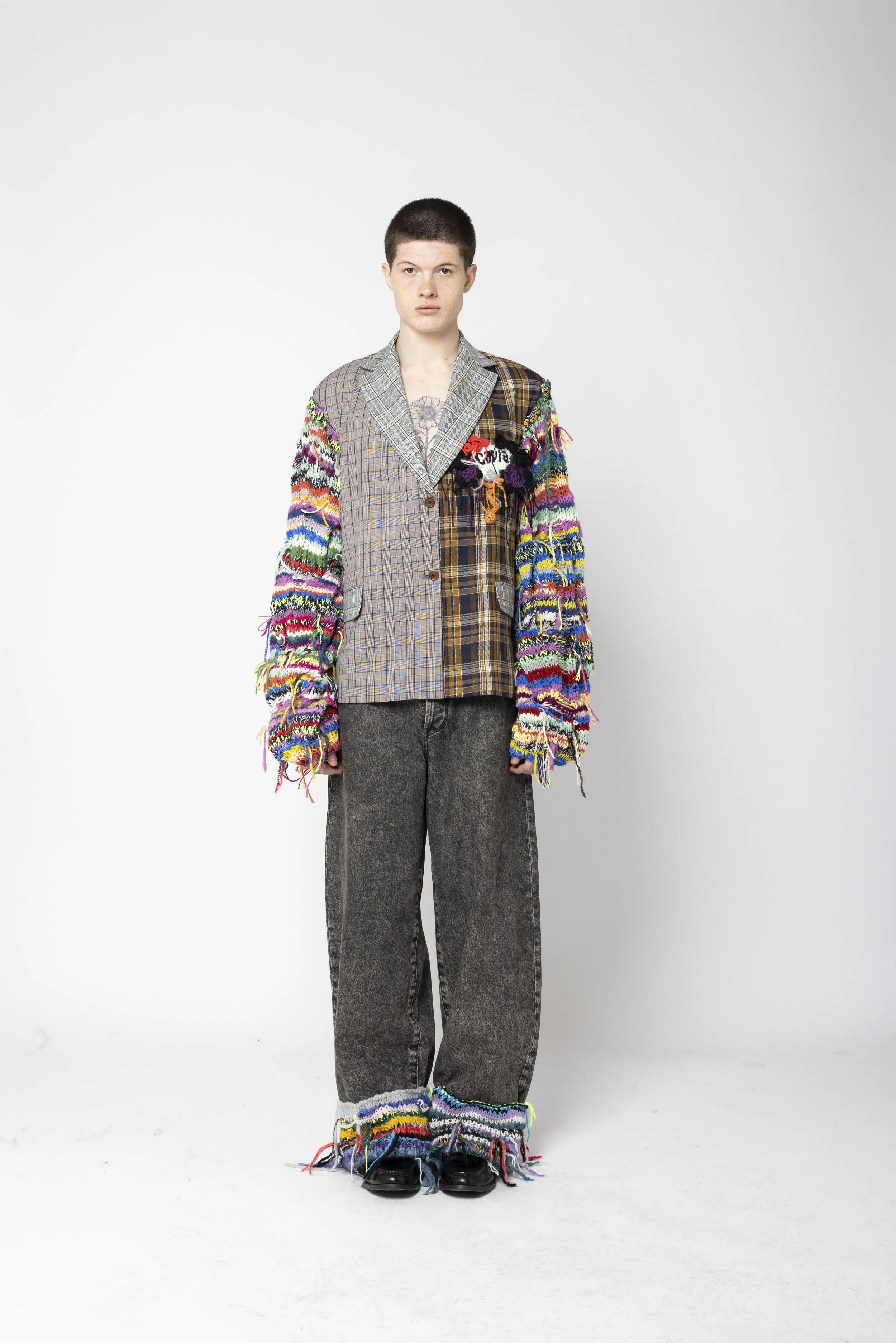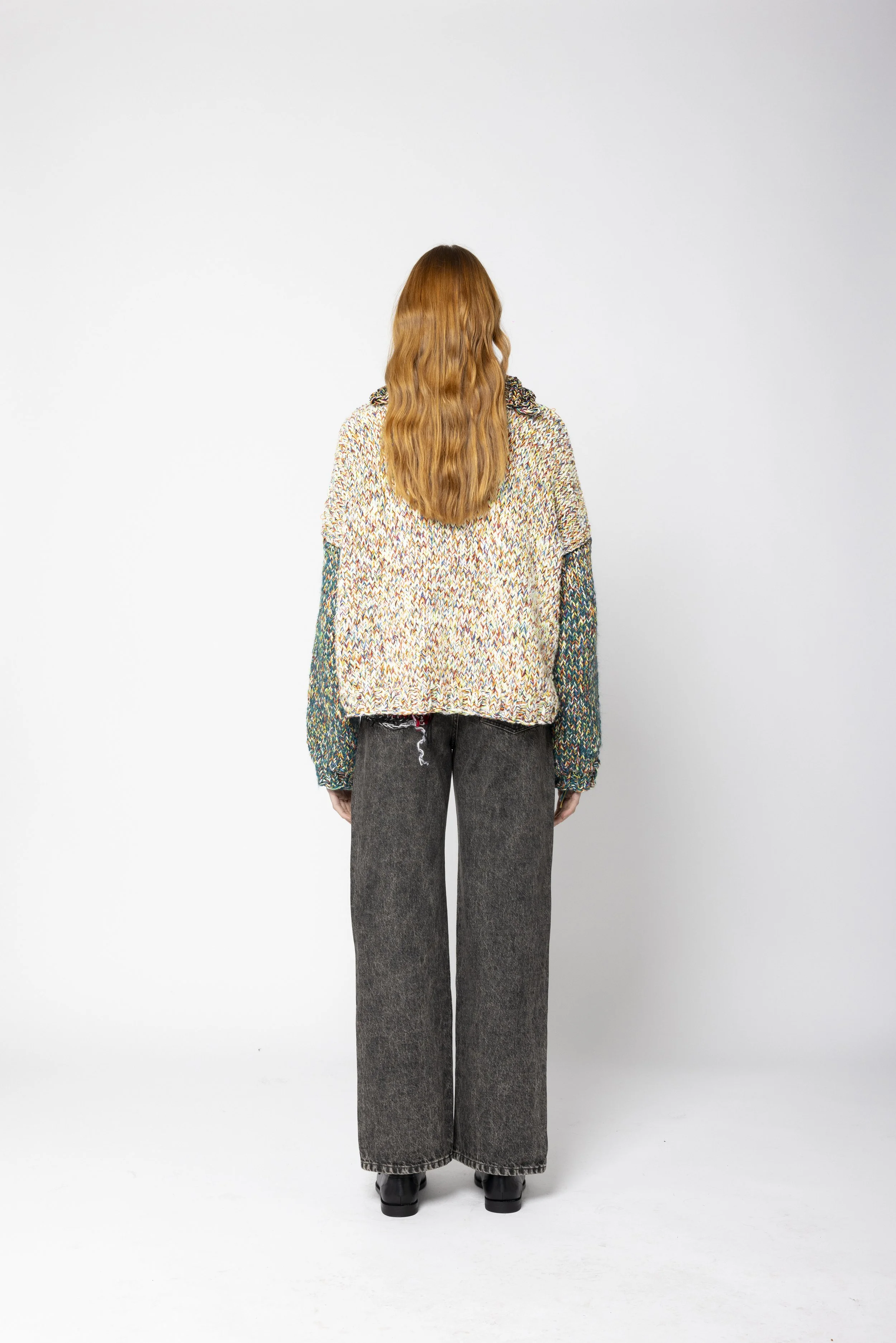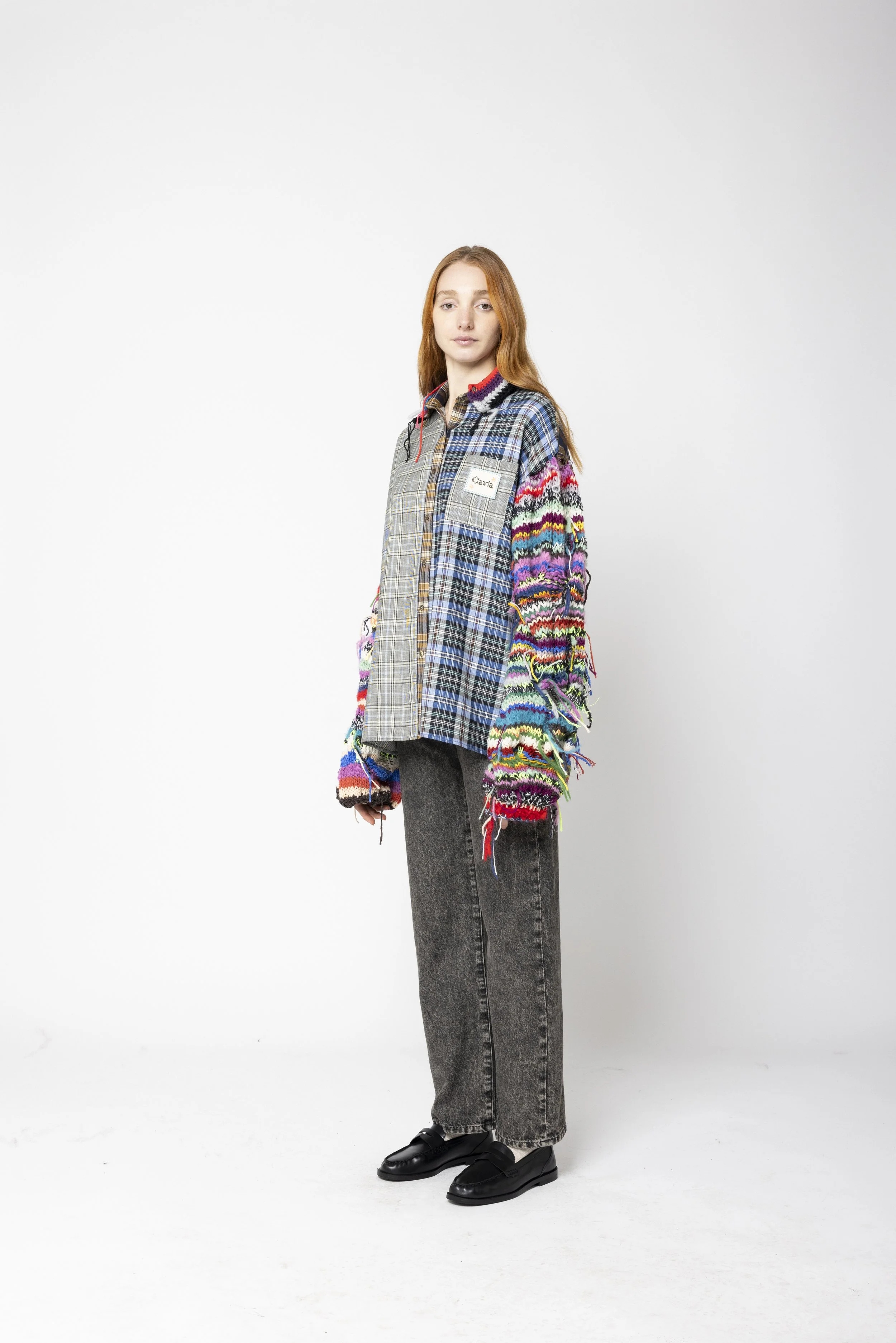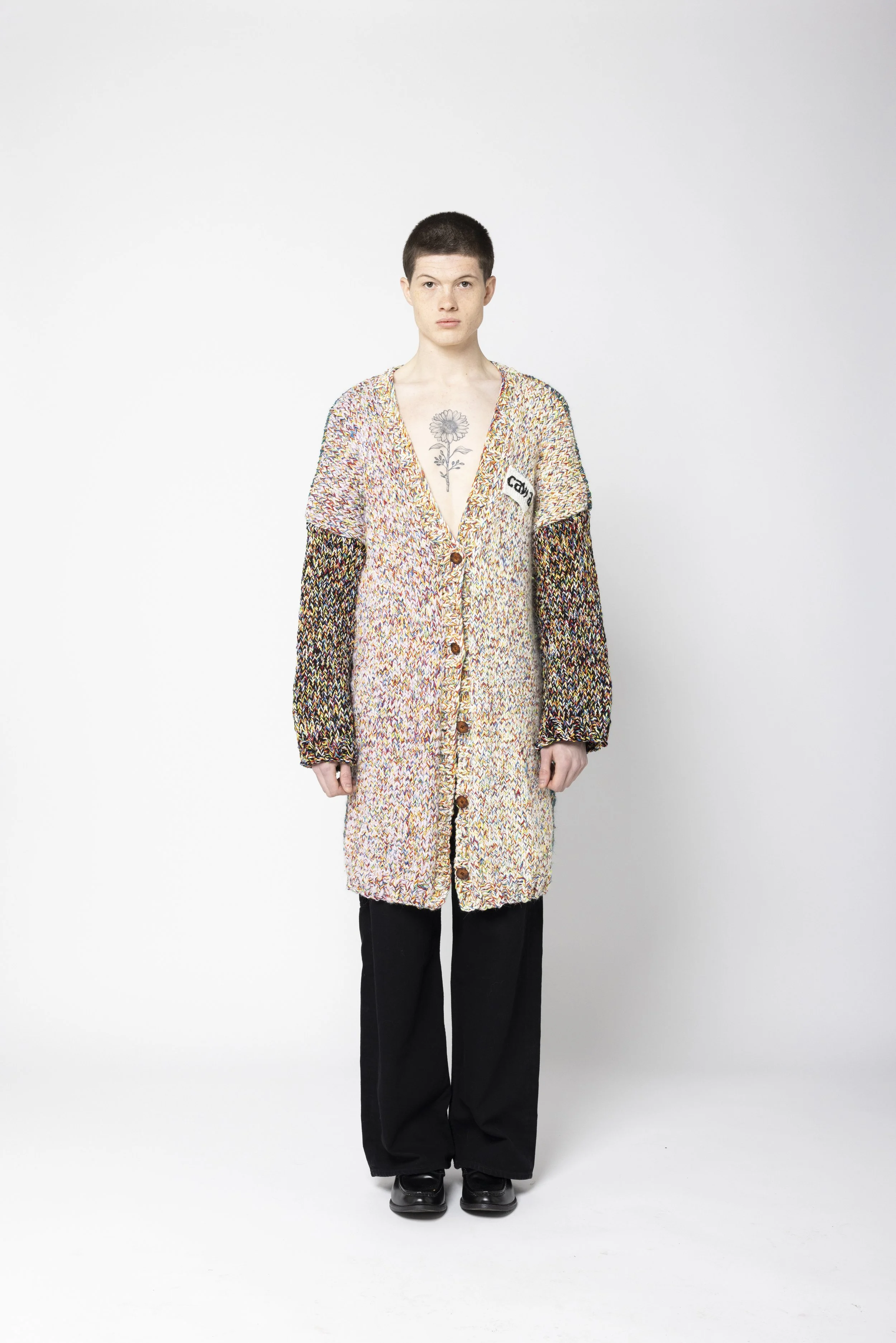 All the knitwear is handmade, the knot is the way we assemble the excess of the yarns we upcycled for creating multicolor patterns. The patchwork items are hand assembled with upcycled vintage clothes, and all the embroidery details in the collection are hand made crochet.