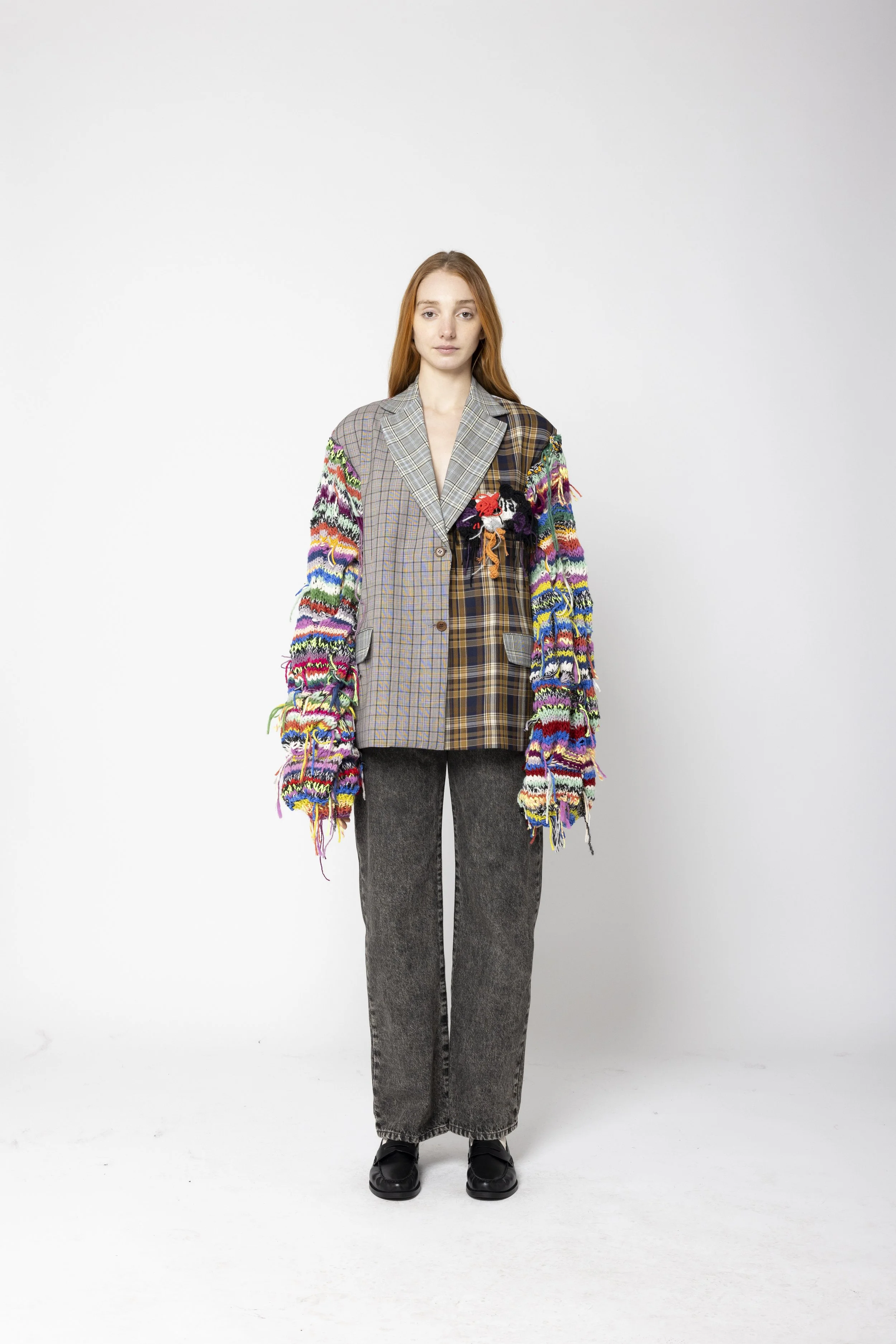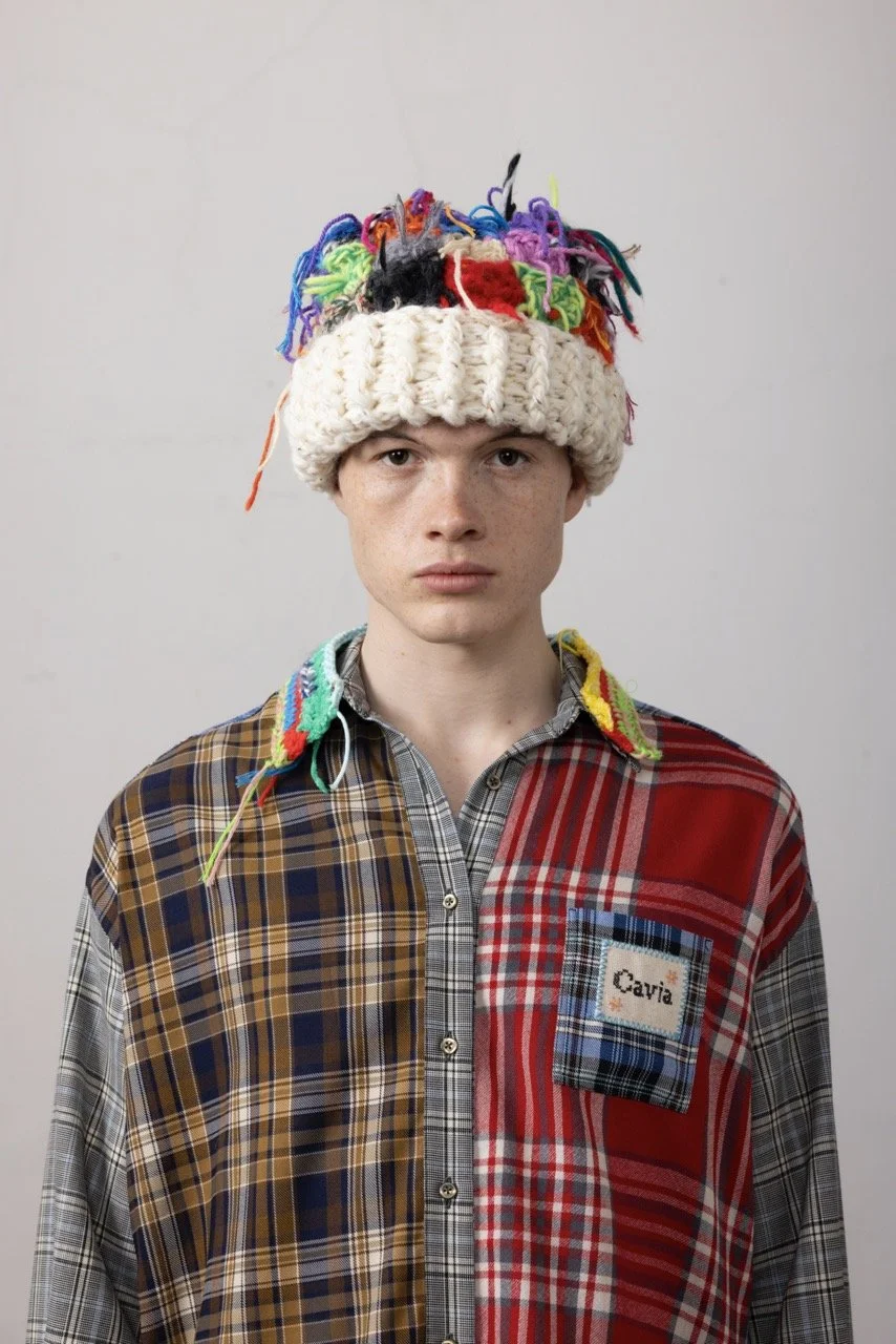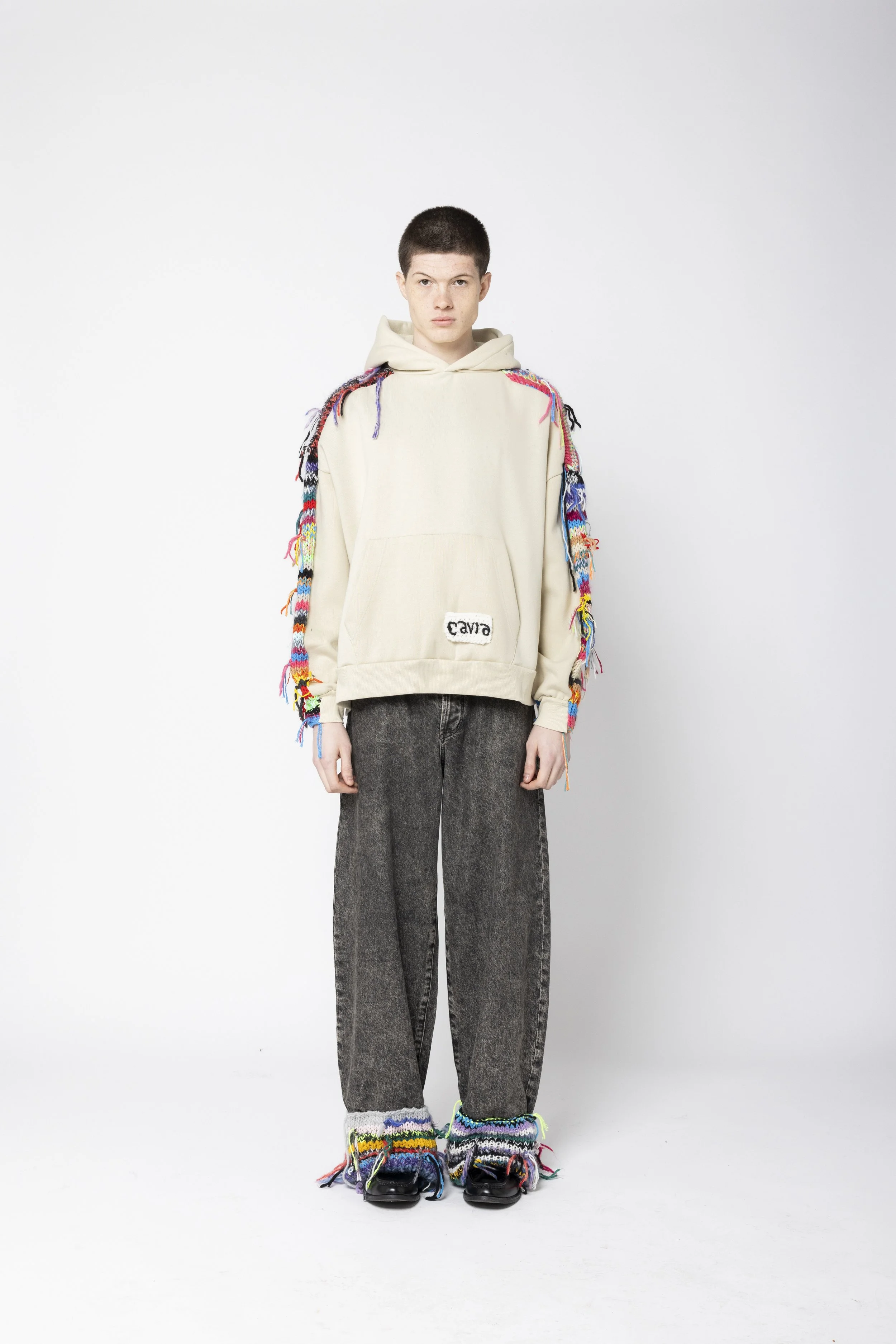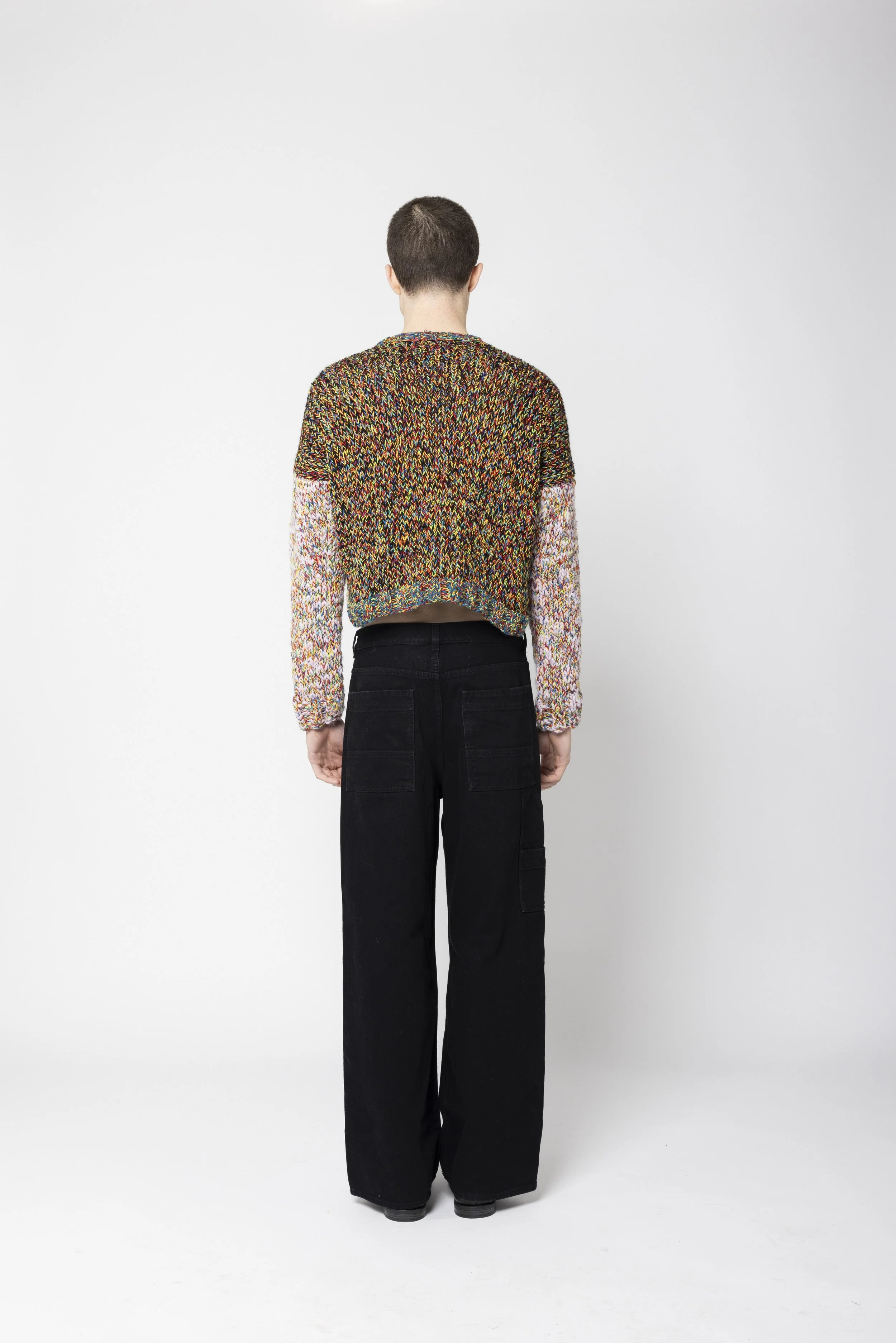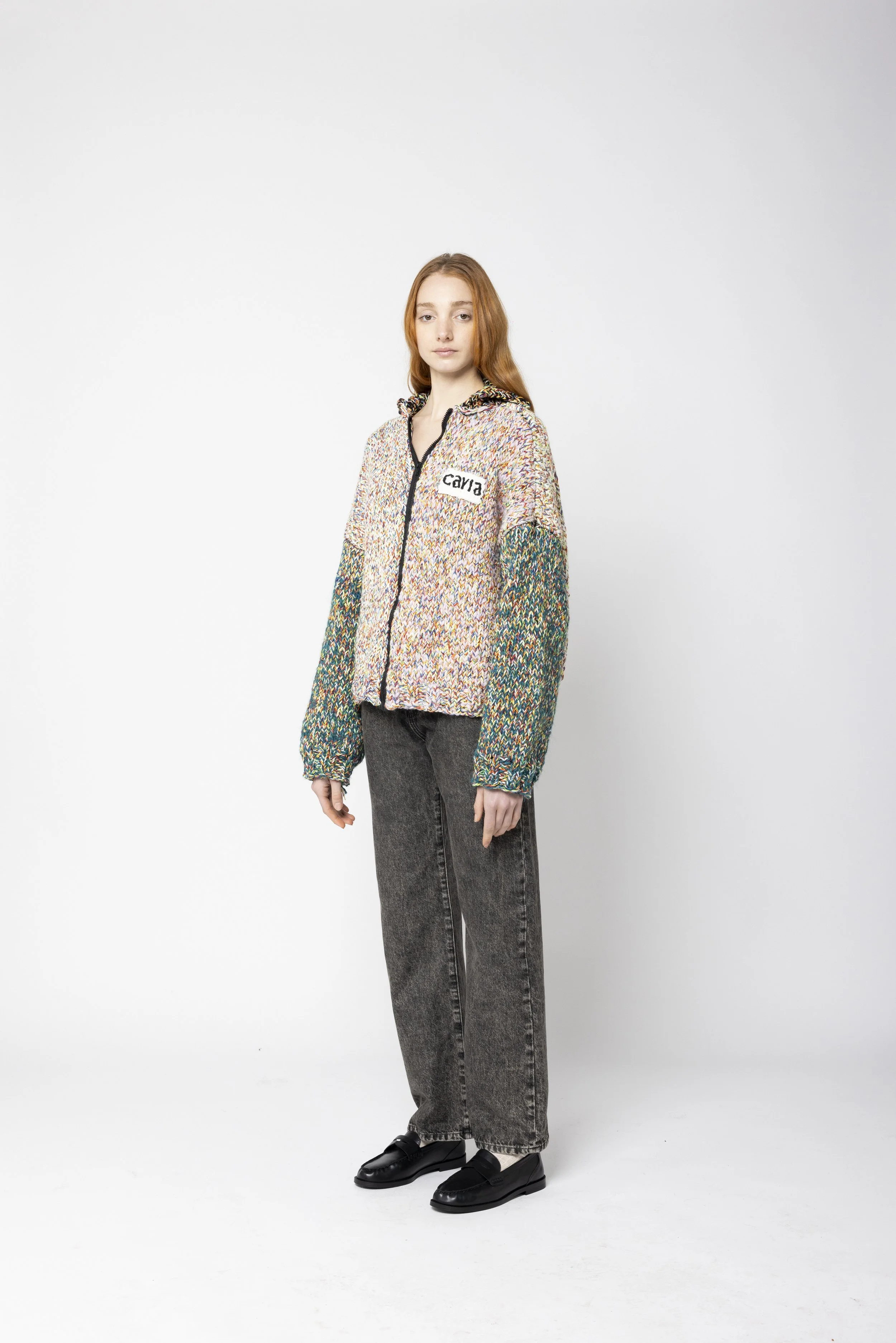 All the knitwear is handmade, the knot is the way we assemble the excess of the yarns we upcycled for creating multicolor patterns. The patchwork items are hand assembled with upcycled vintage clothes, and all the embroidery details in the collection are hand made crochet.