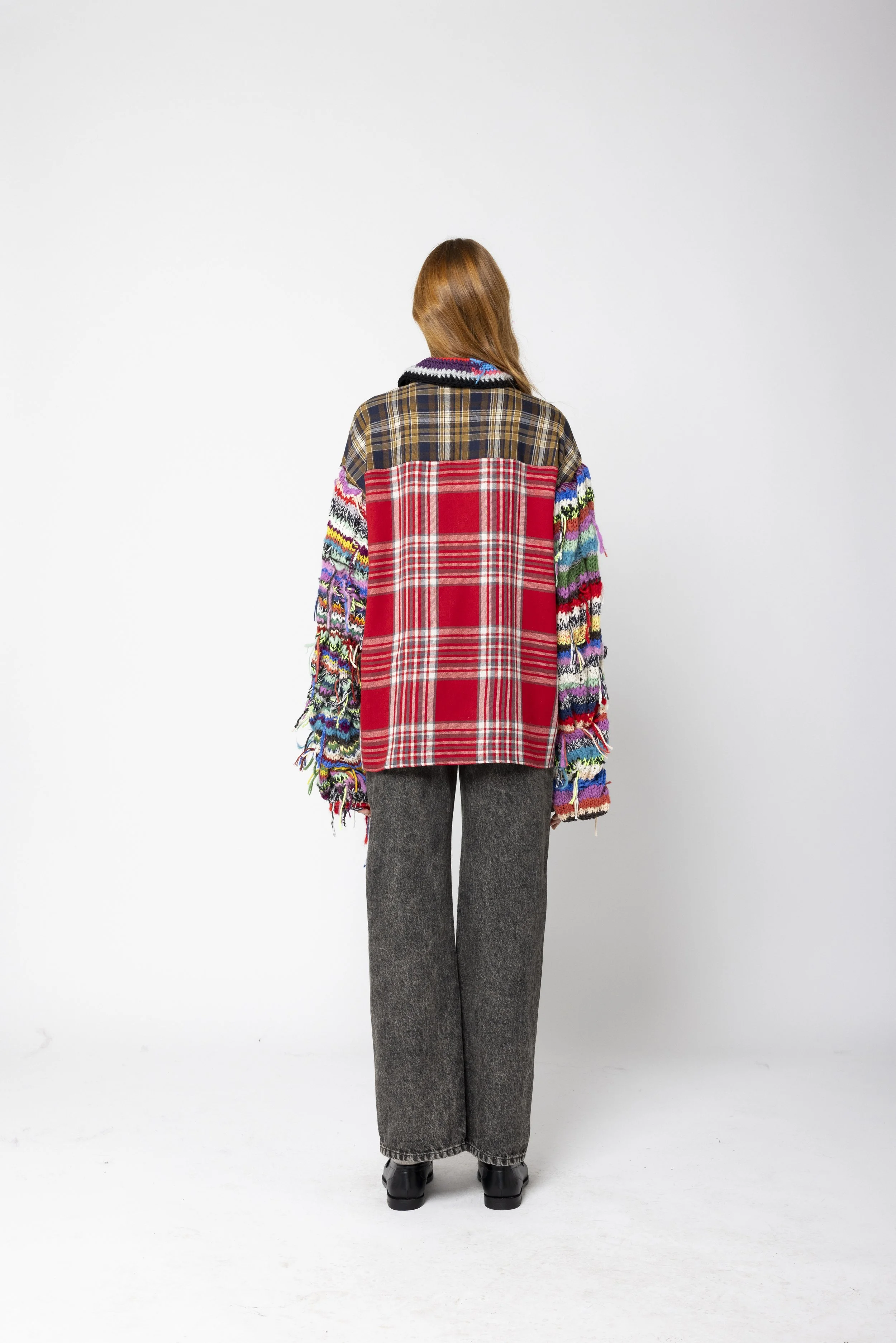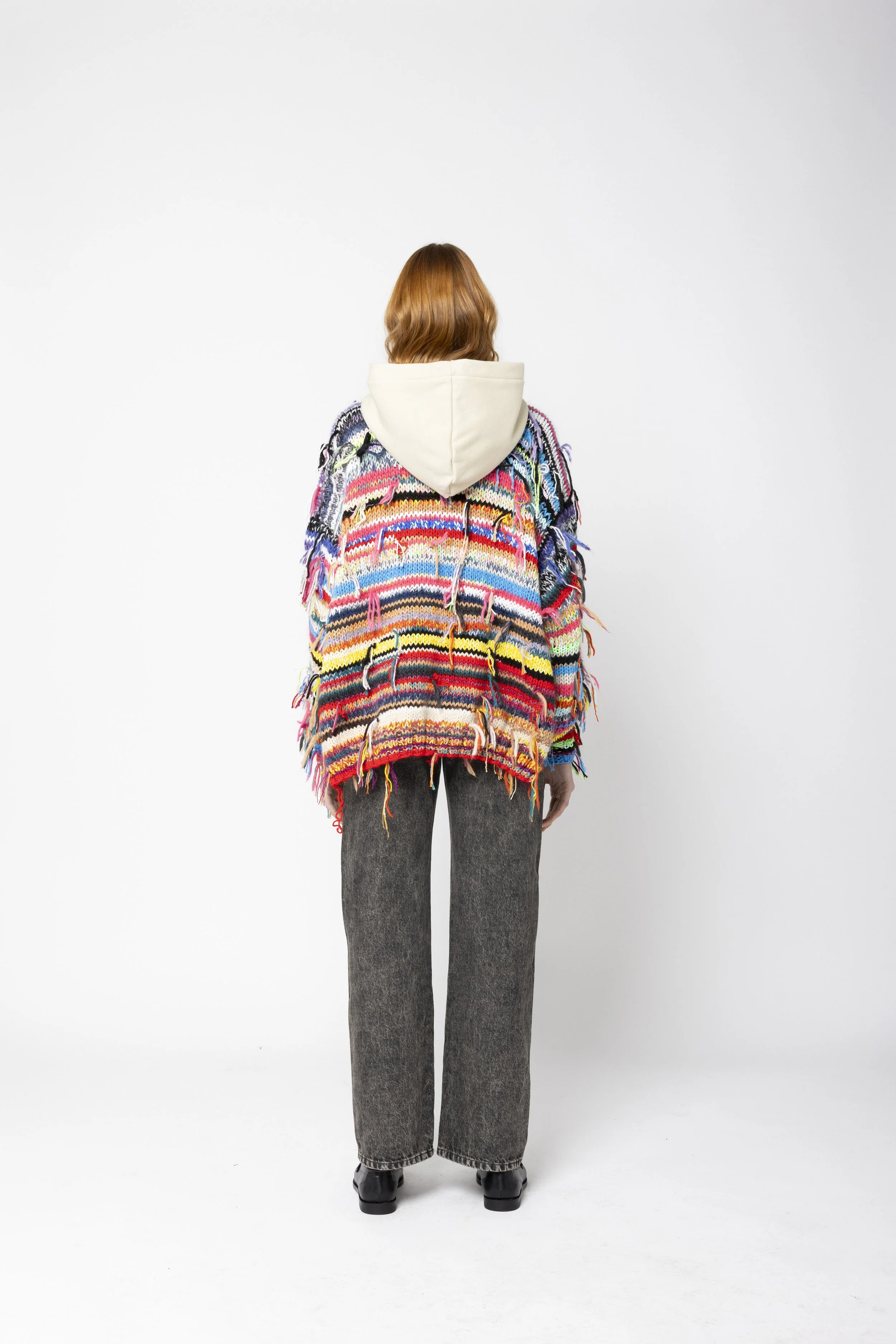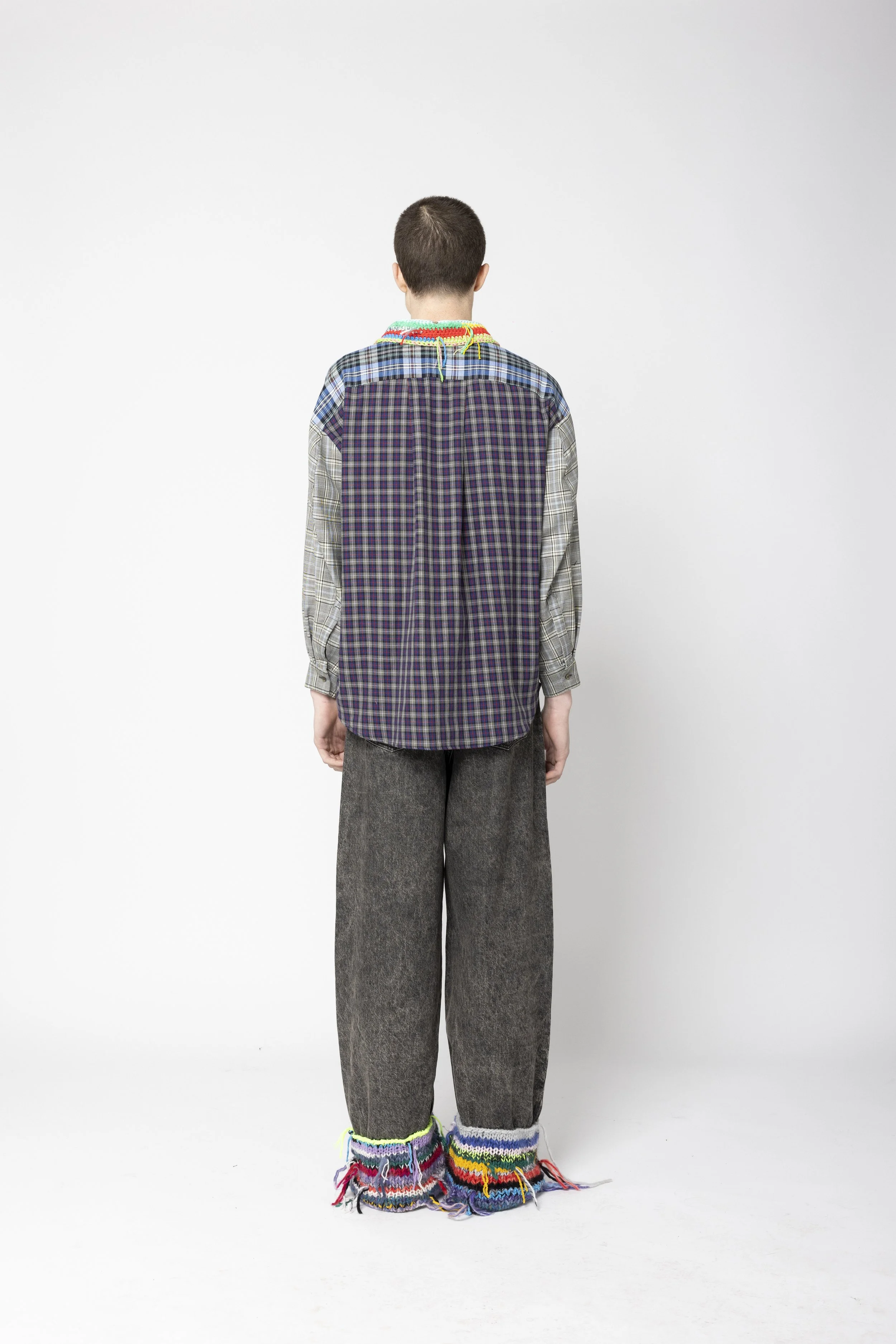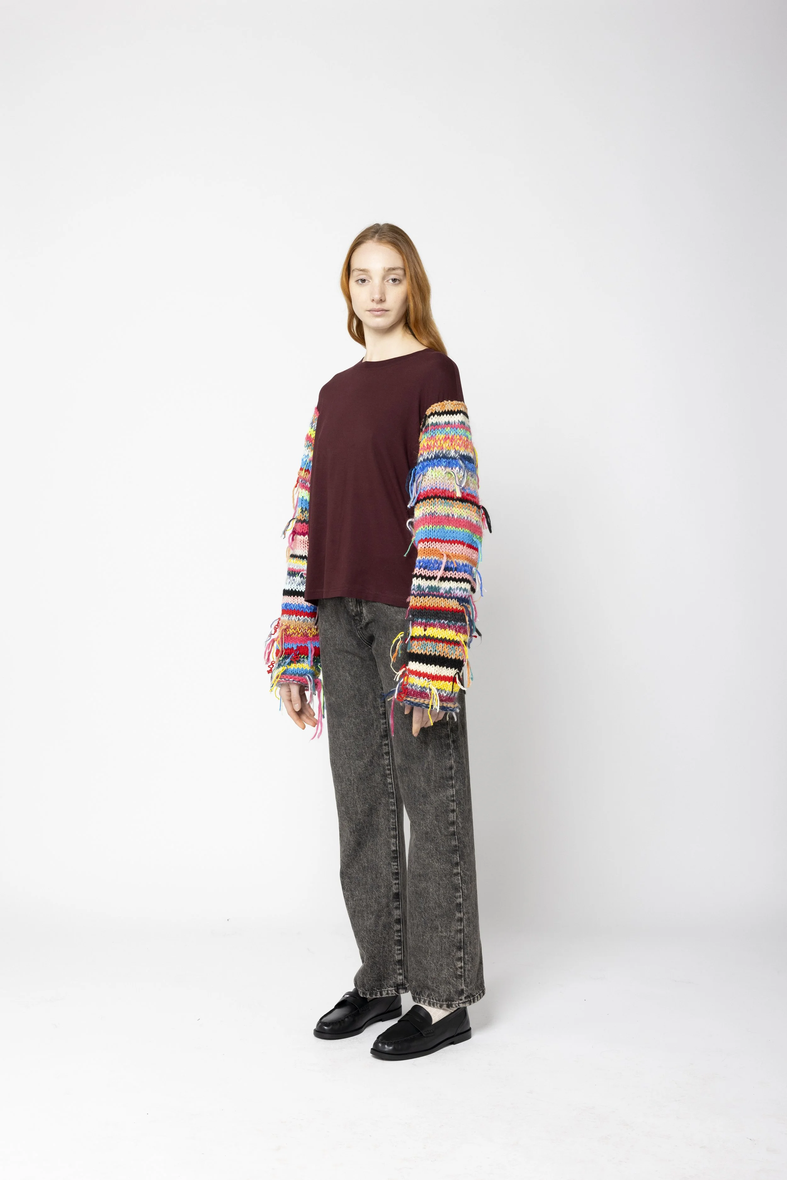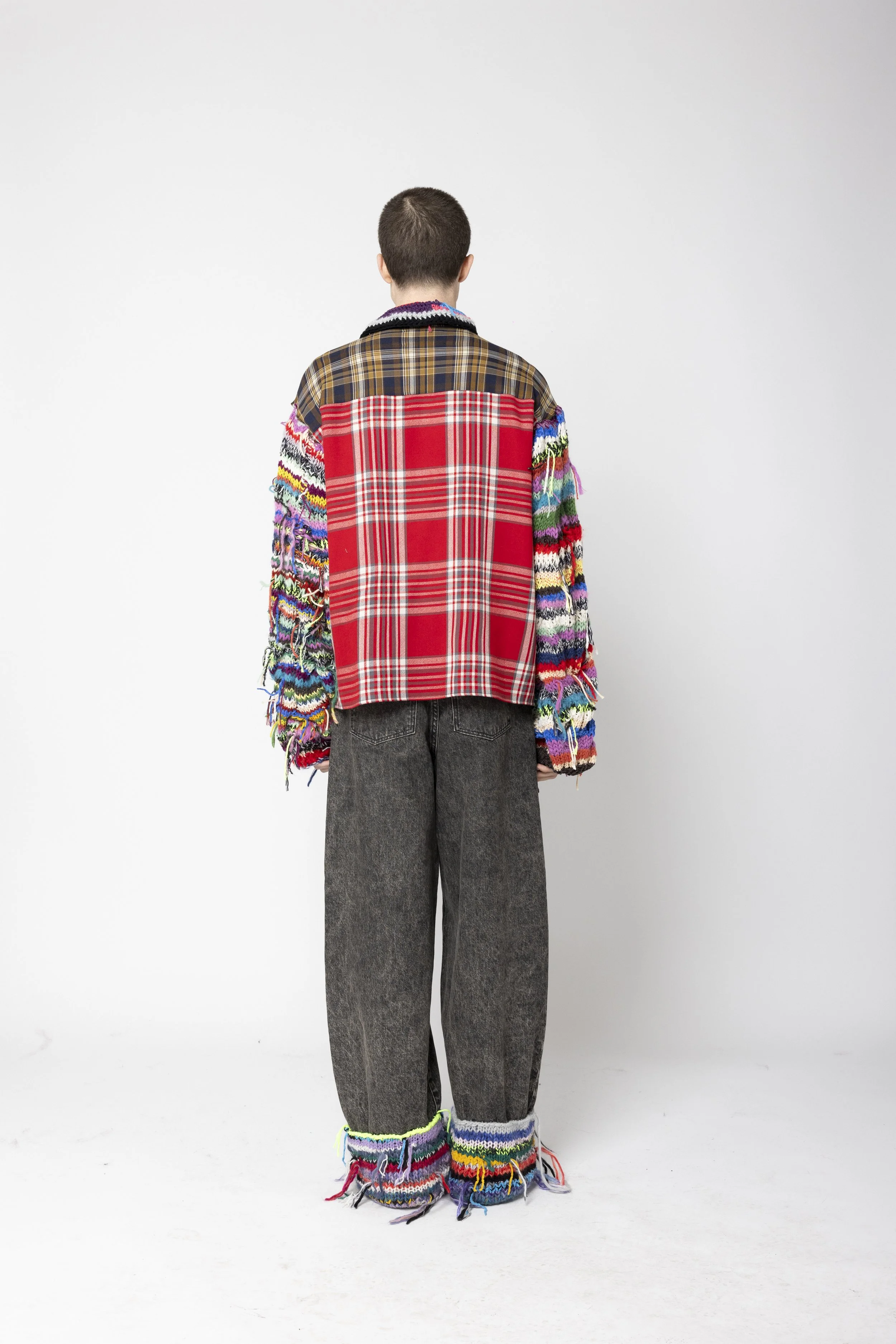 All the knitwear is handmade, the knot is the way we assemble the excess of the yarns we upcycled for creating multicolor patterns. The patchwork items are hand assembled with upcycled vintage clothes, and all the embroidery details in the collection are hand made crochet.