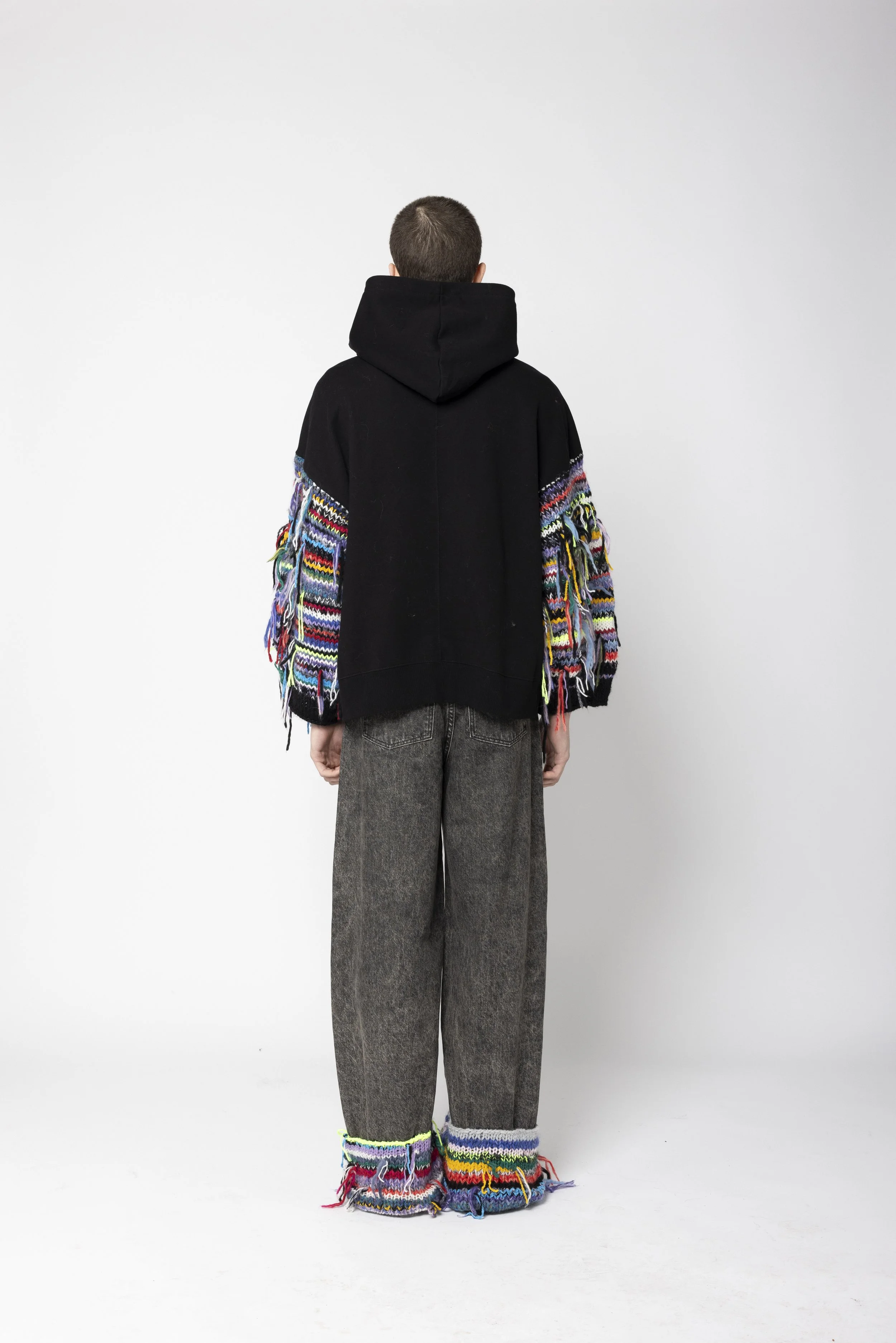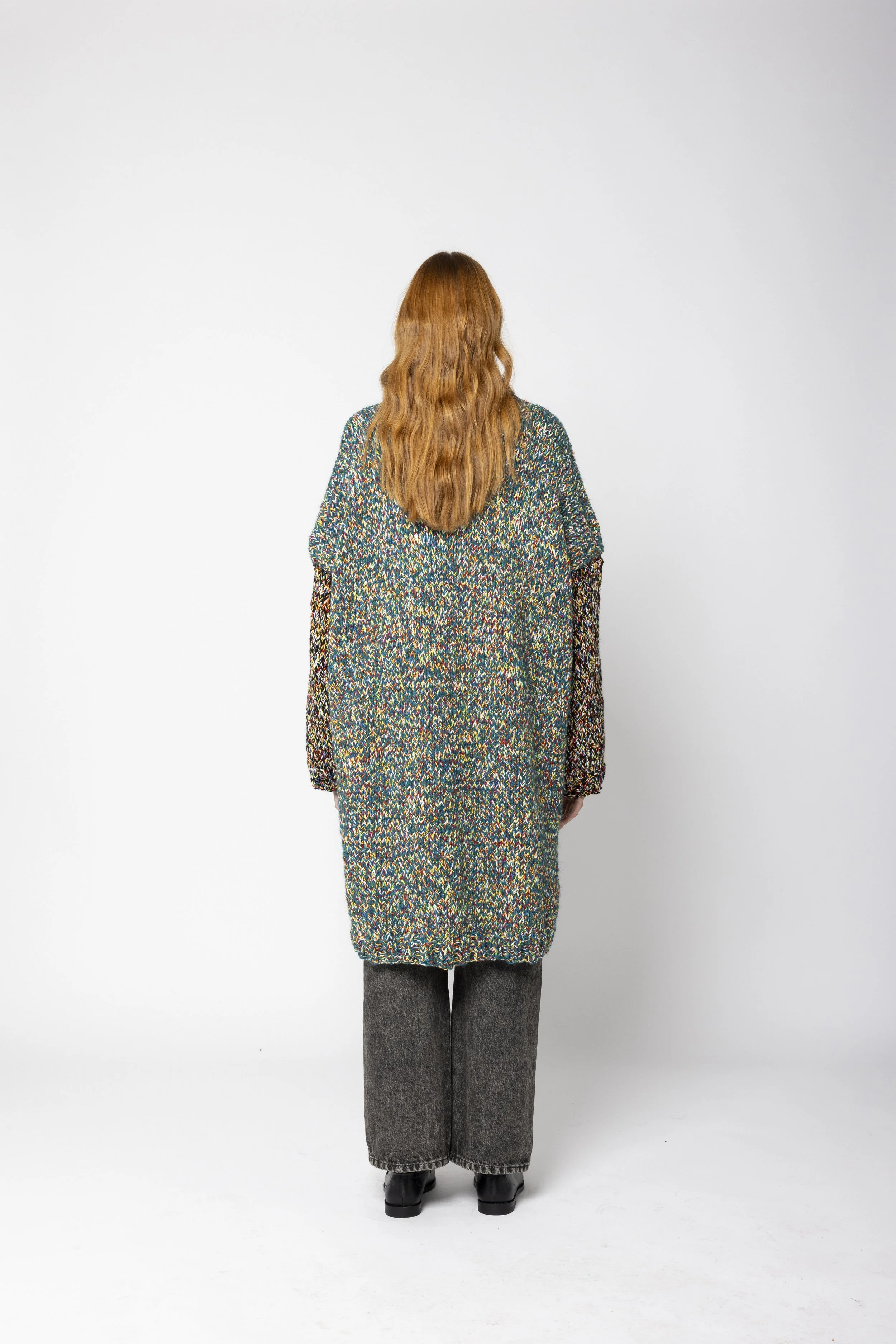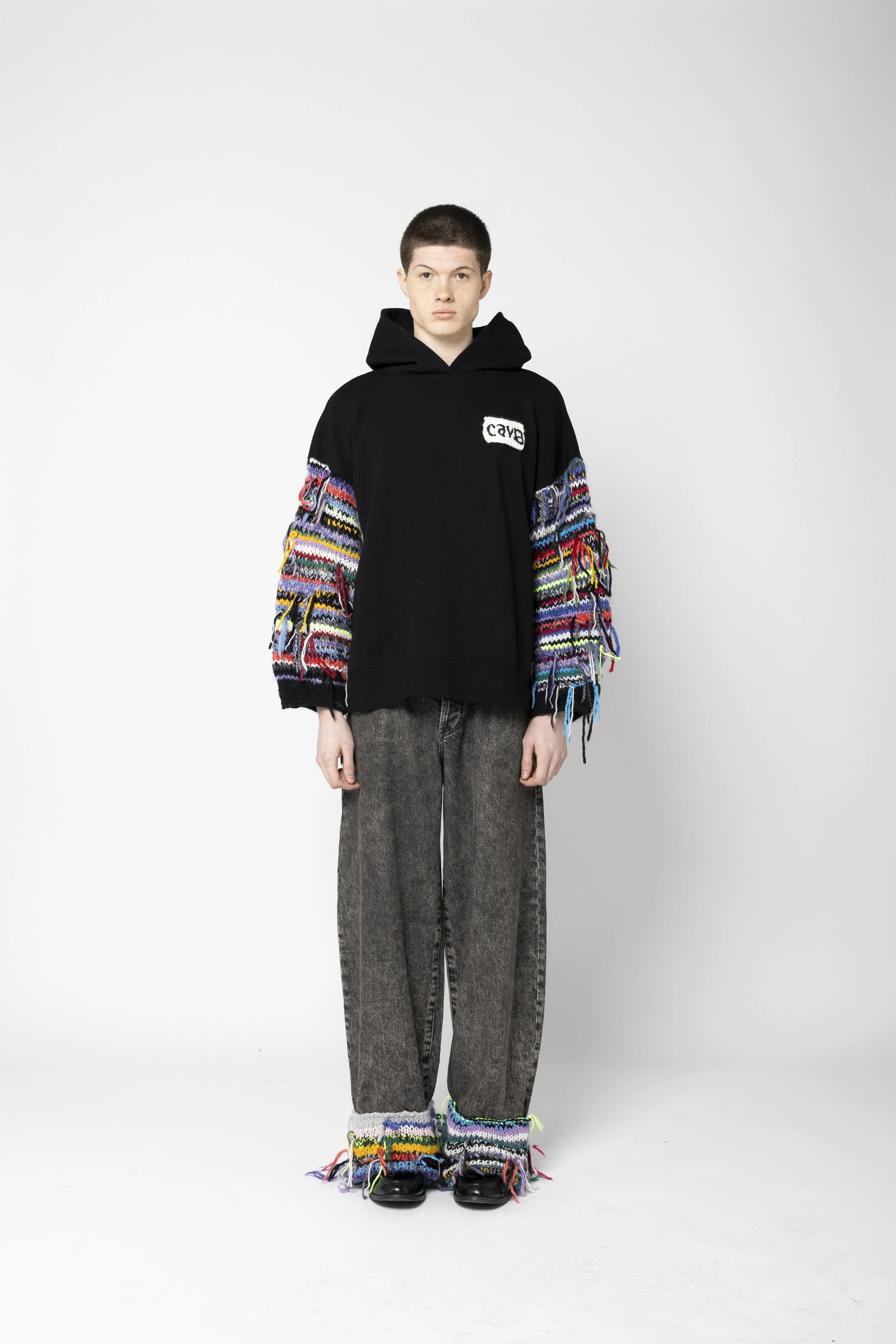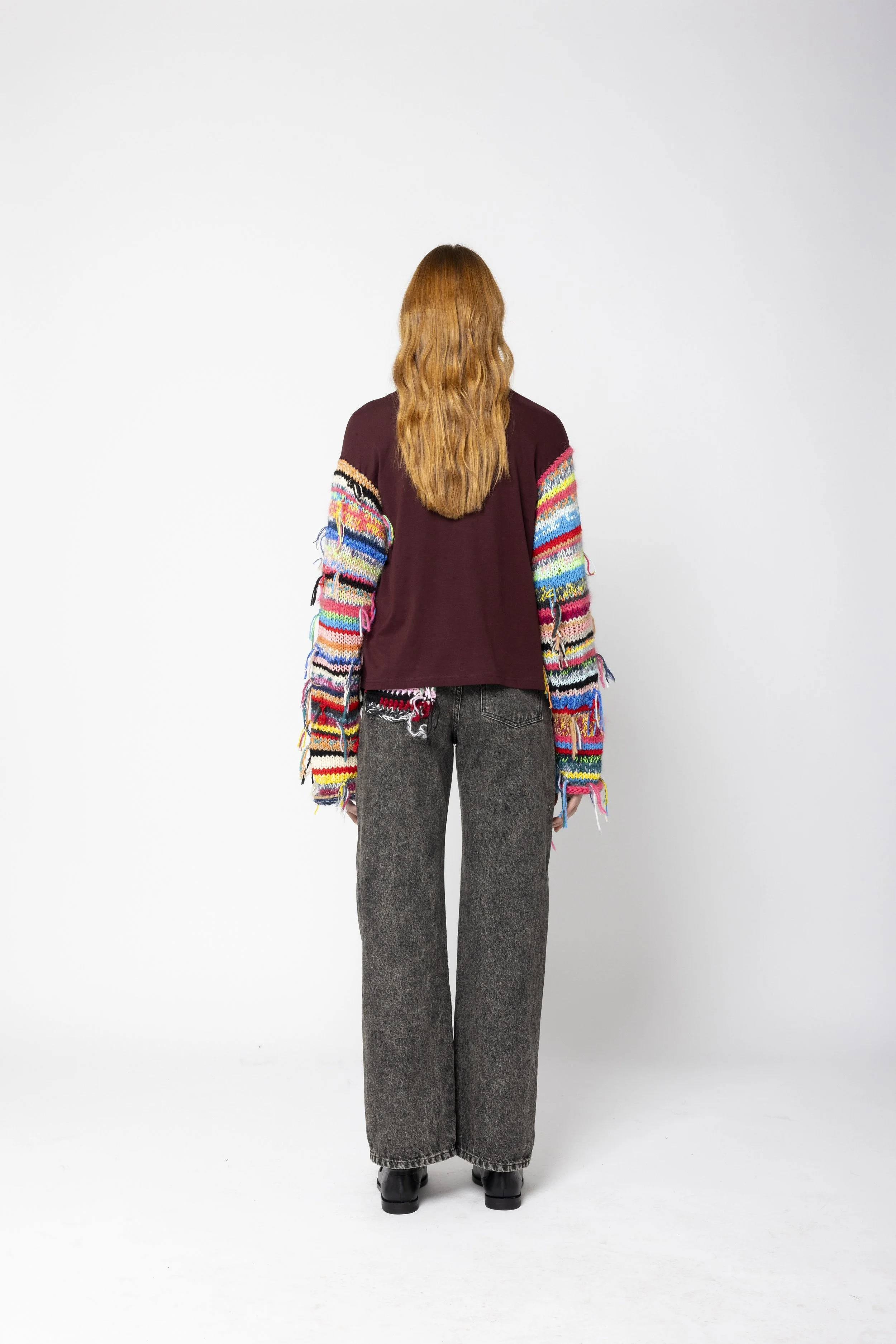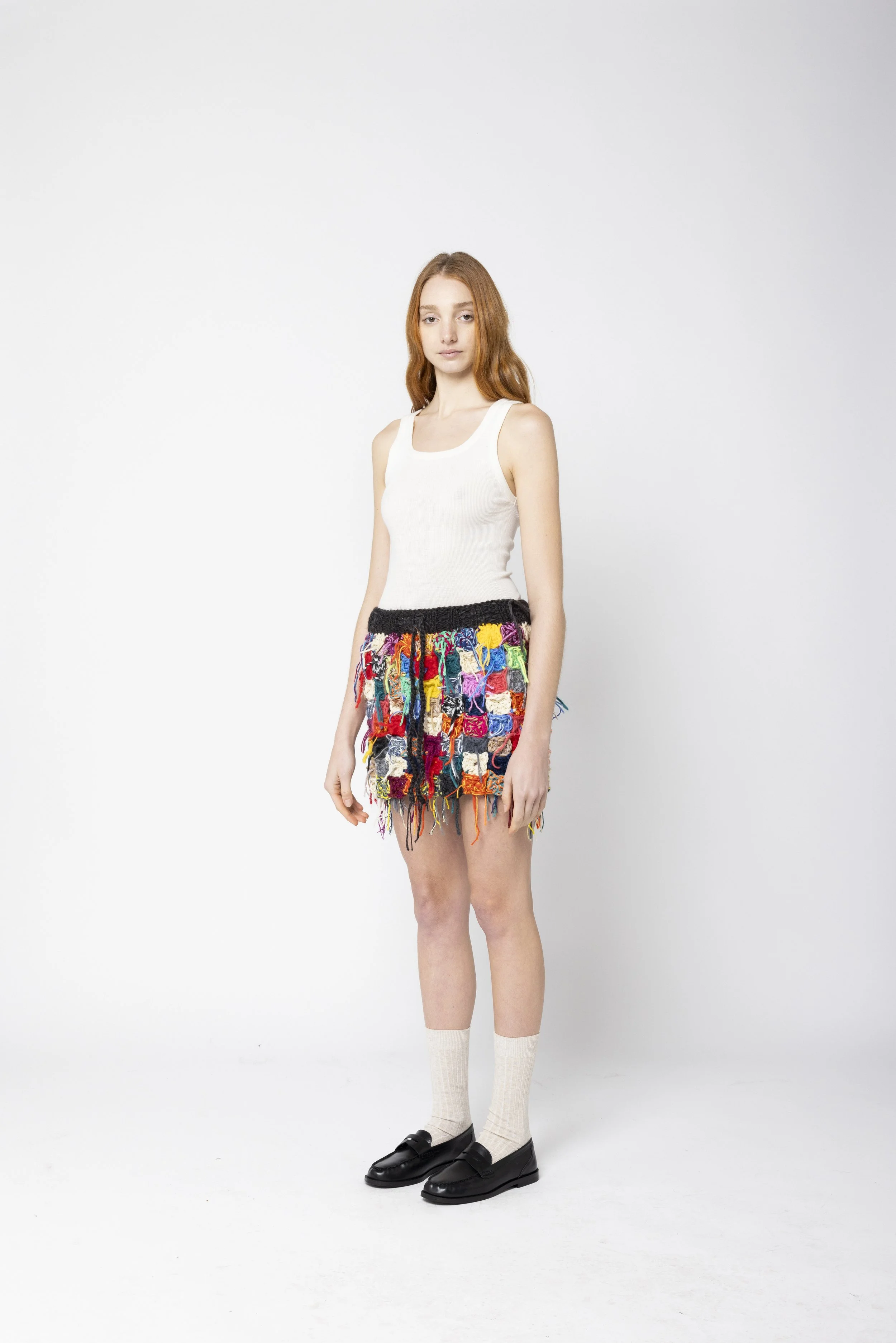 All the knitwear is handmade, the knot is the way we assemble the excess of the yarns we upcycled for creating multicolor patterns. The patchwork items are hand assembled with upcycled vintage clothes, and all the embroidery details in the collection are hand made crochet.