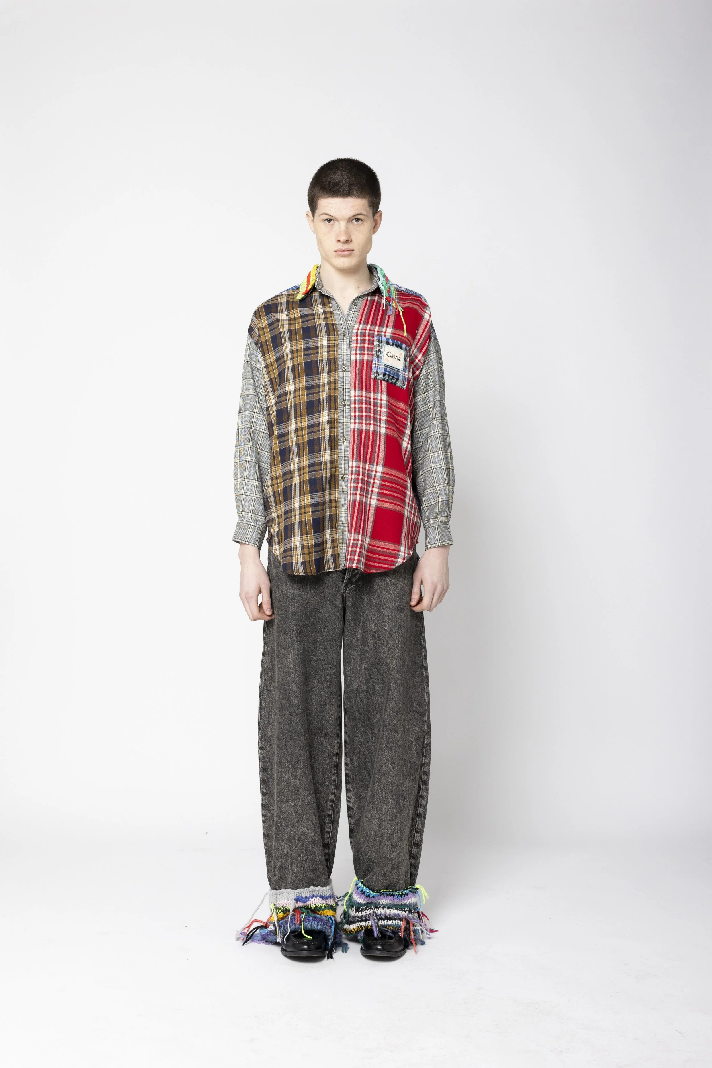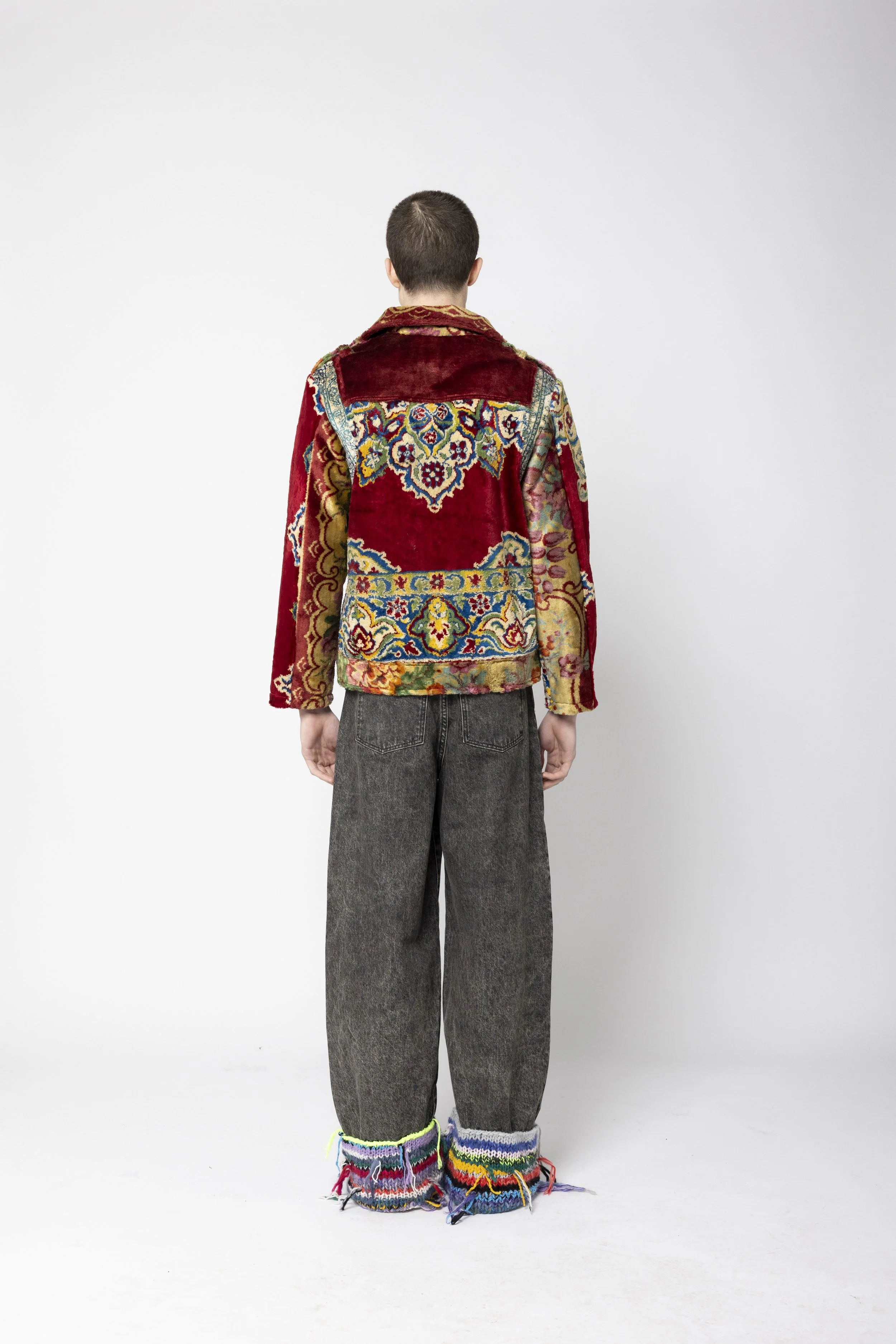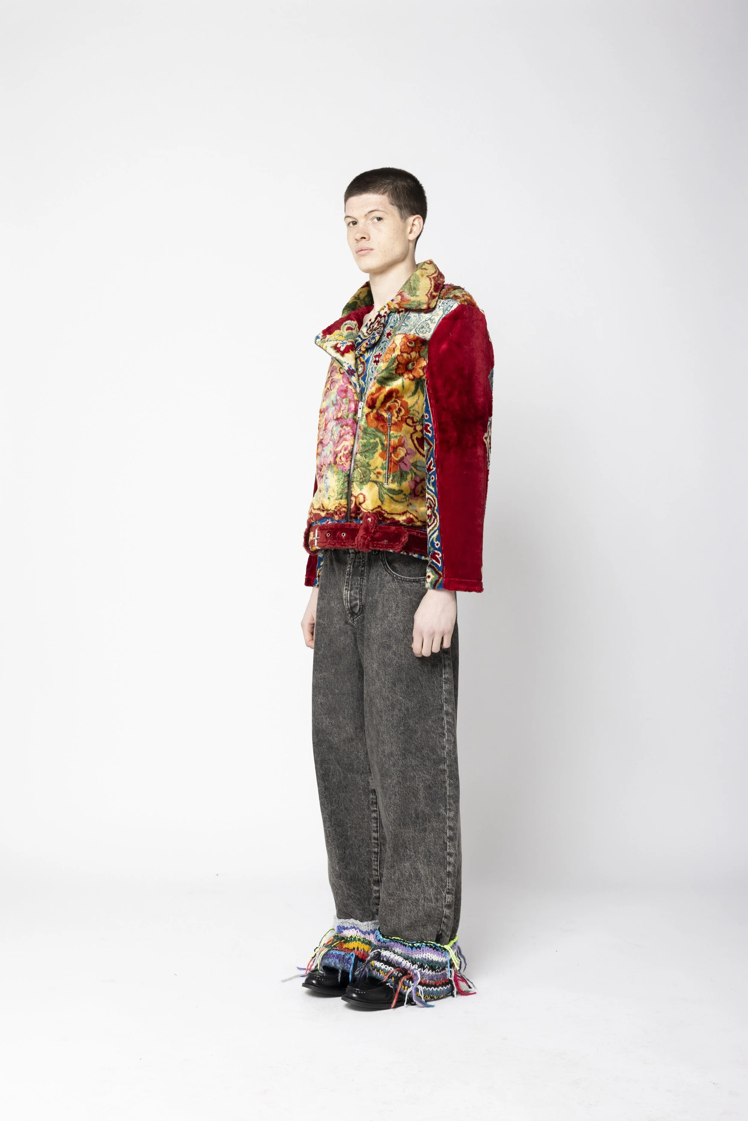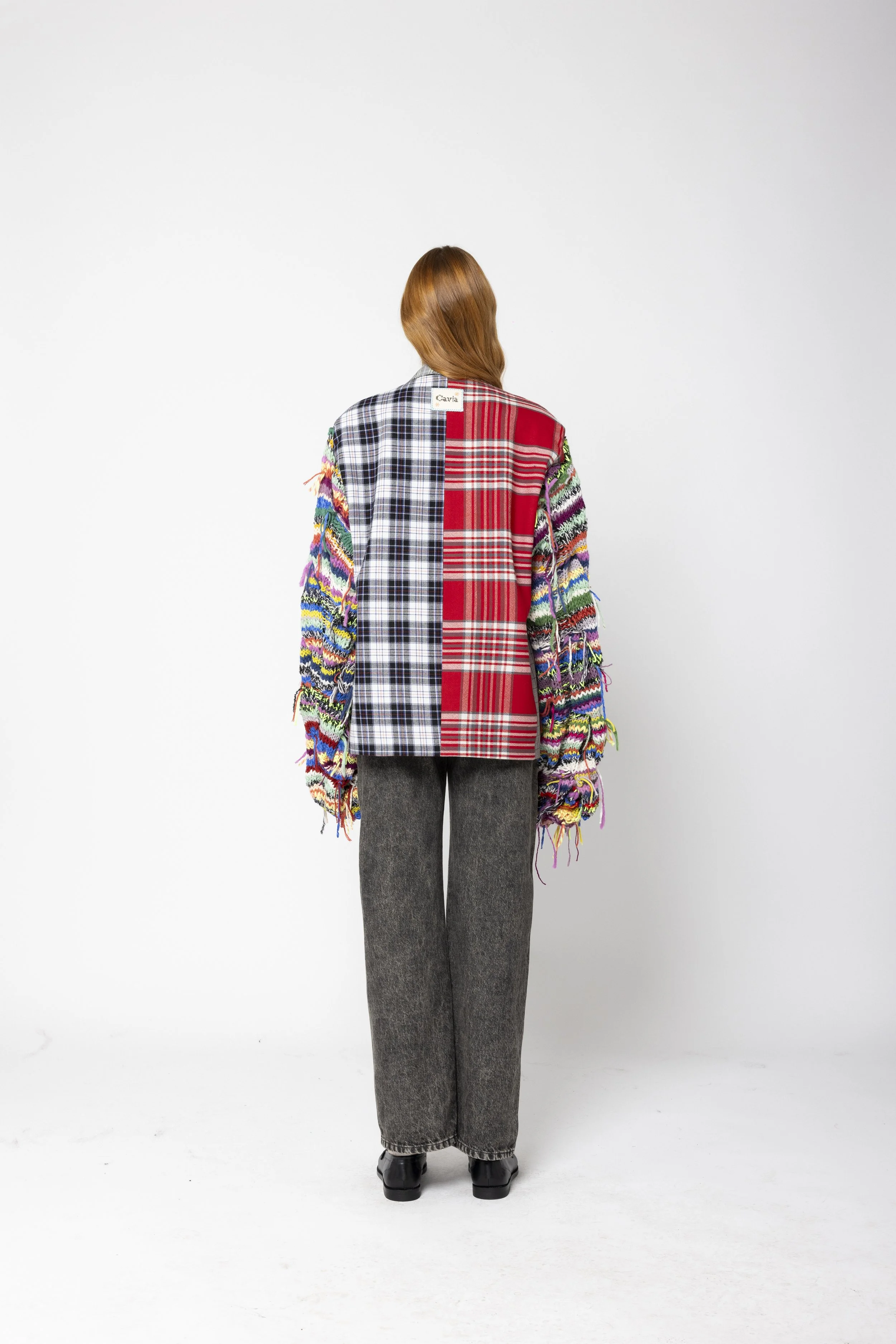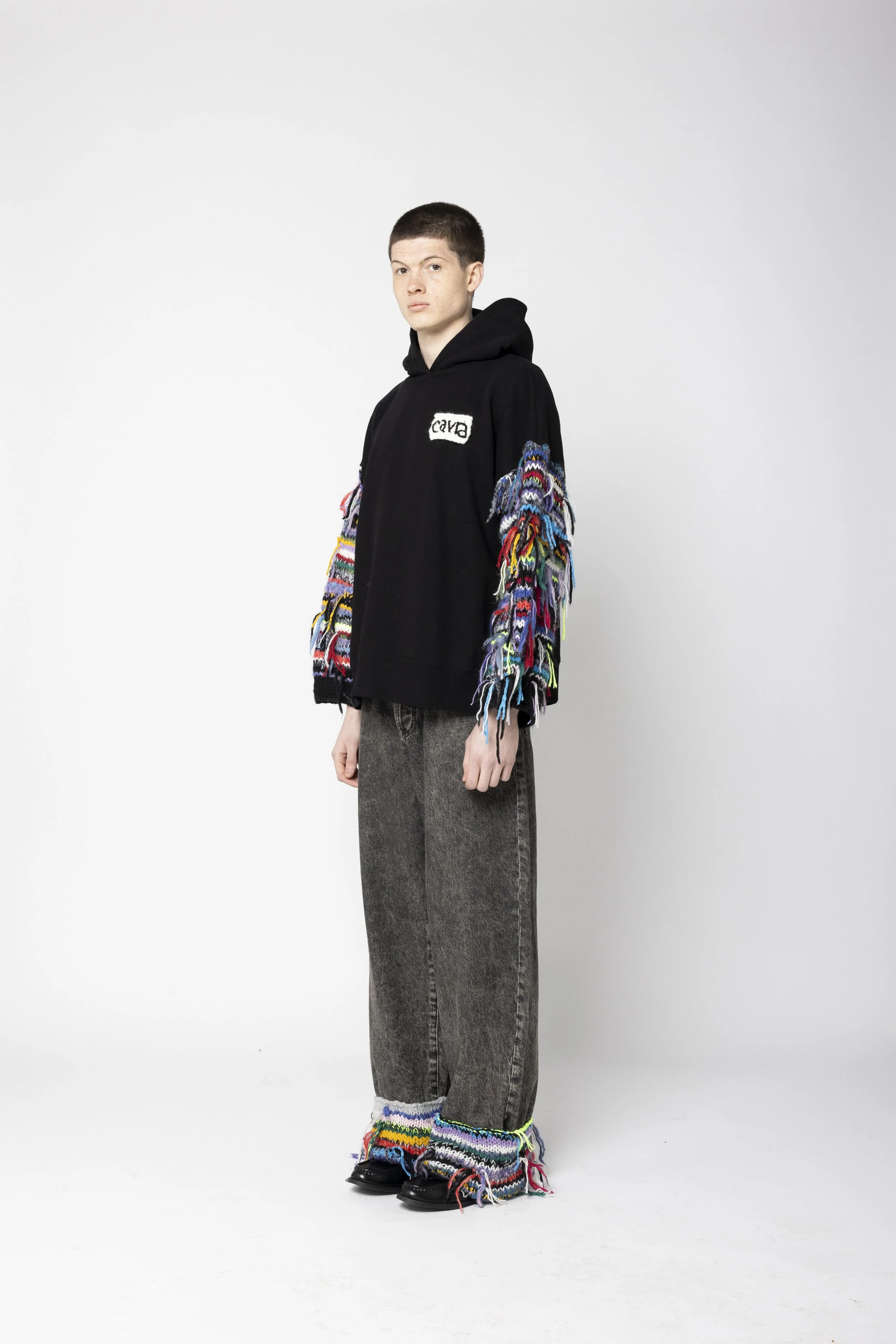 All the knitwear is handmade, the knot is the way we assemble the excess of the yarns we upcycled for creating multicolor patterns. The patchwork items are hand assembled with upcycled vintage clothes, and all the embroidery details in the collection are hand made crochet.