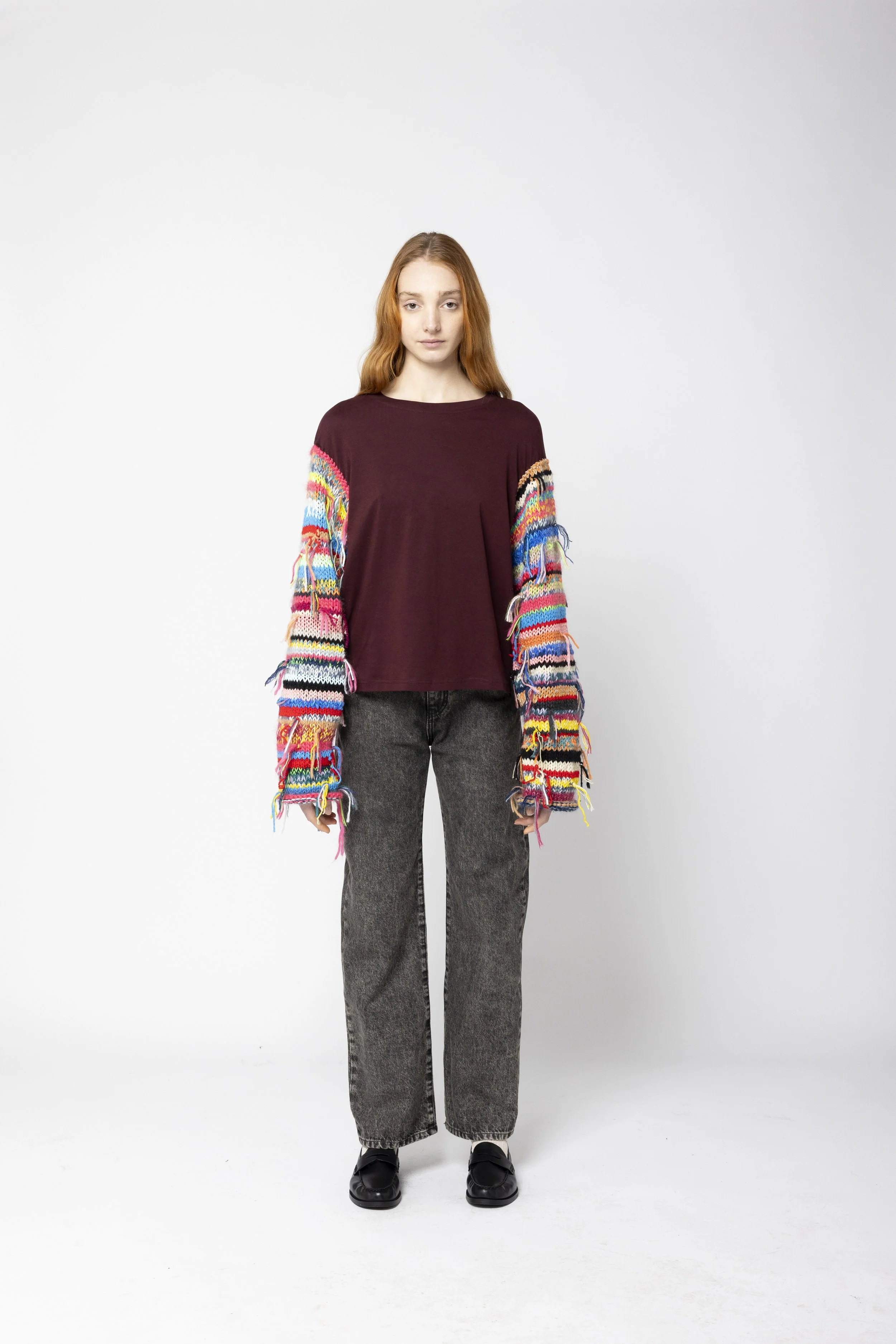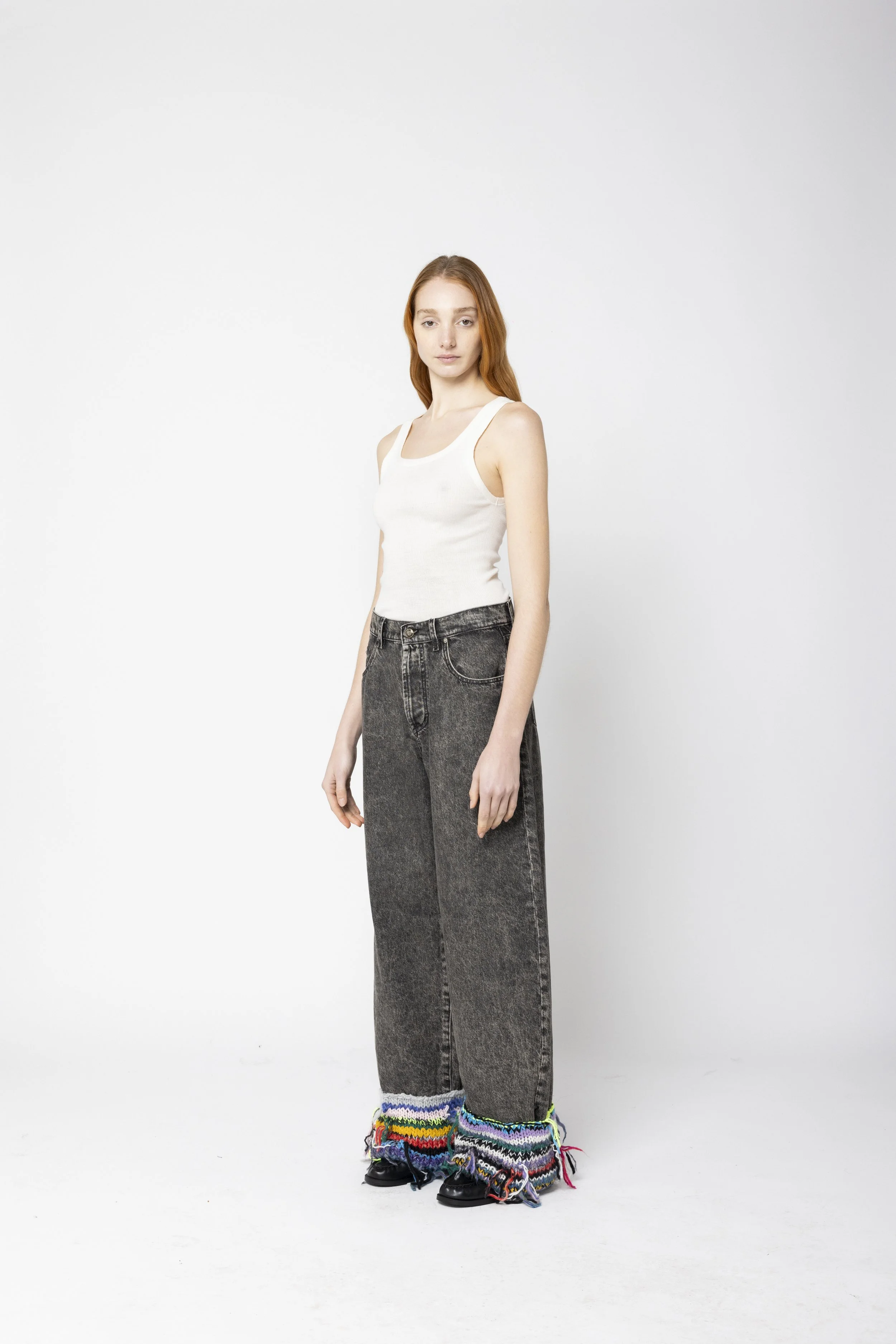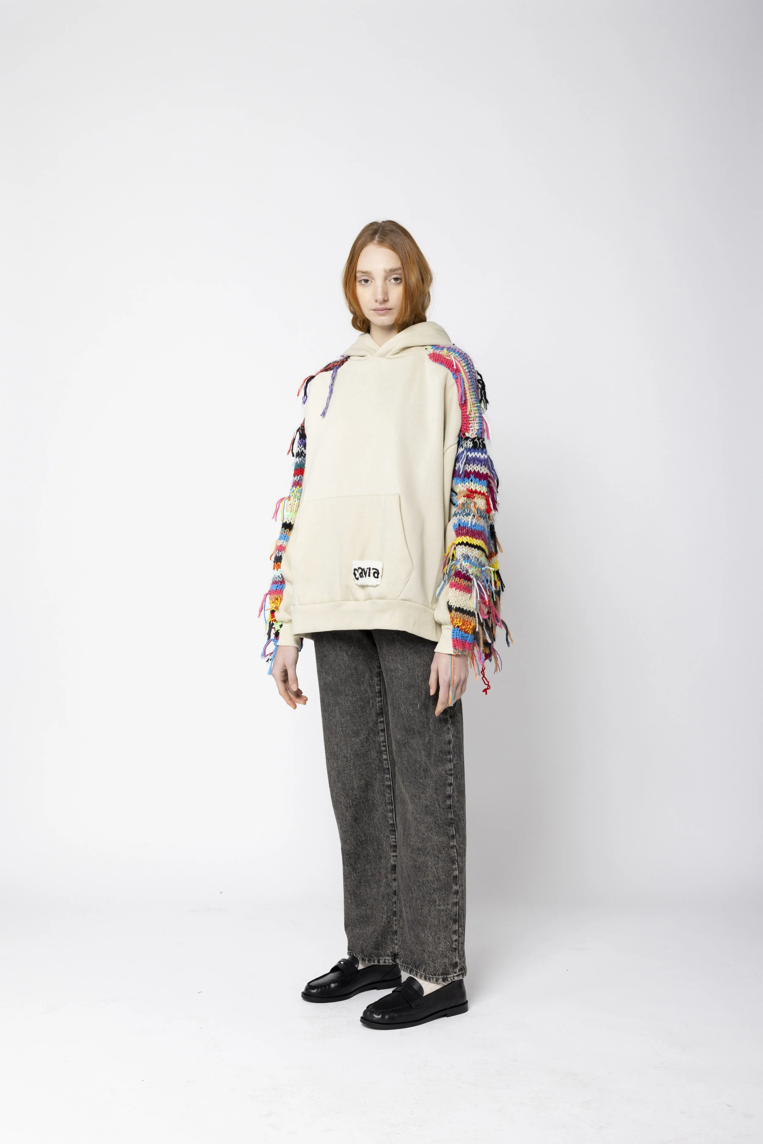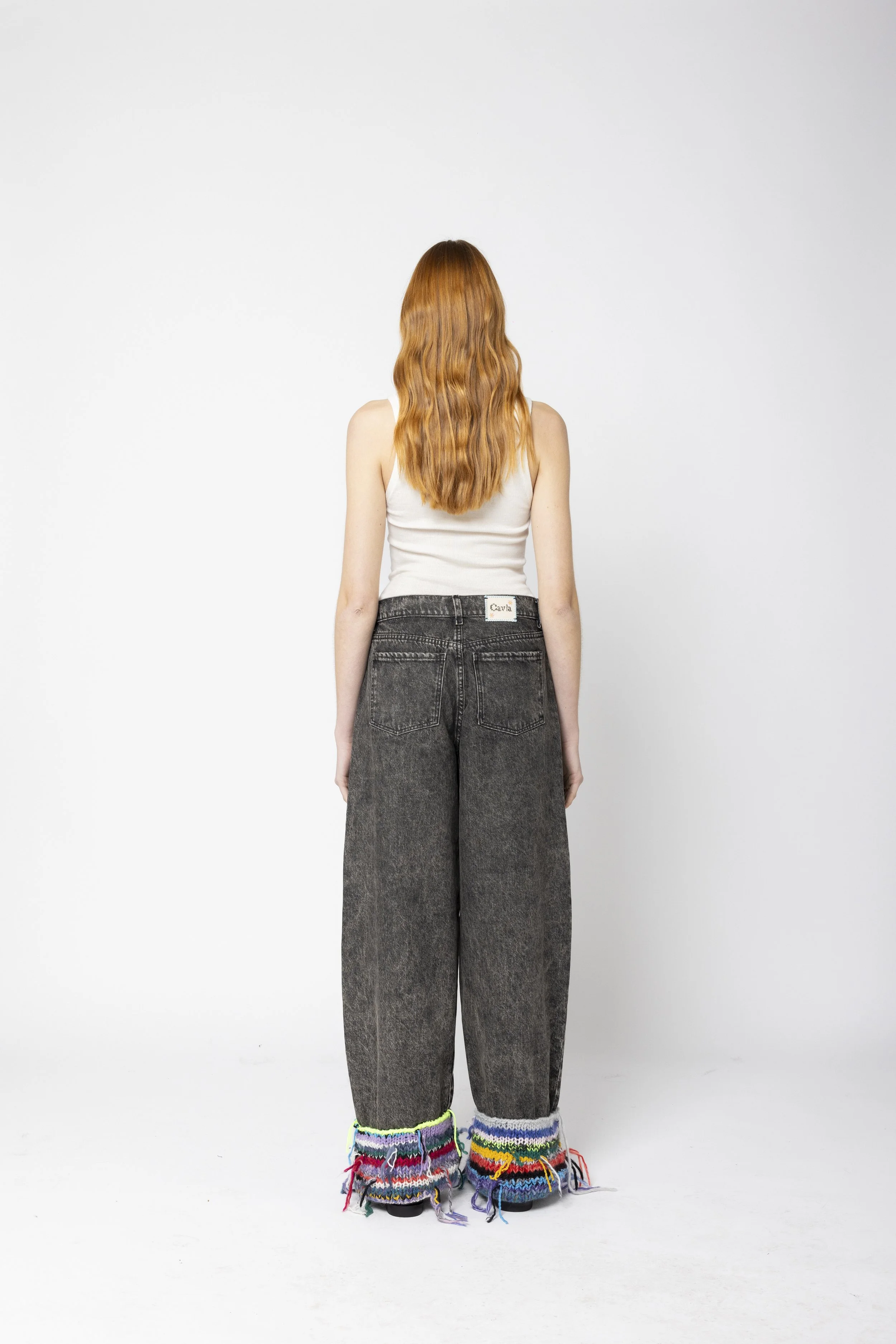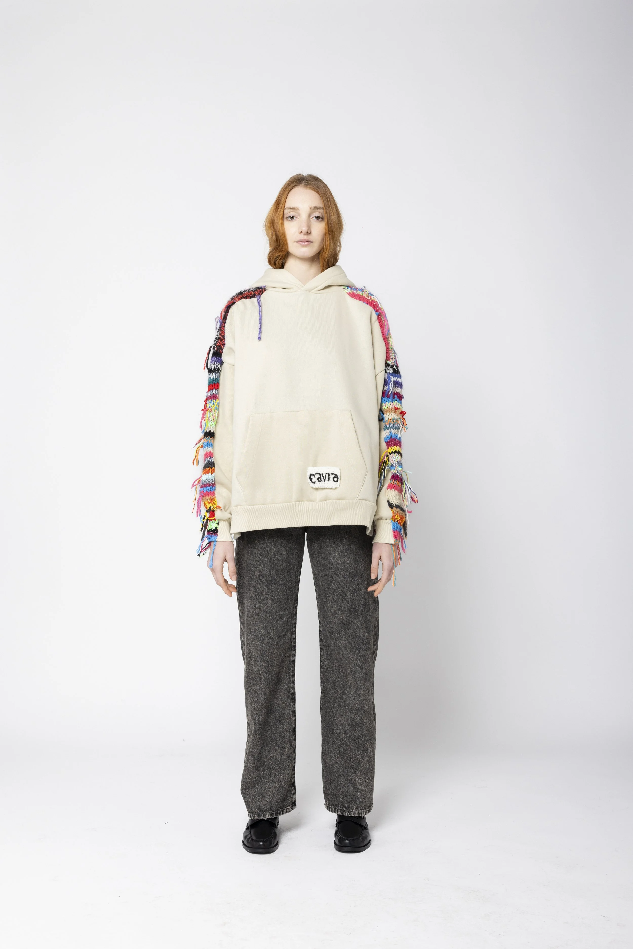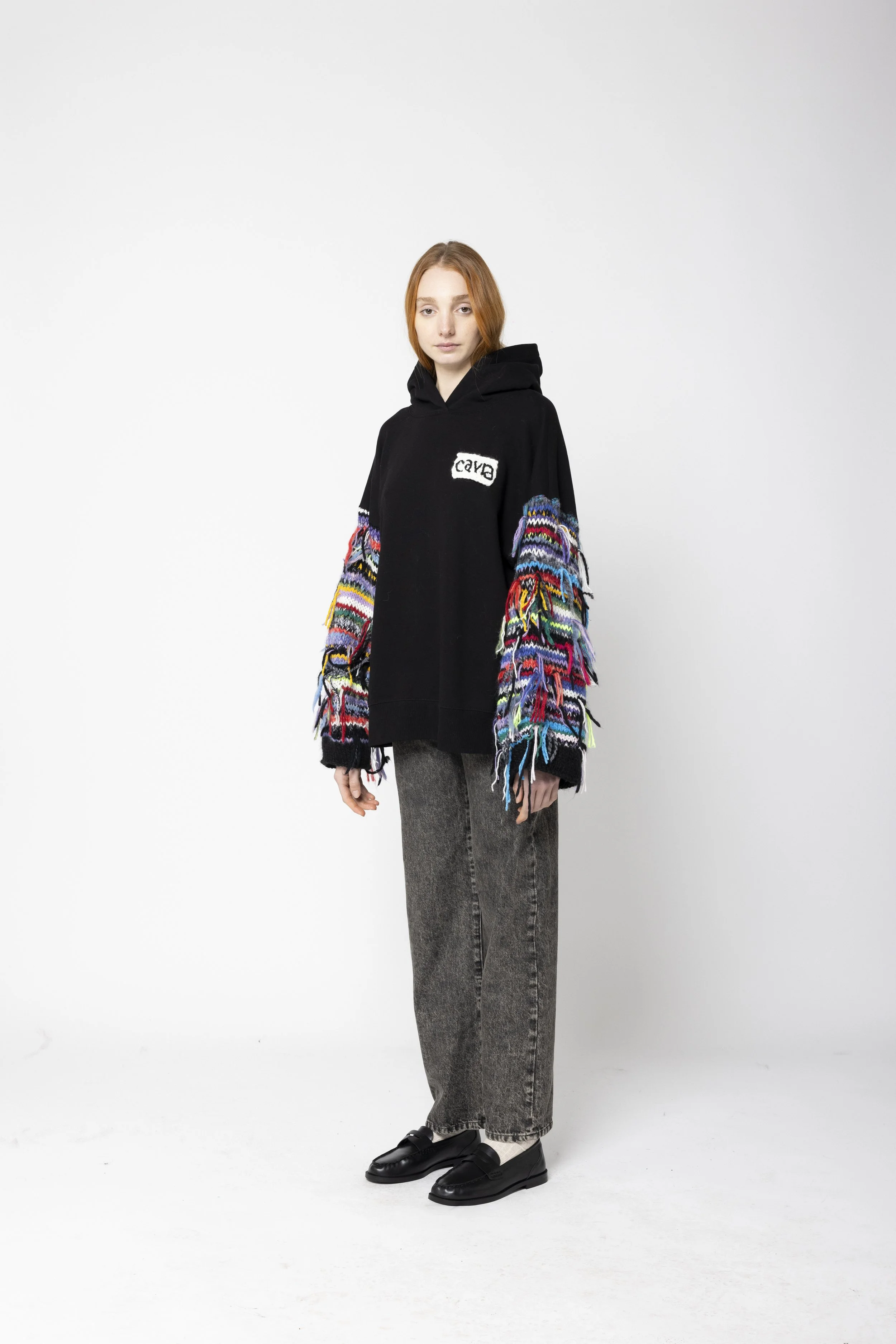 All the knitwear is handmade, the knot is the way we assemble the excess of the yarns we upcycled for creating multicolor patterns. The patchwork items are hand assembled with upcycled vintage clothes, and all the embroidery details in the collection are hand made crochet.