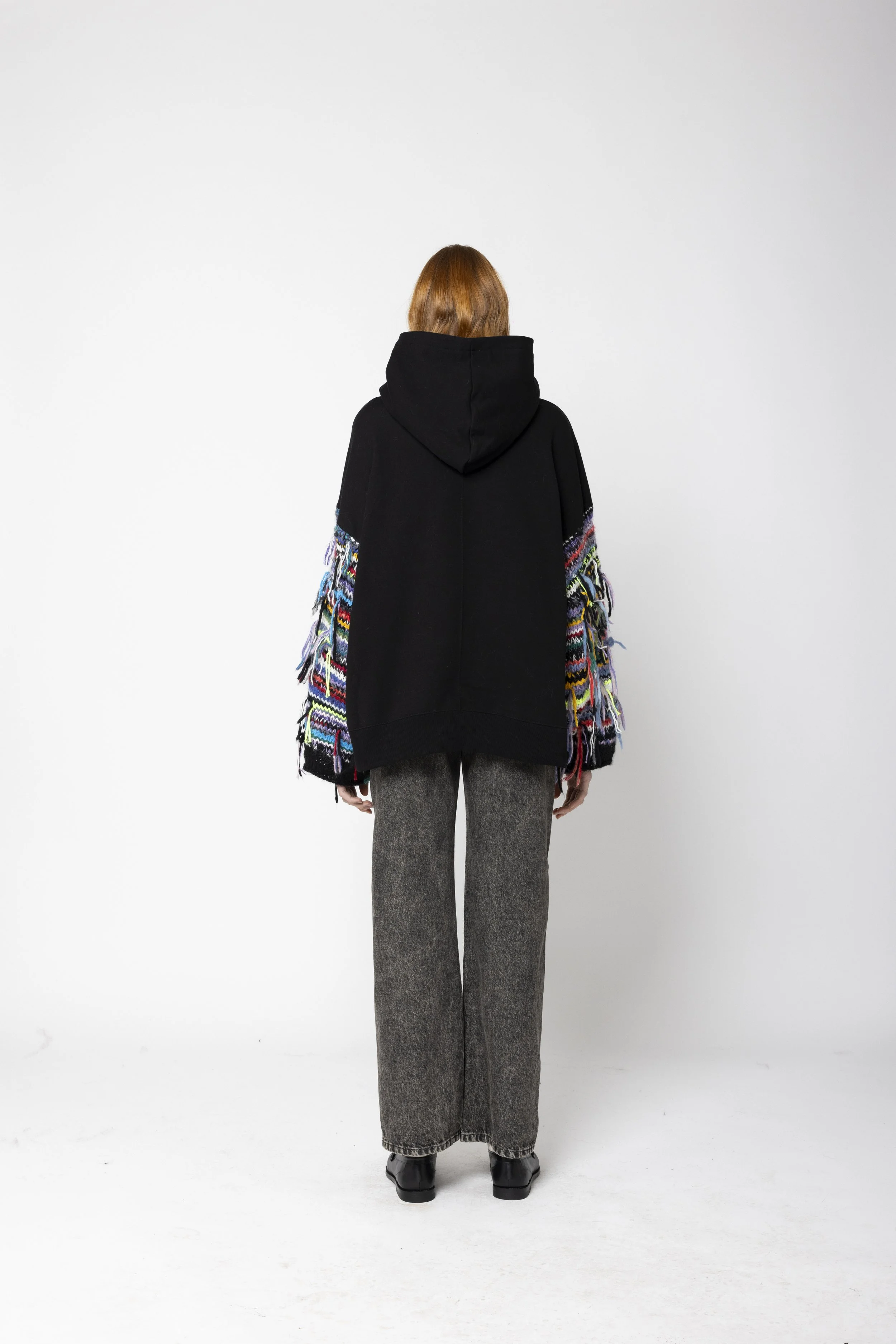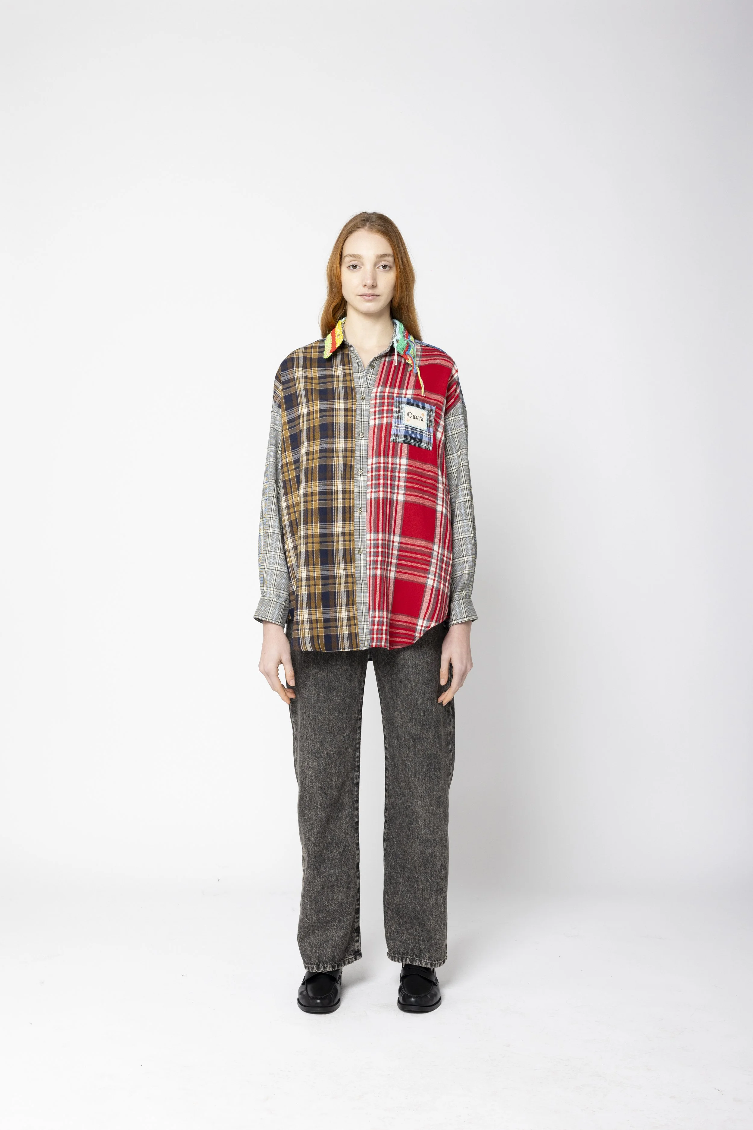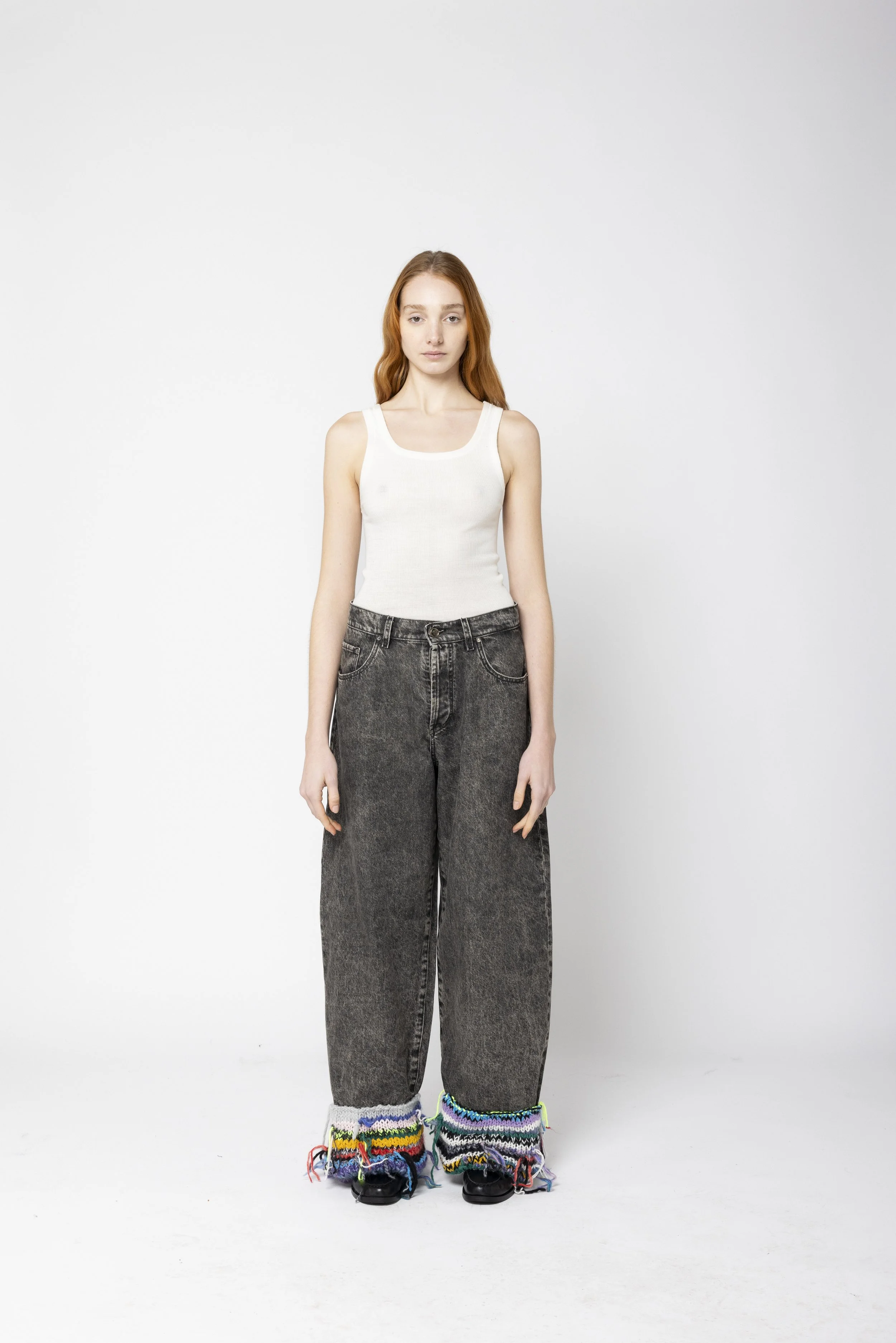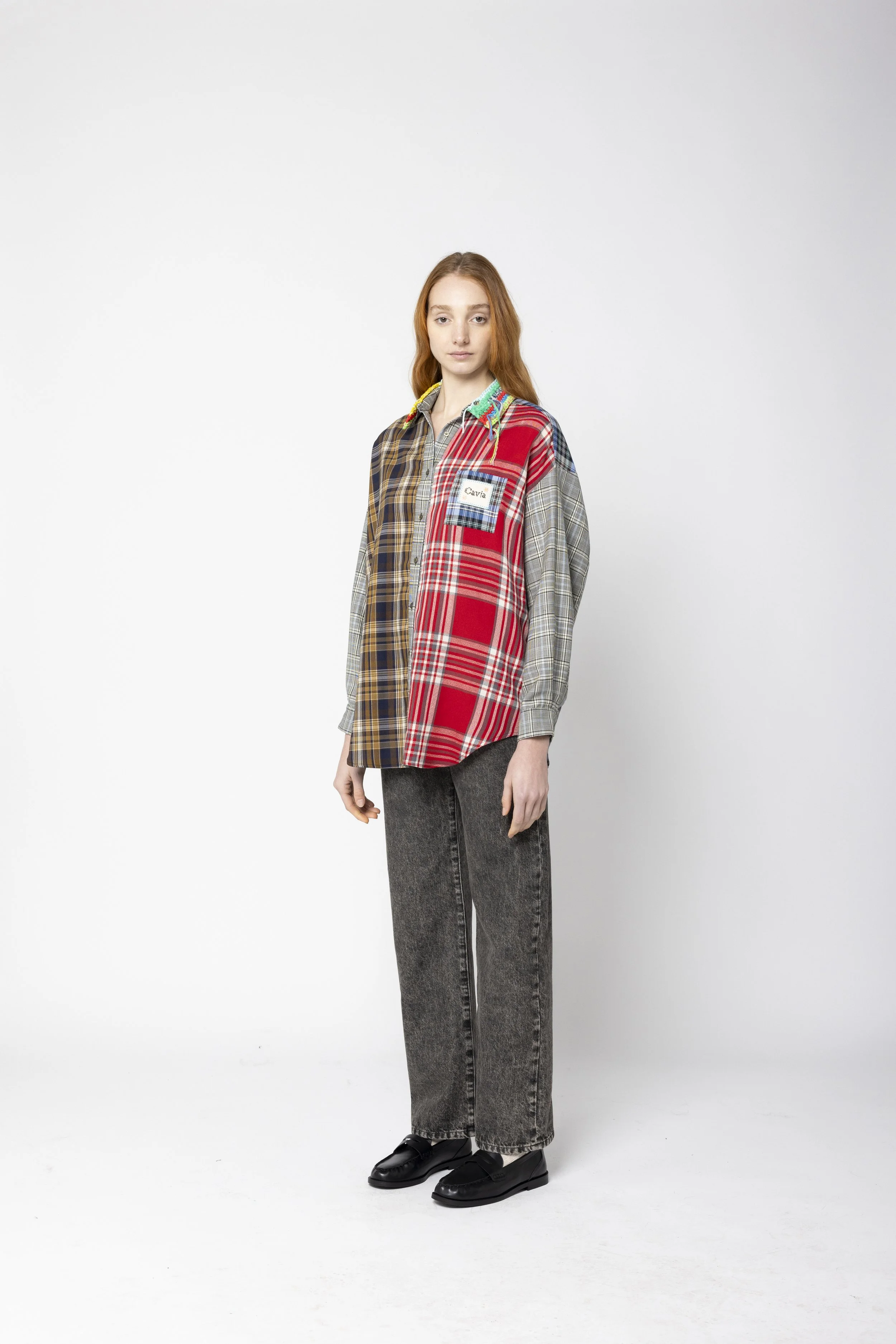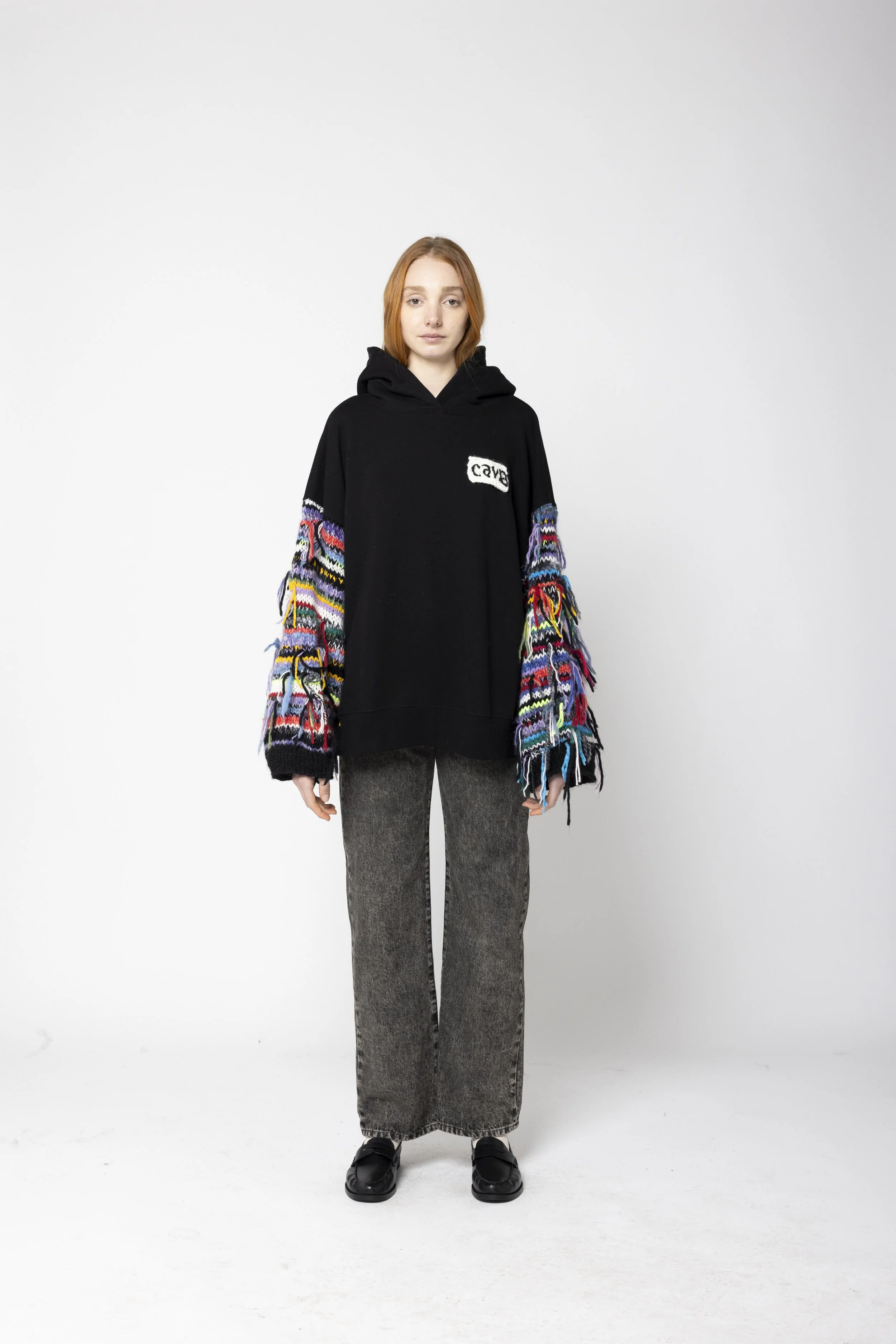 All the knitwear is handmade, the knot is the way we assemble the excess of the yarns we upcycled for creating multicolor patterns. The patchwork items are hand assembled with upcycled vintage clothes, and all the embroidery details in the collection are hand made crochet.